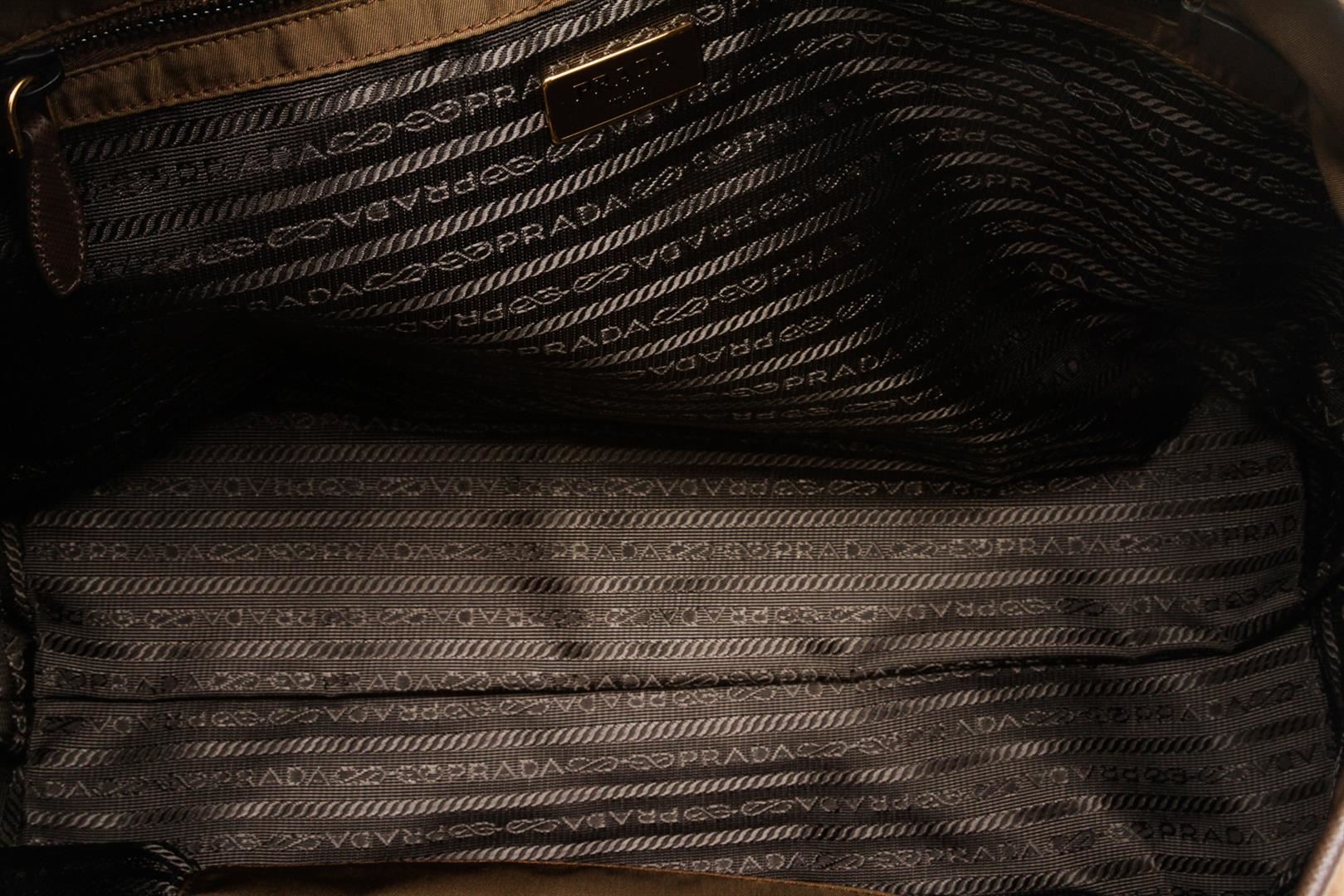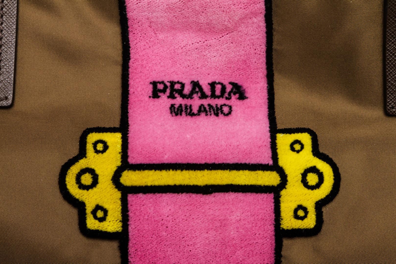 One Prada Brown Nylon Leather Ricamo Tote Bag. Brown Tessuto nylon Prada Ricamo tote with gold-tone hardware, tonal Saffiano leather trim, dual flat shoulder straps, pink and multicolor velvet panels at exterior, tonal jacquard woven lining, dual pockets at interior wall; one with zip closure and magnetic closure at top. MKR