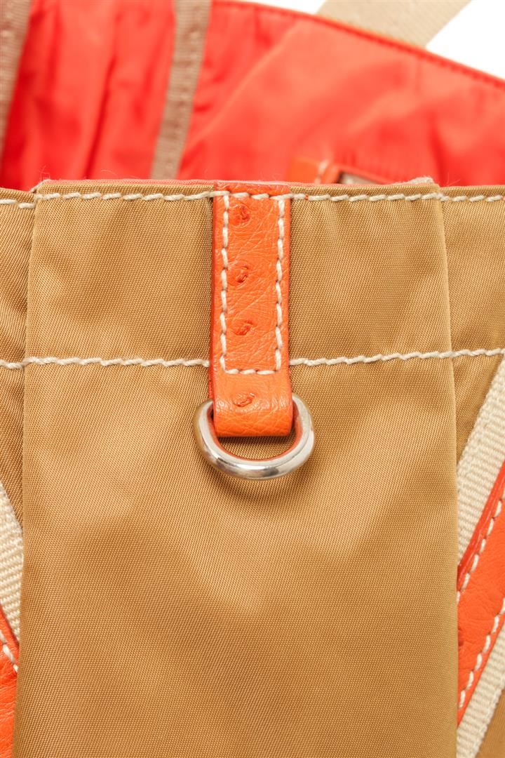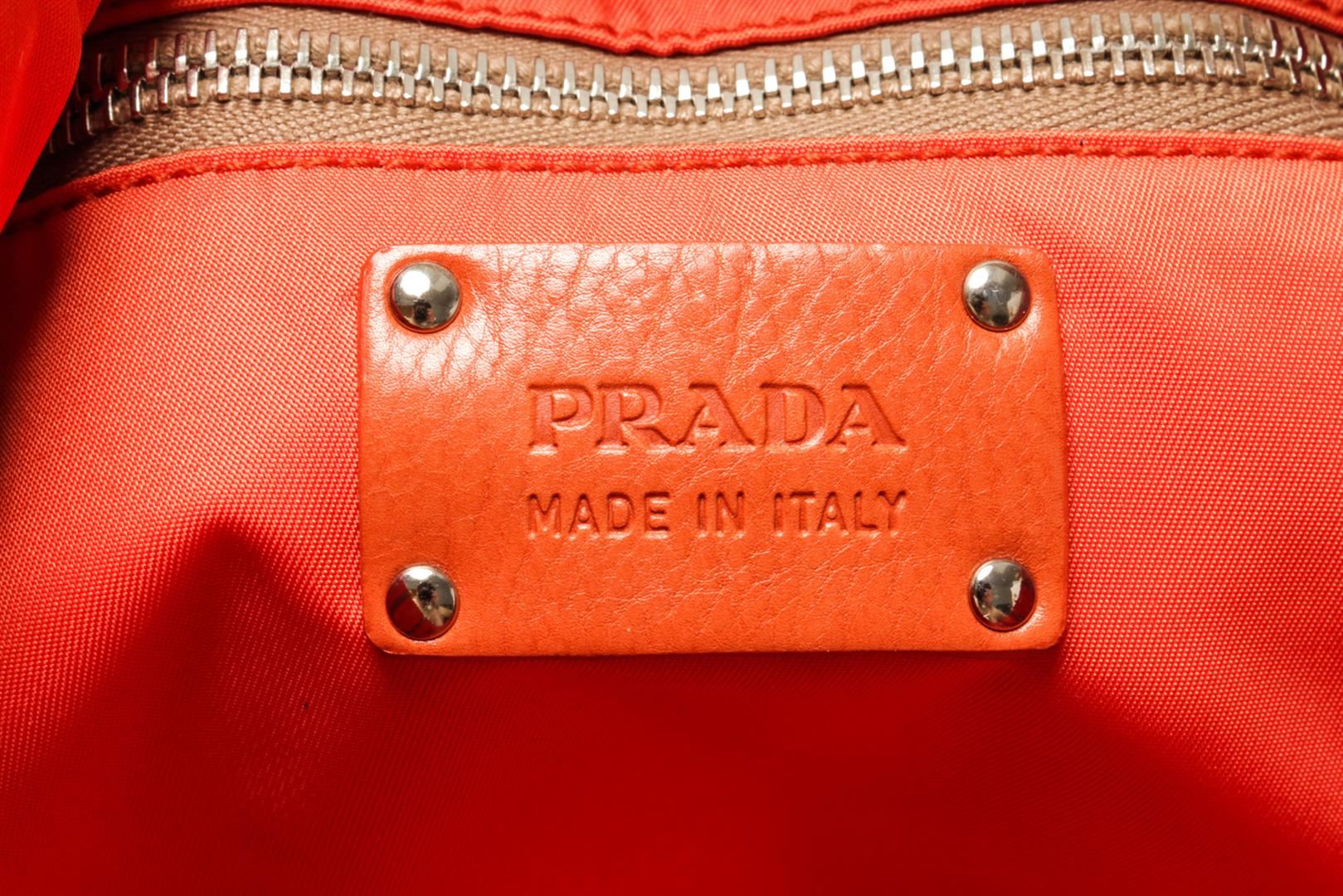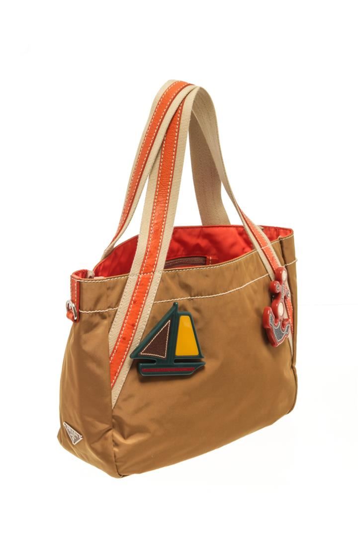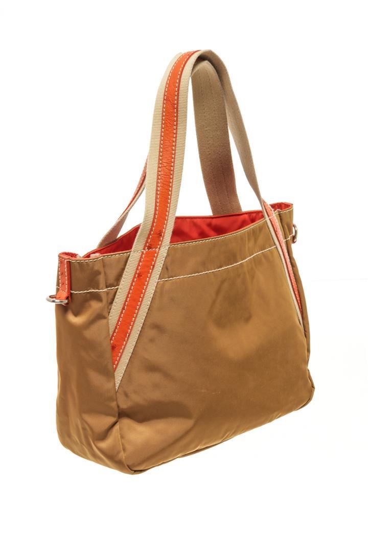 One Prada Brown Nylon Tote Bag. Item is sold AS-IS. All available information is listed in the description and shown in the photo. Prada Brown Nylon Tote Bag with a canvas shoulder strap, patches on the front of the bag, red nylon lining, interior zipper pocket, silver hardware. W 8.8" x H 7.2" x D 3" / 22.35 x 18.28 x 7.62 CM
