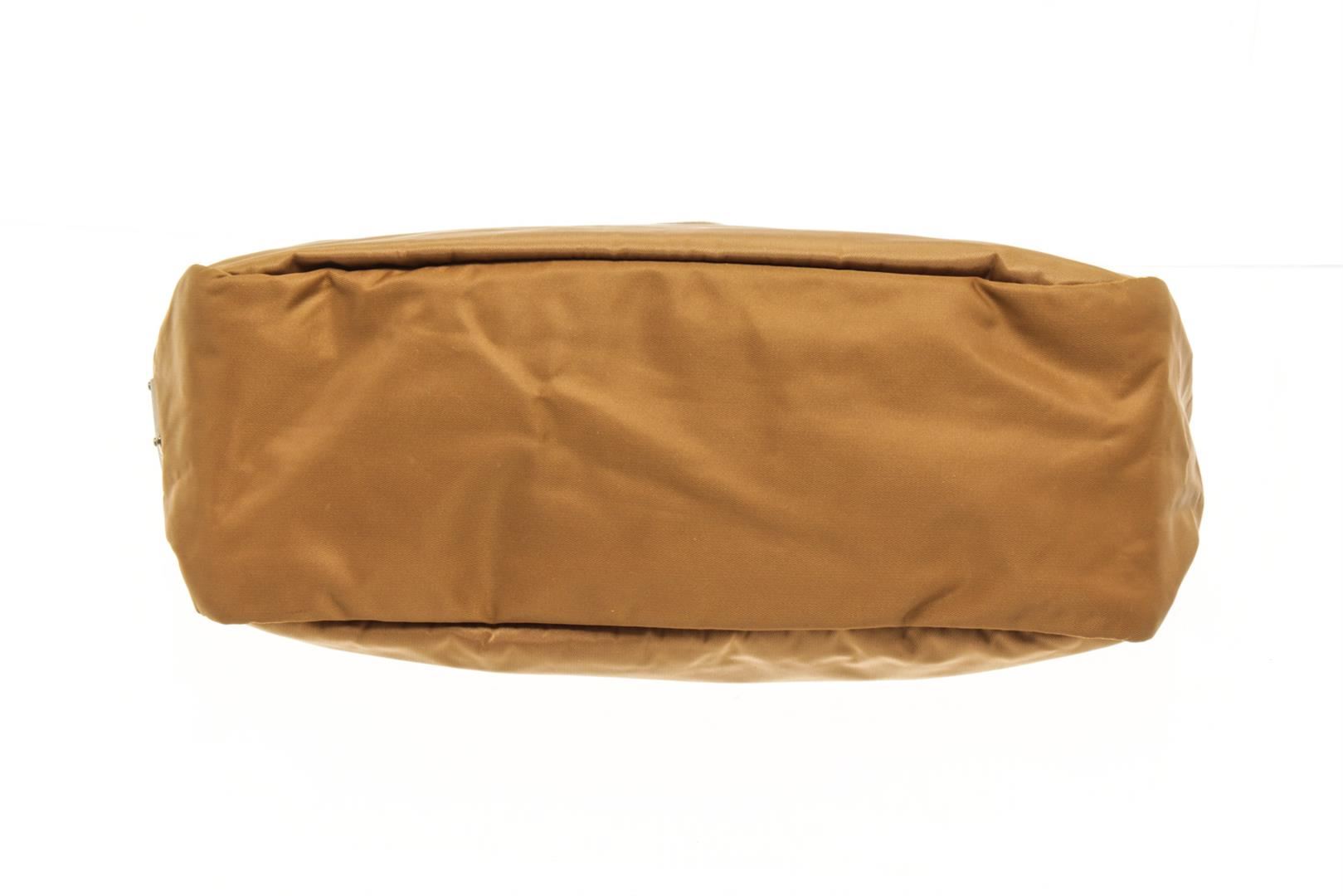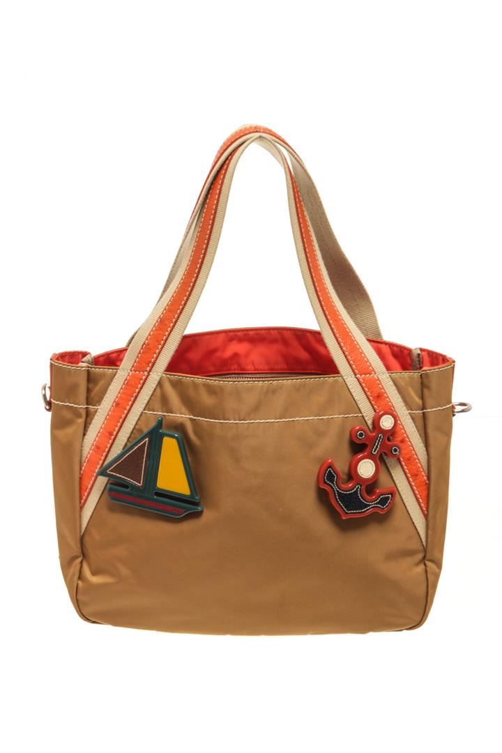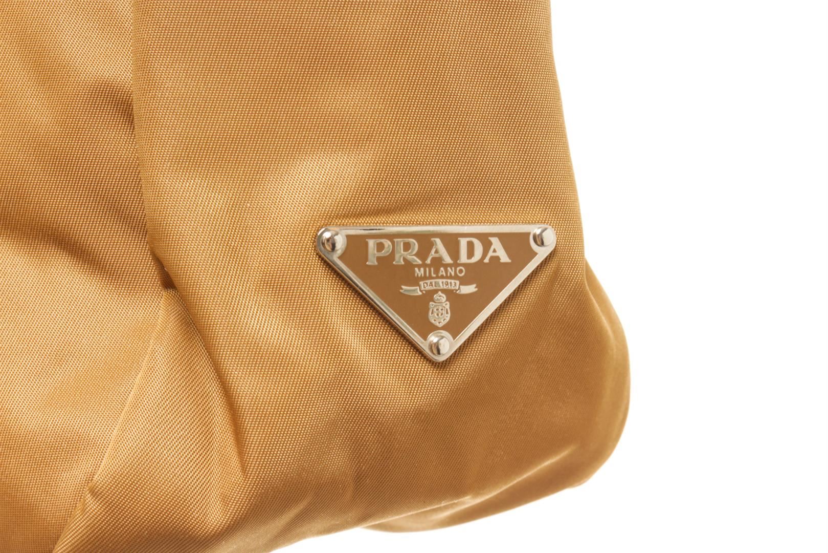 One Prada Brown Nylon Tote Bag. Item is sold AS-IS. All available information is listed in the description and shown in the photo. Prada Brown Nylon Tote Bag with a canvas shoulder strap, patches on the front of the bag, red nylon lining, interior zipper pocket, silver hardware. W 8.8" x H 7.2" x D 3" / 22.35 x 18.28 x 7.62 CM