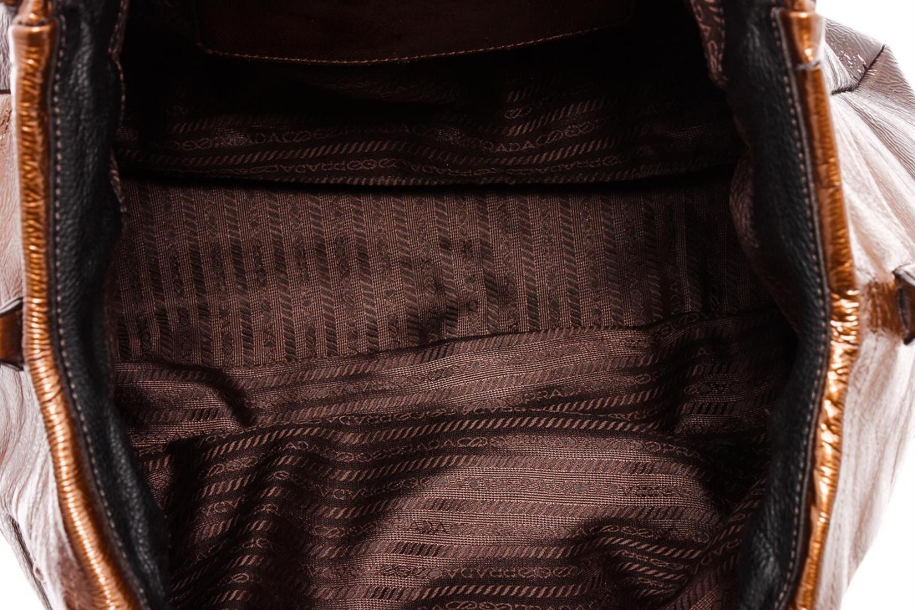 Prada brown ombre Vernice patent leather shoulder bag with silver-tone hardware, optional detachable leather shoulder strap, dual flat top handles, brown logo jacquard lining, two interior pockets; one with zip closure and overall magnetic snap closure at top.