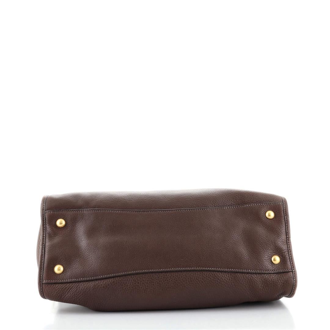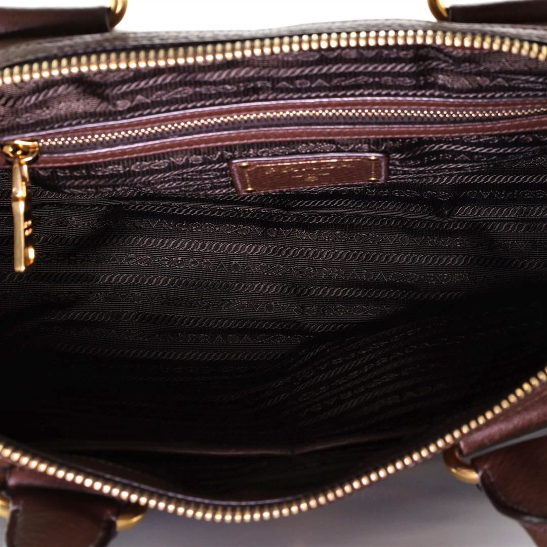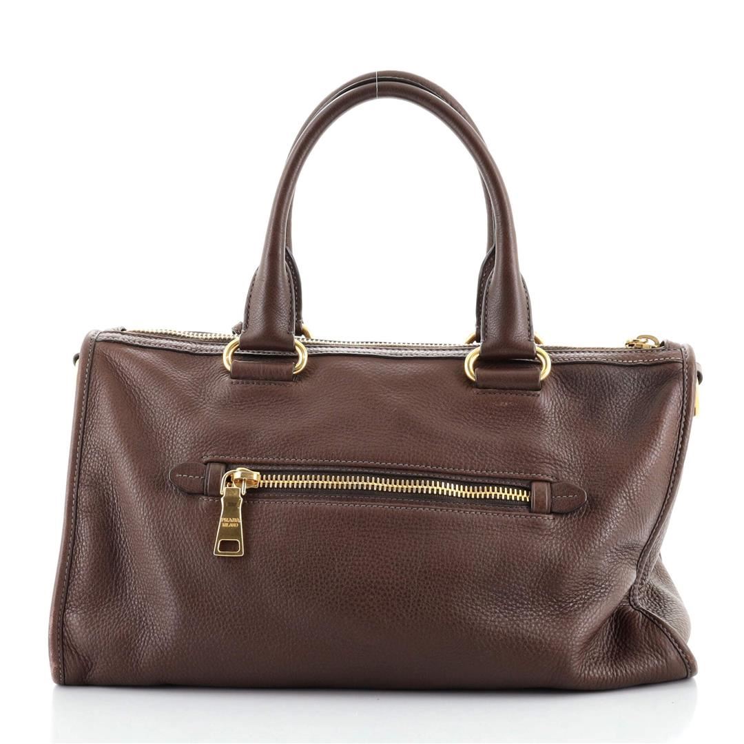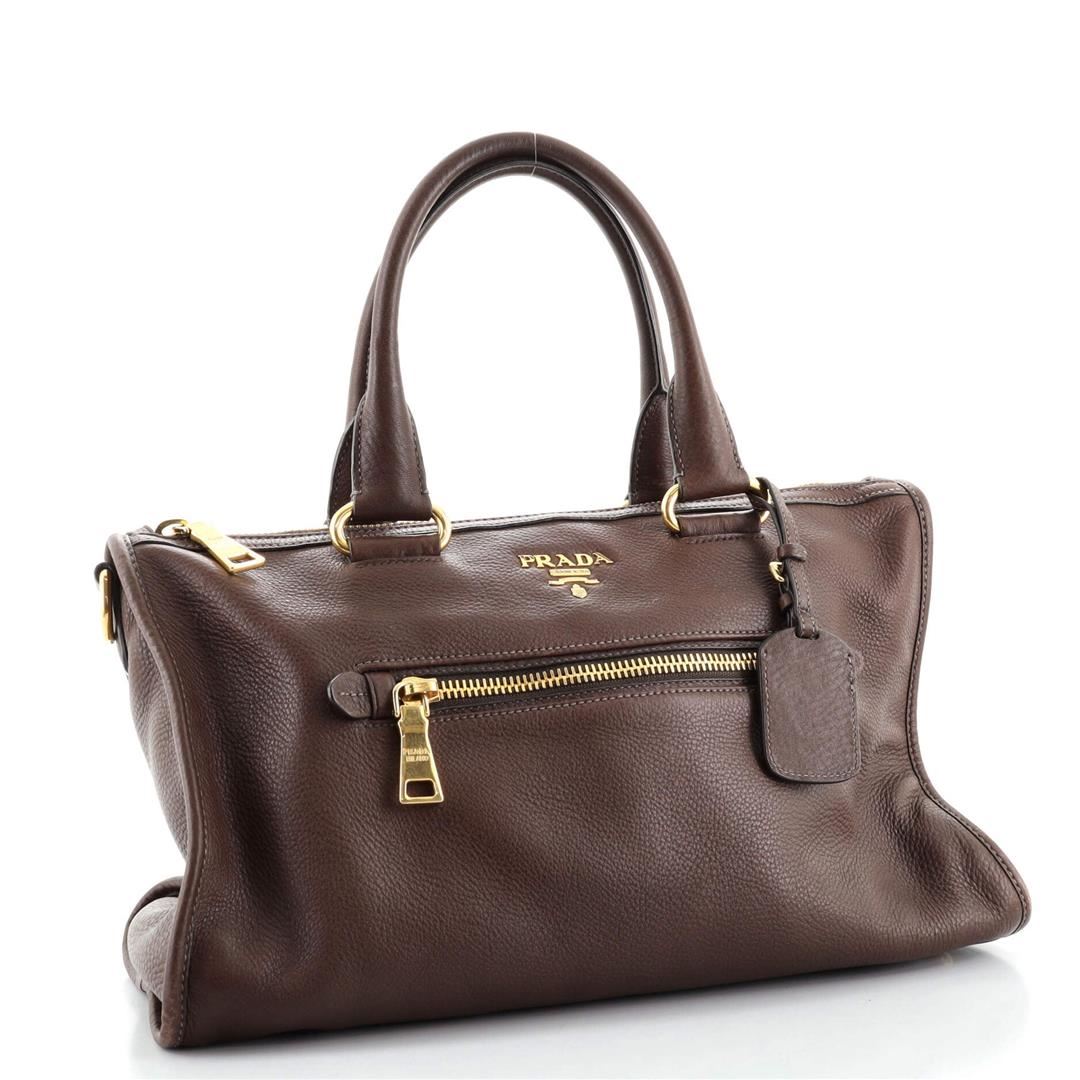 Prada Brown Vitello Leather Daino Front Zip Convertible Satchel Bag Condition Details: Odor in interior. Loss of shape on exterior, heavy discoloration and wear on exterior corners. Scuffs on exterior and handles, scratches and tarnish on hardware.