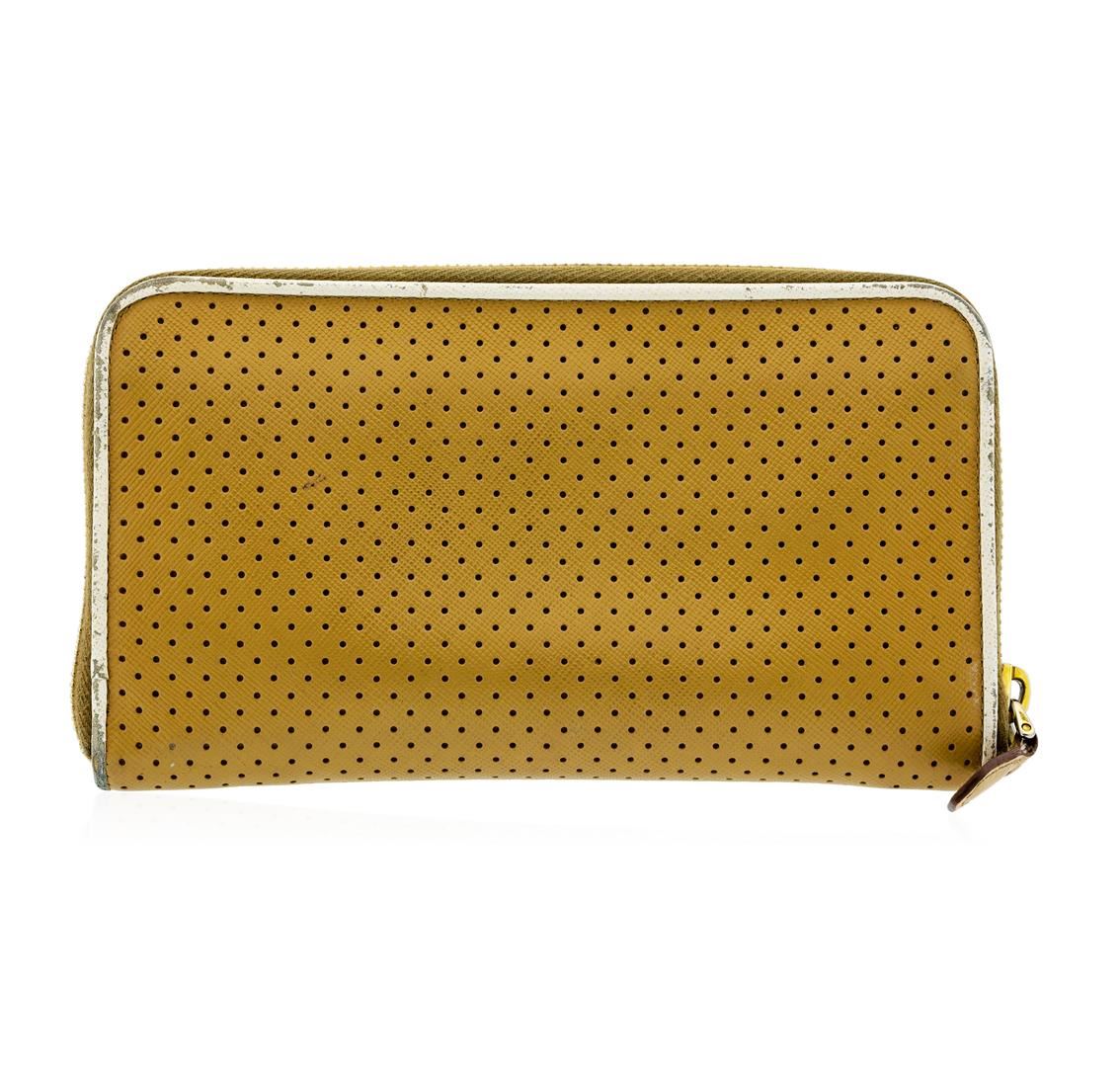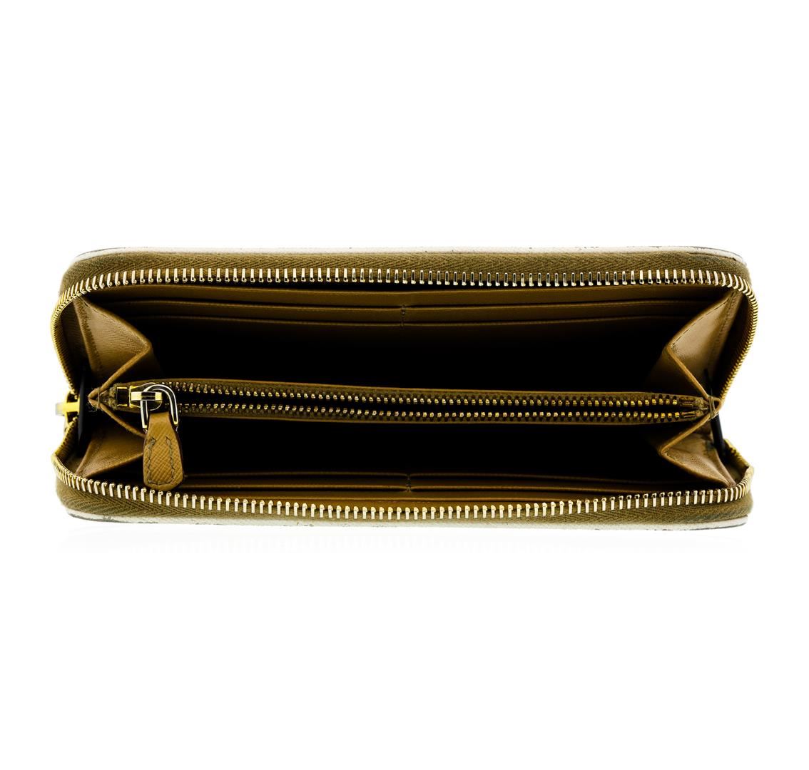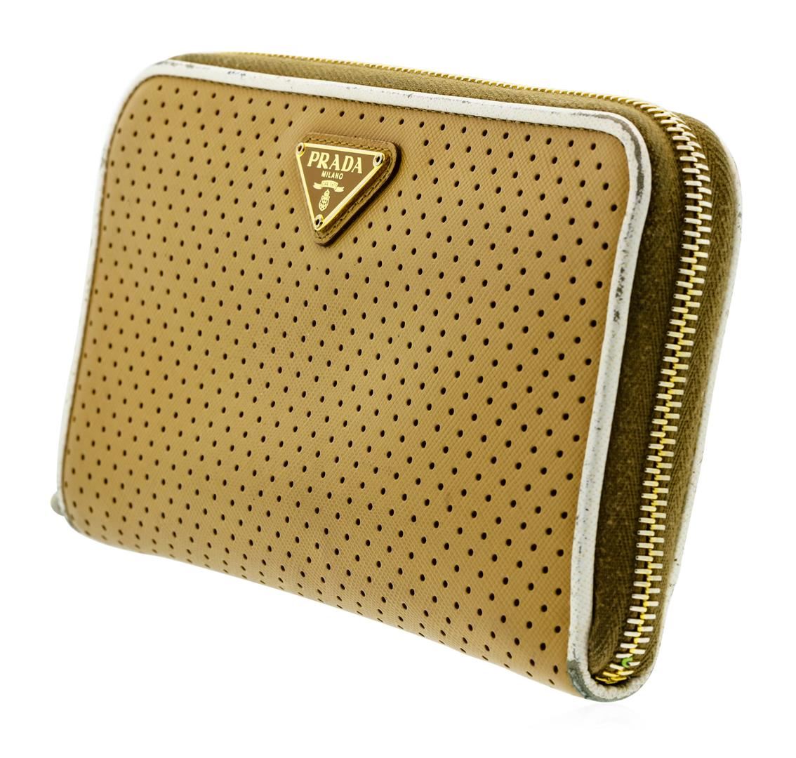 One Prada women's brown wallet. The wallet is in good condition and features a zipper closure, with two separate inner pouches and a zipper closure inner pouch.