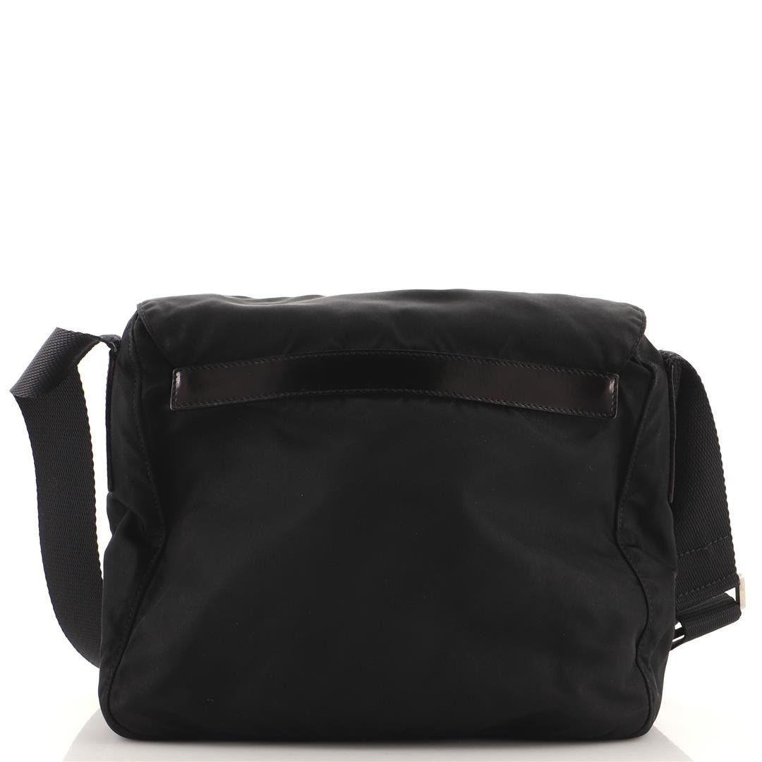 One Prada Buckle Messenger Bag Tessuto Small. Item is sold AS-IS. All available information is listed in the description and shown in the photo. Prada Buckle Messenger Bag Tessuto Small. Odor in interior. Moderate creasing and wear on exterior, scuffs on leather trims, small nicks and pulls on base and rear. Pilling on zipper tape and strap base, cracking on closure wax edges, tarnish and scratches on hardware.