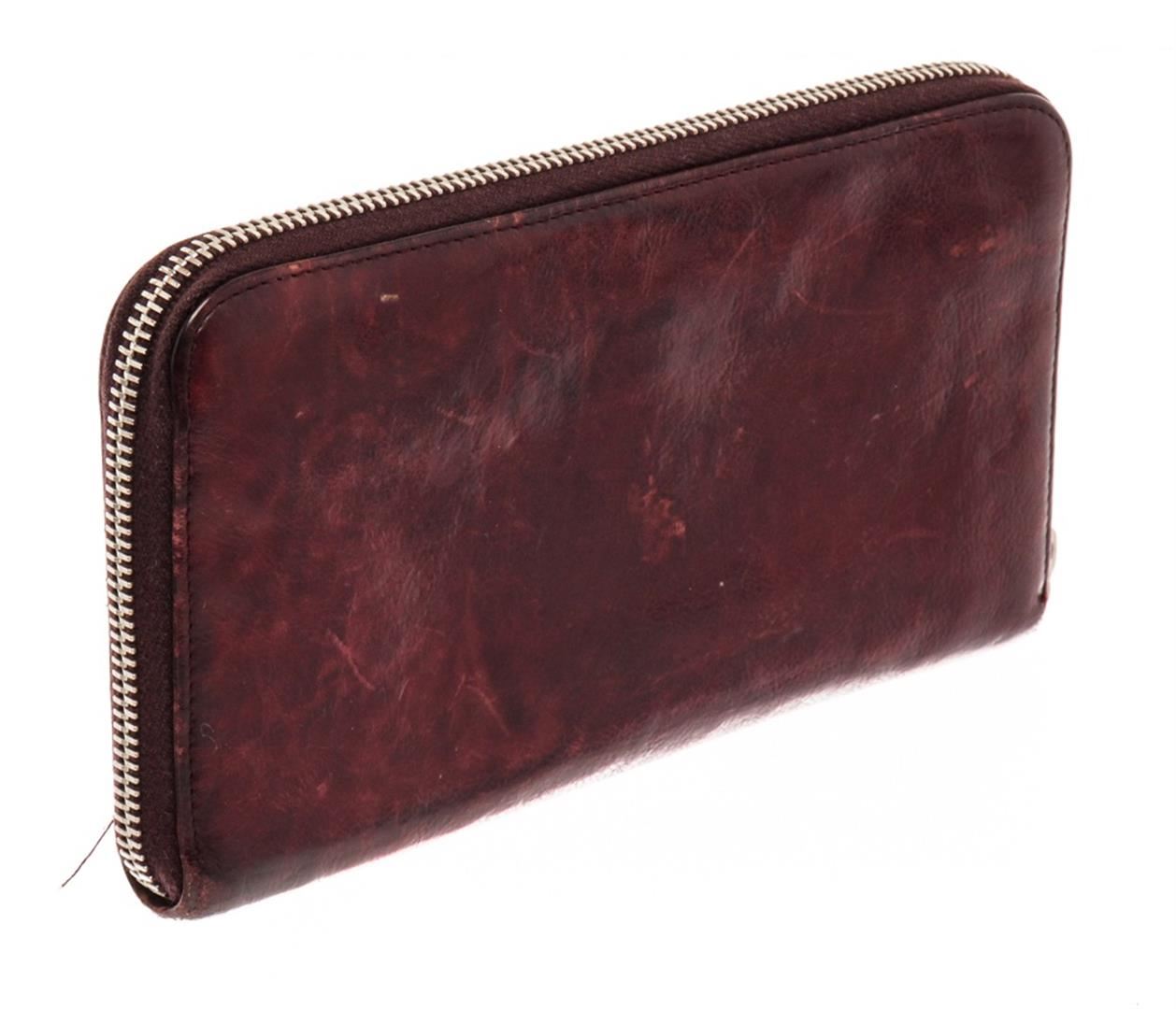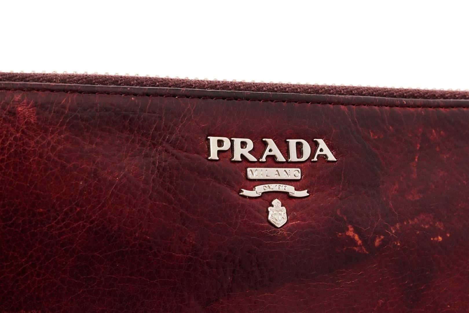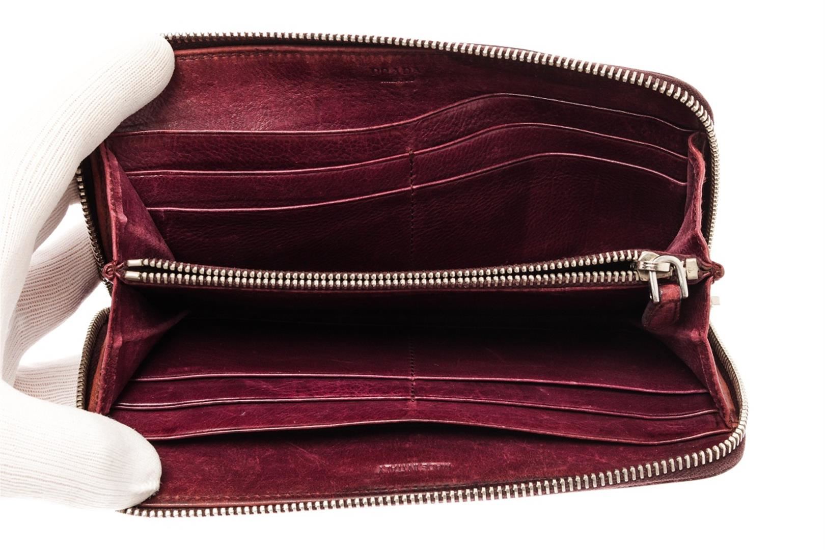 Prada Burgundy Leather Zippy Wallet. All available information is listed in the description and shown in the photos. prada burgundy leather zippy wallet with burgundy leather, gold-tone hardware, leather lining, zip around wallet, interior pockets with card slots, zip closure.