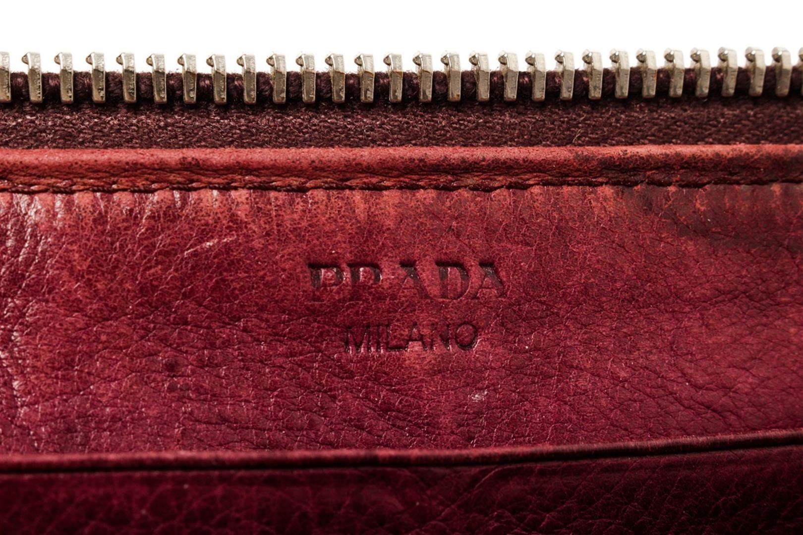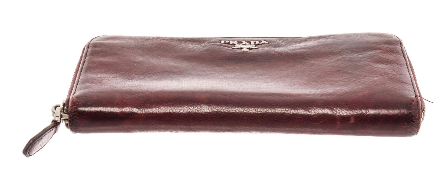 Prada Burgundy Leather Zippy Wallet. All available information is listed in the description and shown in the photos. prada burgundy leather zippy wallet with burgundy leather, gold-tone hardware, leather lining, zip around wallet, interior pockets with card slots, zip closure.