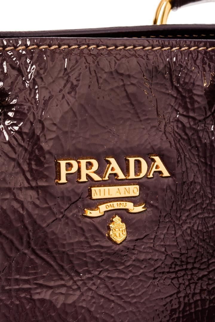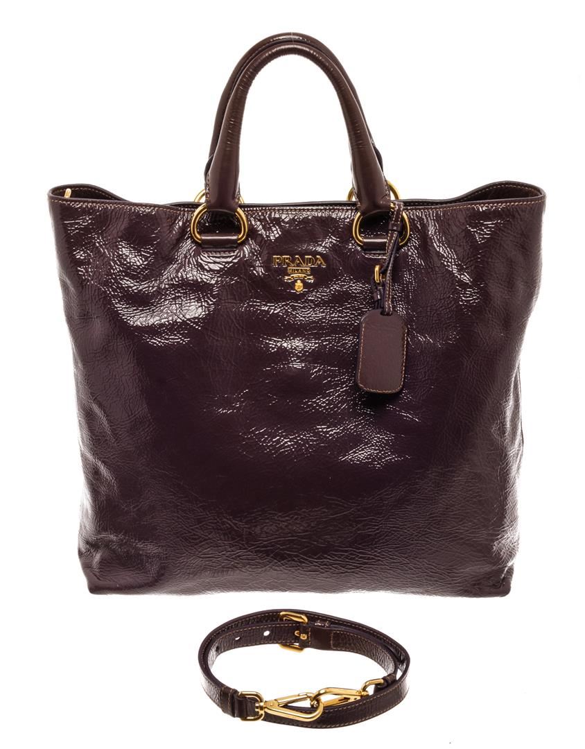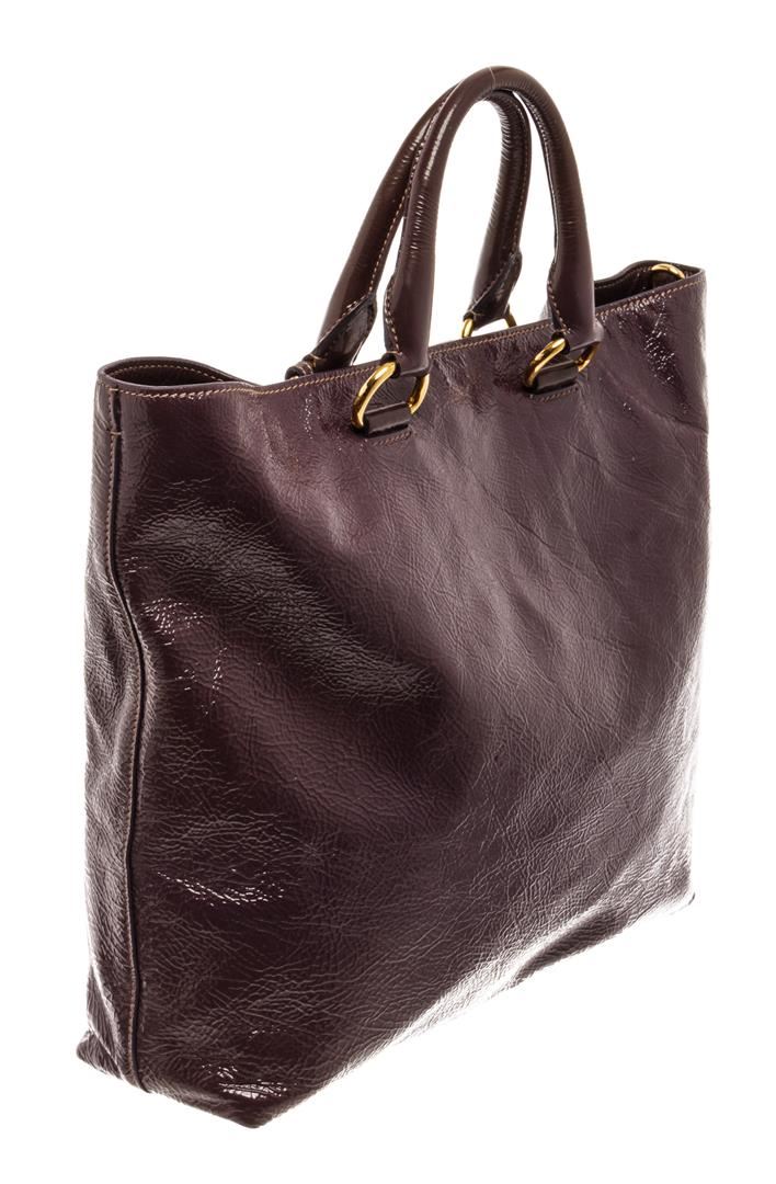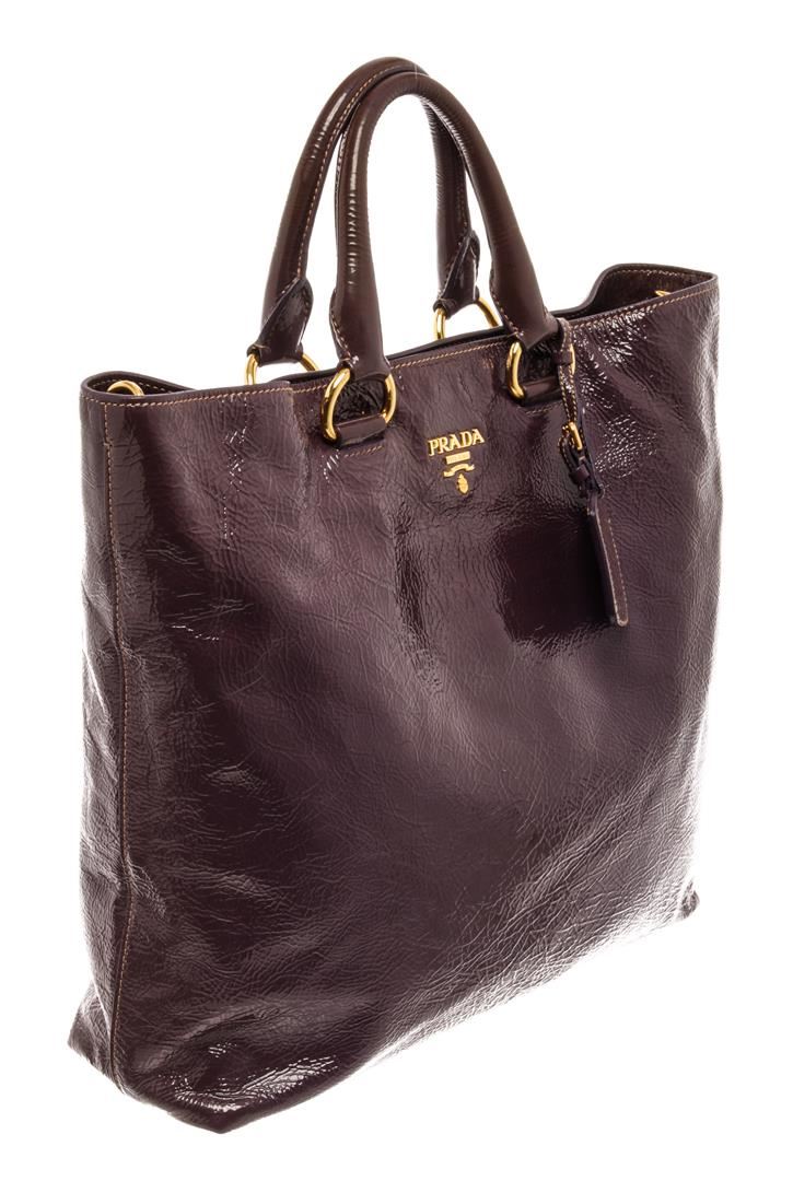 Prada Cacao Brown Patent Leather Tote Bag. All available information is listed in the description and shown in the photos. Prada Cacao Brown Patent Leather Tote Bag with gold-tone hardware, dual rolled leather handles, detachable flat leather strap, and interior zip and slip pockets, a top zip closure.