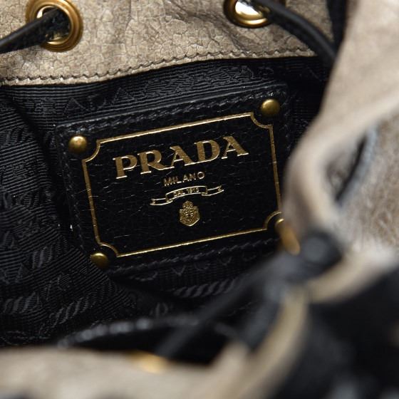 PRADA Black Crackled Craquele Studded Fringe Wristlet Pouch Talco wristlet is finely crafted of textured calfskin leather in black and taupe. The bag features a black studded leather wrist strap and cinch cord, polished silver and gold toned hardware and opens to a black Prada logo fabric interior.