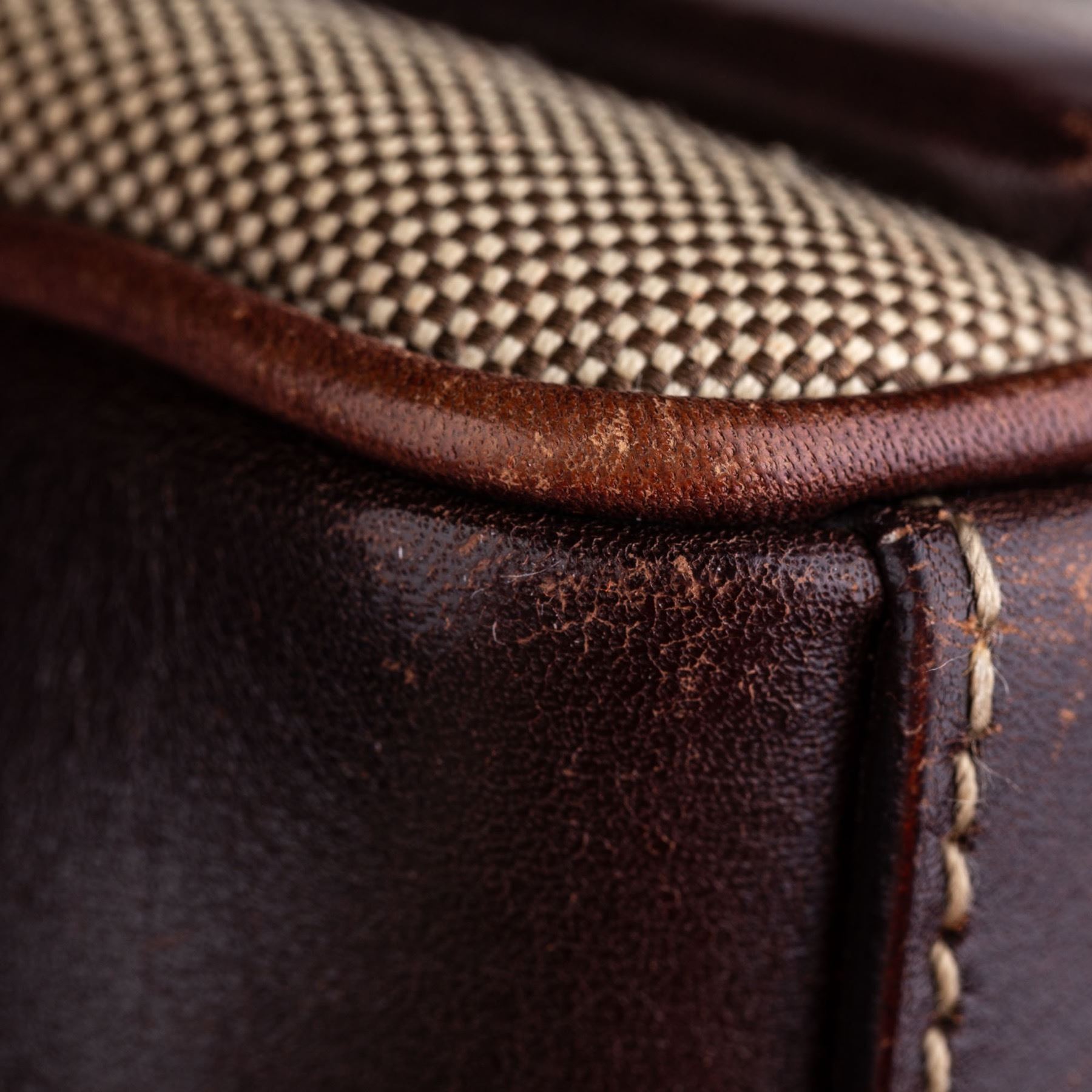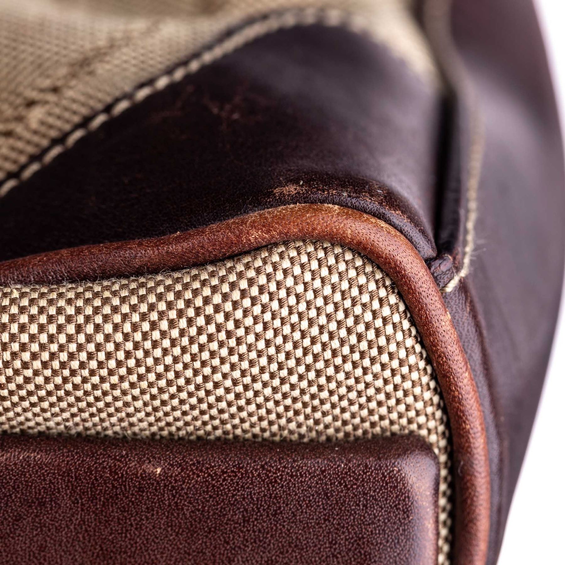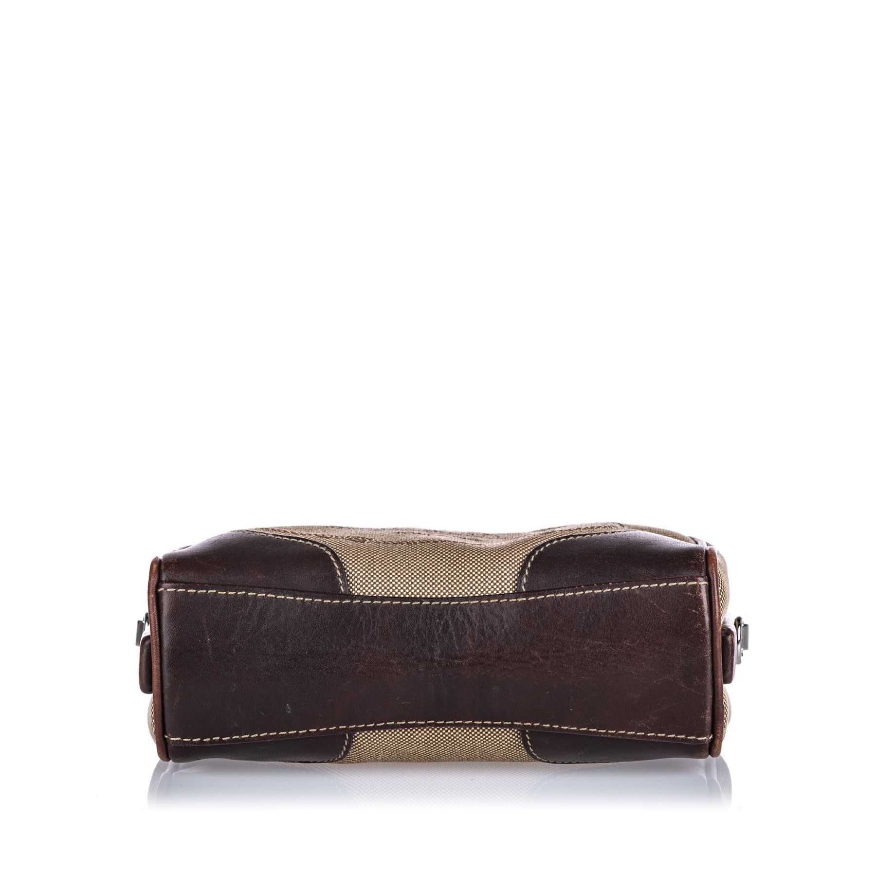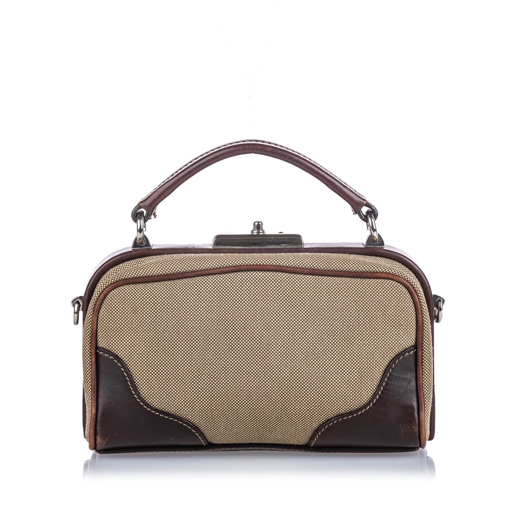 This crossbody bag features a canvas body with leather trim, a flat leather top handle, a detachable flat leather strap, a top push lock closure, and an interior zip pocket. Fabric x Canvas x Leather x Others Brown x Light Brown x Brown x Dark Brown Exterior front is scratched. Exterior back is scratched. Exterior bottom is scratched. Exterior handle is discolored and scratched. Exterior corners is discolored, peeling and scratched. Interior lining is stained. Lock is tarnished. Size: 9 x 16 x 6 Card: NO Made in: Italy