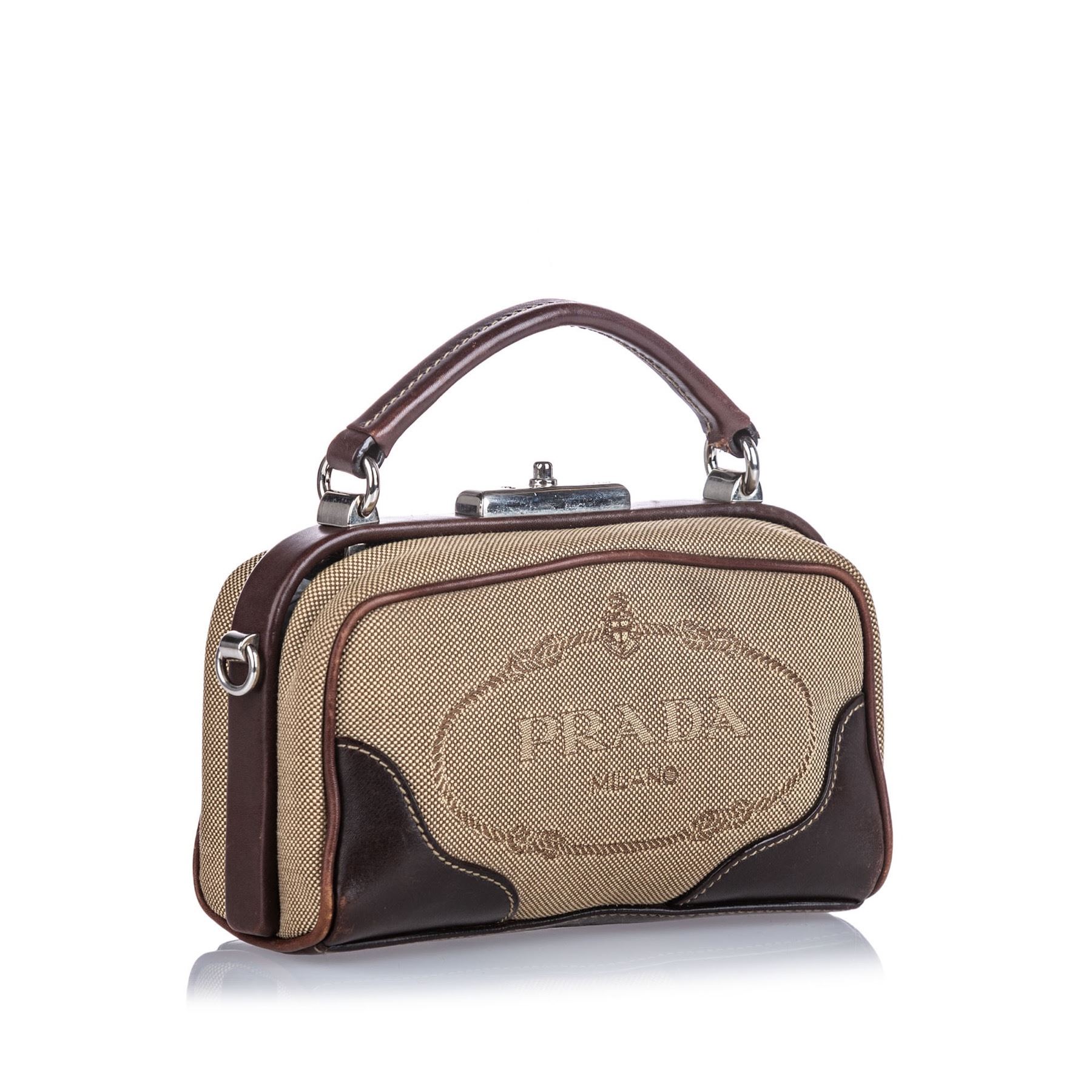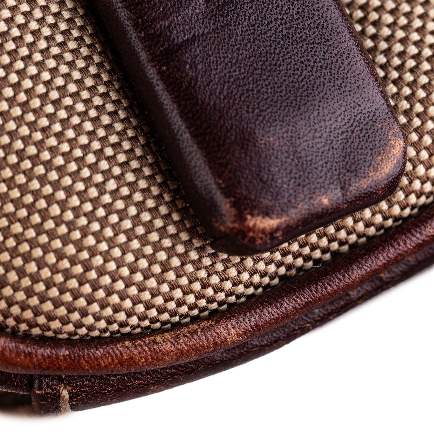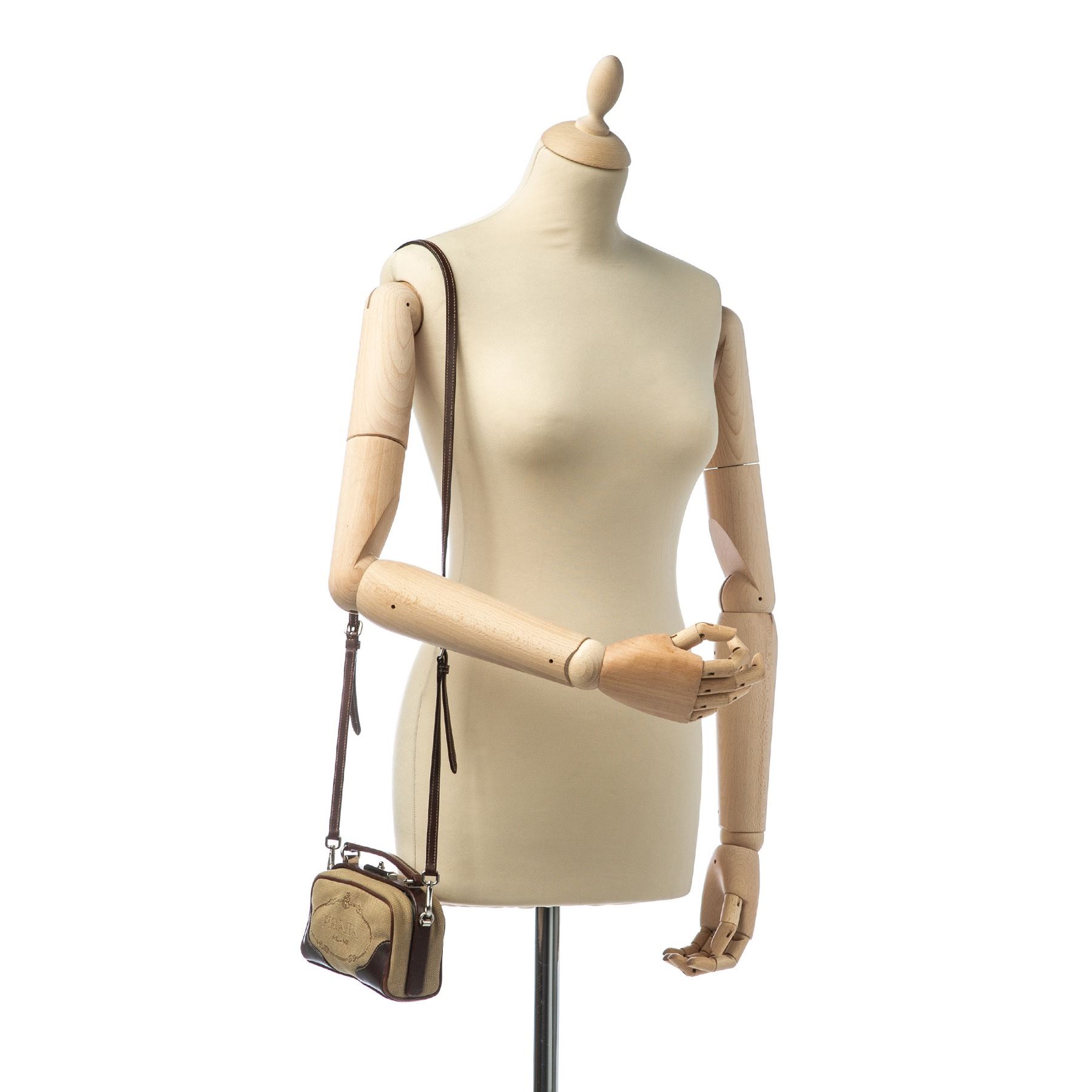 This crossbody bag features a canvas body with leather trim, a flat leather top handle, a detachable flat leather strap, a top push lock closure, and an interior zip pocket. Fabric x Canvas x Leather x Others Brown x Light Brown x Brown x Dark Brown Exterior front is scratched. Exterior back is scratched. Exterior bottom is scratched. Exterior handle is discolored and scratched. Exterior corners is discolored, peeling and scratched. Interior lining is stained. Lock is tarnished. Size: 9 x 16 x 6 Card: NO Made in: Italy
