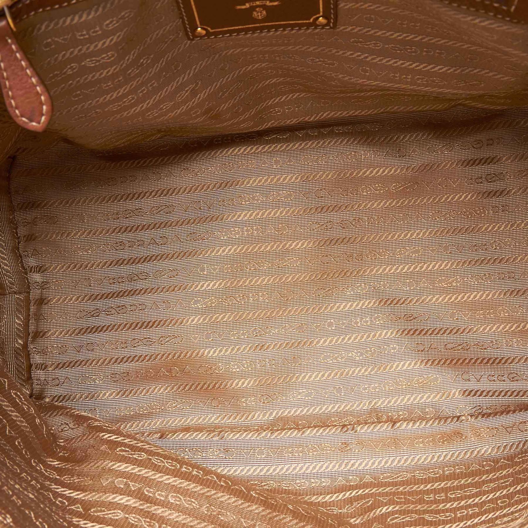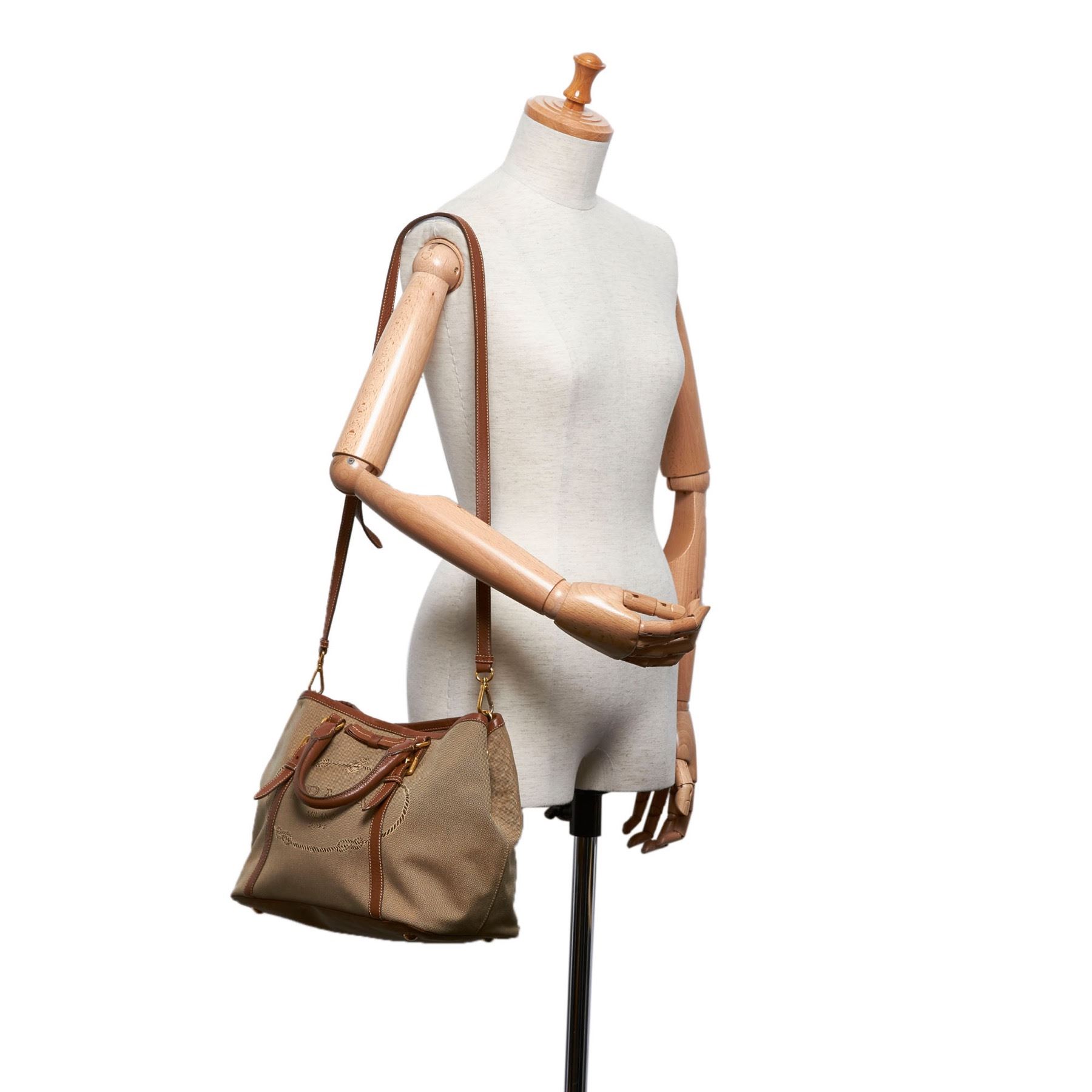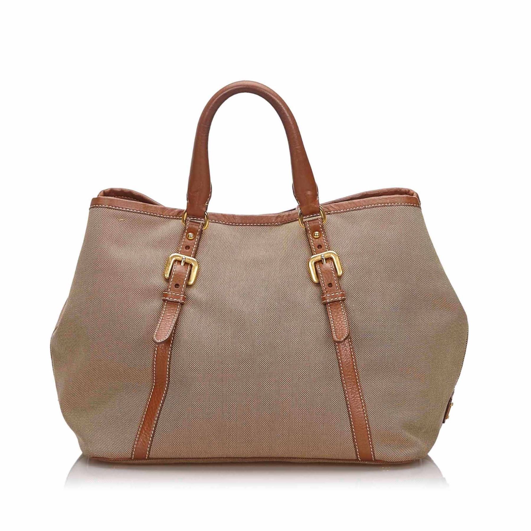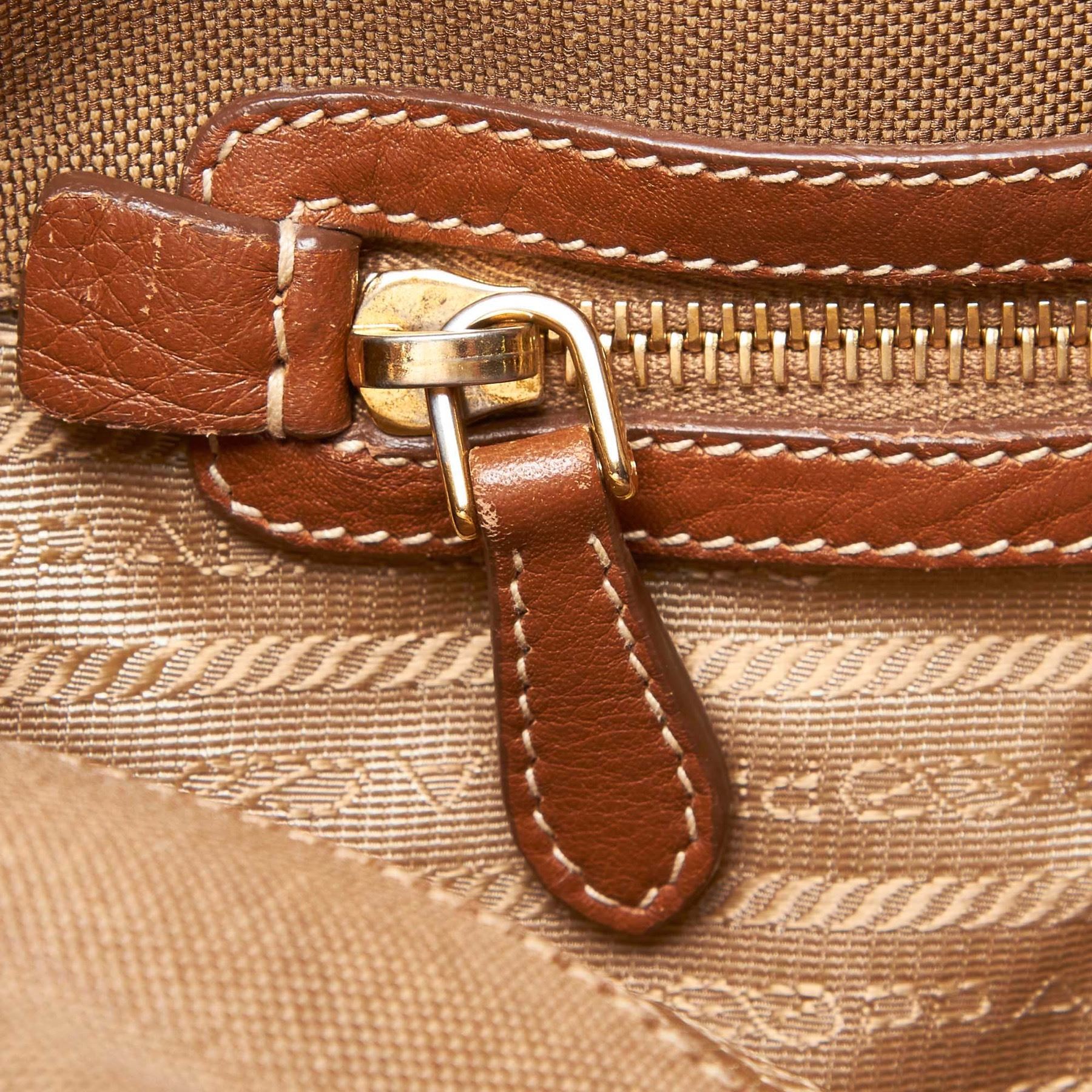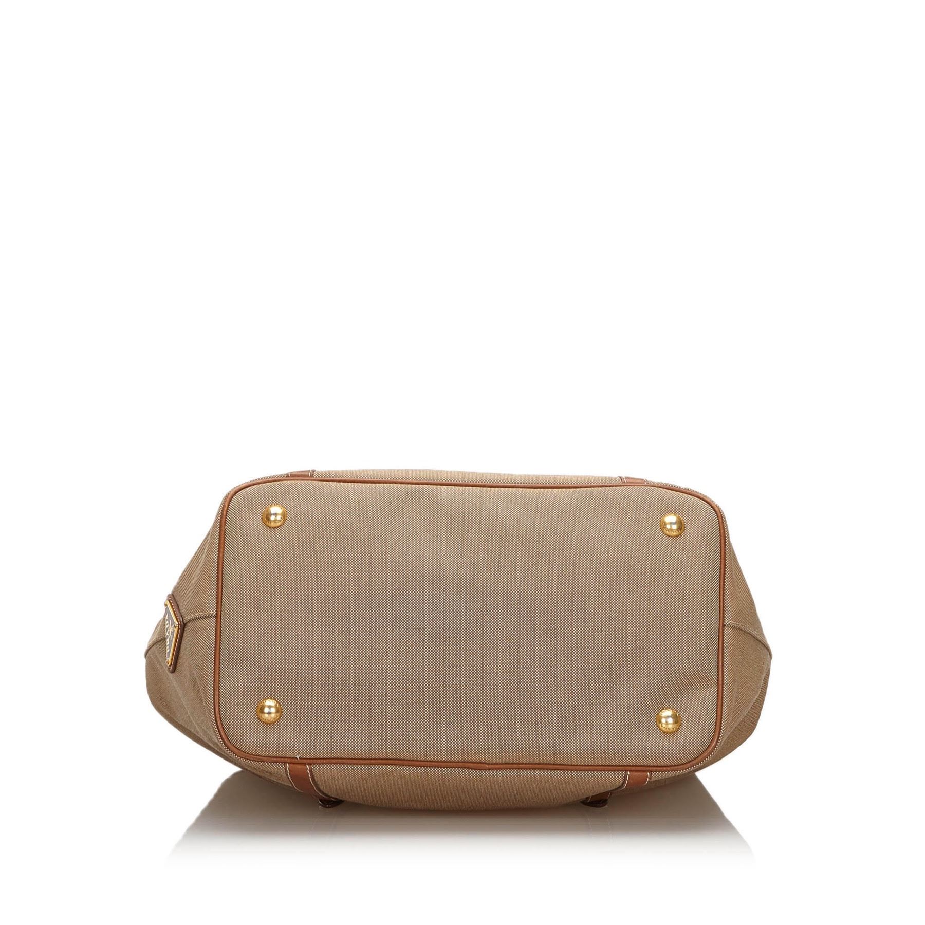 This satchel features a canvas body with leather trim, rolled leather straps, an open top with a magnetic snap closure, and an interior zip pocket. Fabric x Canvas x Leather x Others Brown x Beige x Brown x Dark Brown Exterior front is stained. Exterior back is stained. Exterior handle is discolored and scratched. Exterior corners is discolored and scratched. Exterior side is scratched. Studs is scratched. Size: 23 x 42 x 16 Card: NO Made in: ITALY