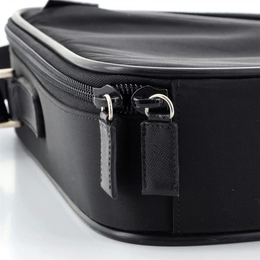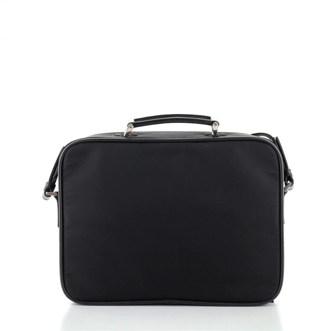 One Prada Convertible Front Pocket Briefcase Tessuto with Saffiano Leather. Item is sold AS-IS. All available information is listed in the description and shown in the photo. Prada Convertible Front Pocket Briefcase Tessuto with Saffiano Leather. Creasing on exterior, wear and scuffs on exterior trims, wear and loose stitching on base corners. Glue stains in interior pocket, tarnish and scratches on hardware.