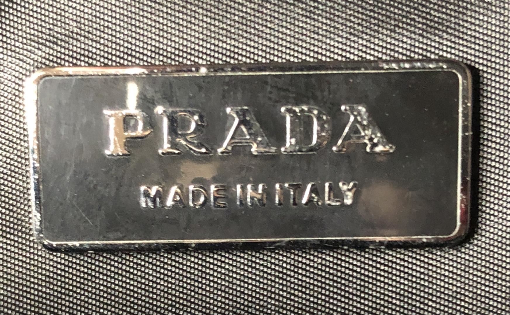 One Prada Convertible Front Pocket Briefcase Tessuto with Saffiano Leather. Item is sold AS-IS. All available information is listed in the description and shown in the photo. Prada Convertible Front Pocket Briefcase Tessuto with Saffiano Leather. Creasing on exterior, wear and scuffs on exterior trims, wear and loose stitching on base corners. Glue stains in interior pocket, tarnish and scratches on hardware.