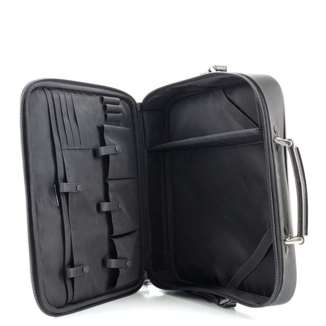 One Prada Convertible Front Pocket Briefcase Tessuto with Saffiano Leather. Item is sold AS-IS. All available information is listed in the description and shown in the photo. Prada Convertible Front Pocket Briefcase Tessuto with Saffiano Leather. Creasing on exterior, wear and scuffs on exterior trims, wear and loose stitching on base corners. Glue stains in interior pocket, tarnish and scratches on hardware.