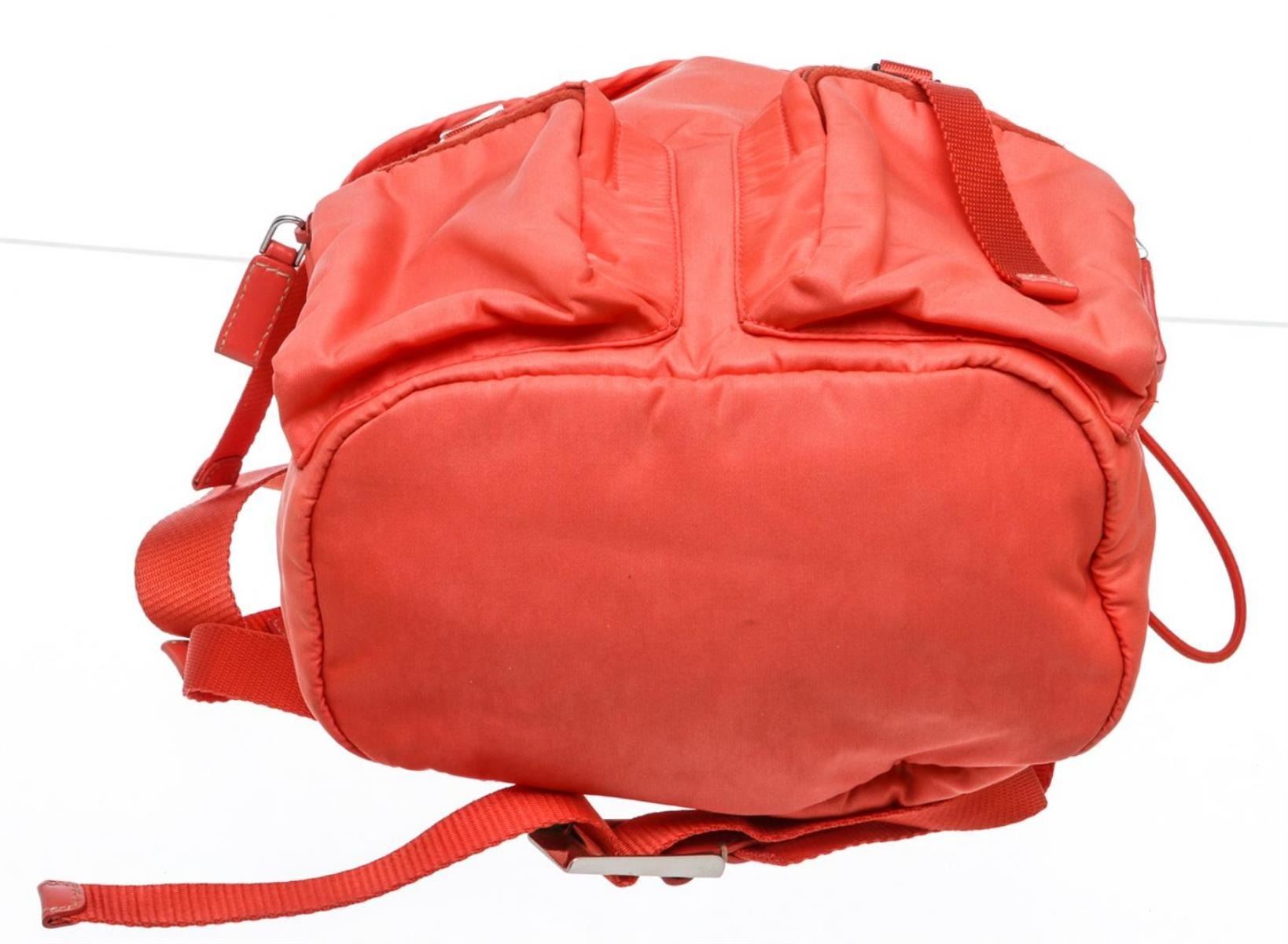 Prada bright coral nylon backpack with silver-tone hardware, tonal fabric lining, dual front zip pockets, drawstring closure with double buckle flap, top handle, dual adjustable shoulder straps.