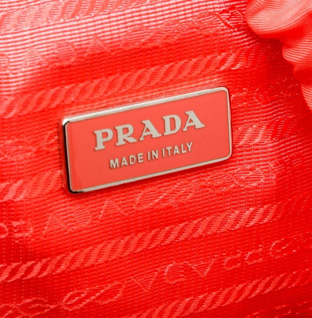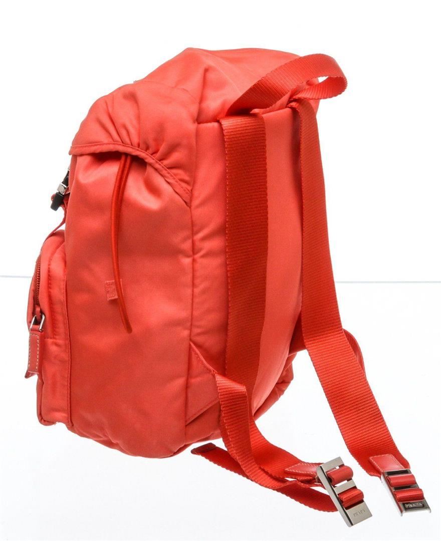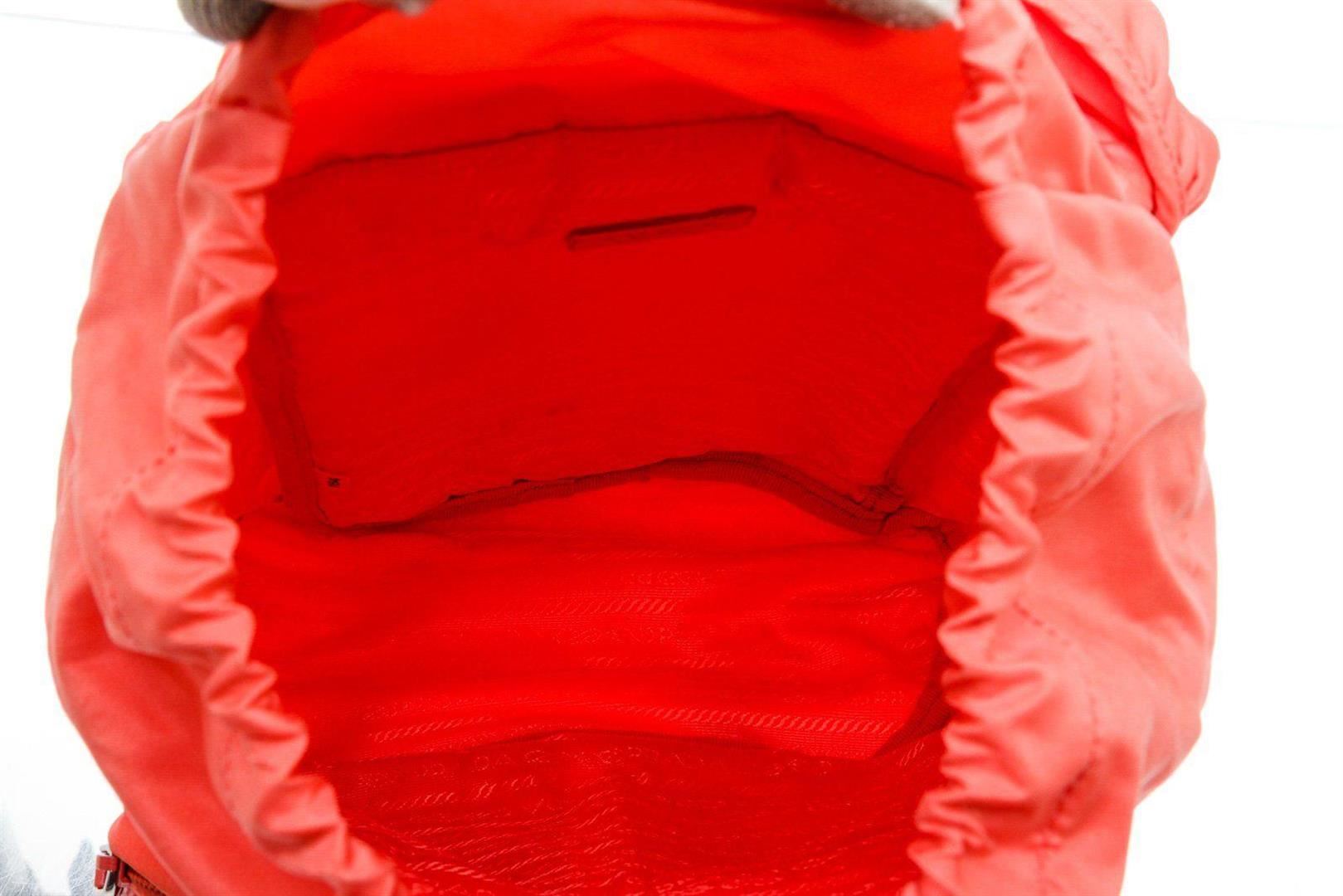 Prada bright coral nylon backpack with silver-tone hardware, tonal fabric lining, dual front zip pockets, drawstring closure with double buckle flap, top handle, dual adjustable shoulder straps. Measurements: Length: 8.5 in / 22 cm Width: 4.75 in / 12 cm 10 in / 25 cmCONDITION: Pre-Owned Good condition overall. Please refer to photographs.
