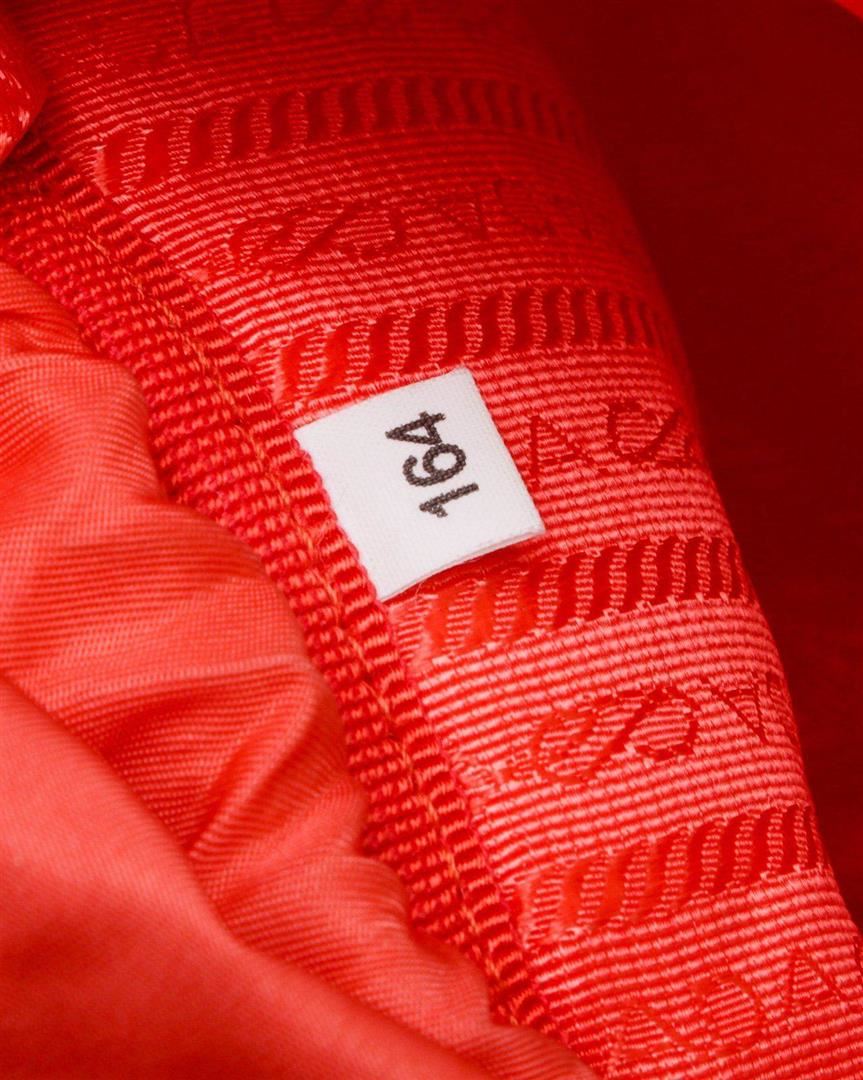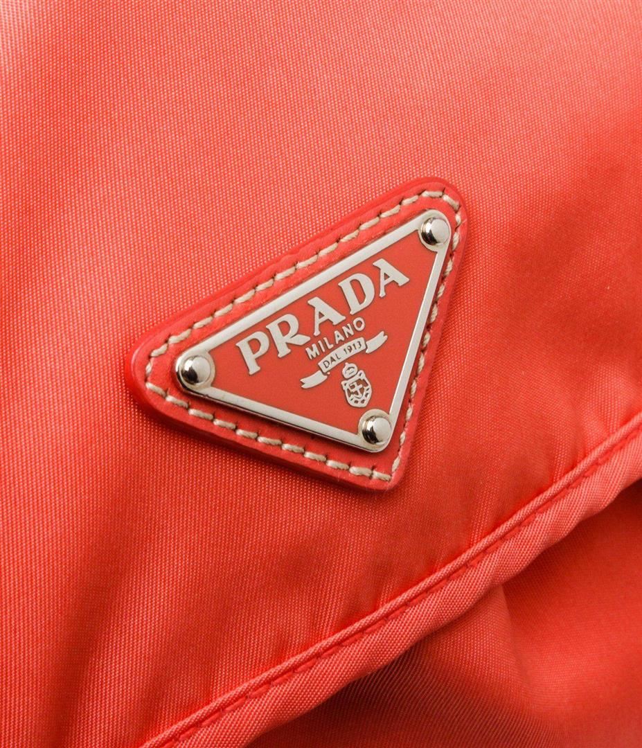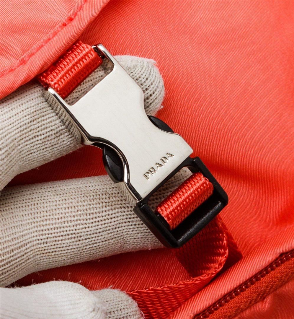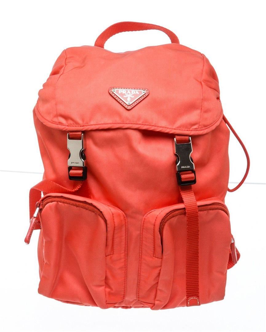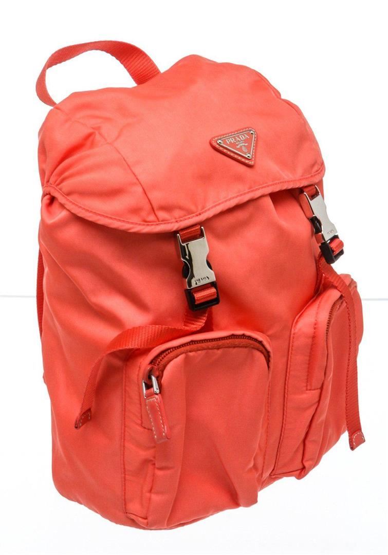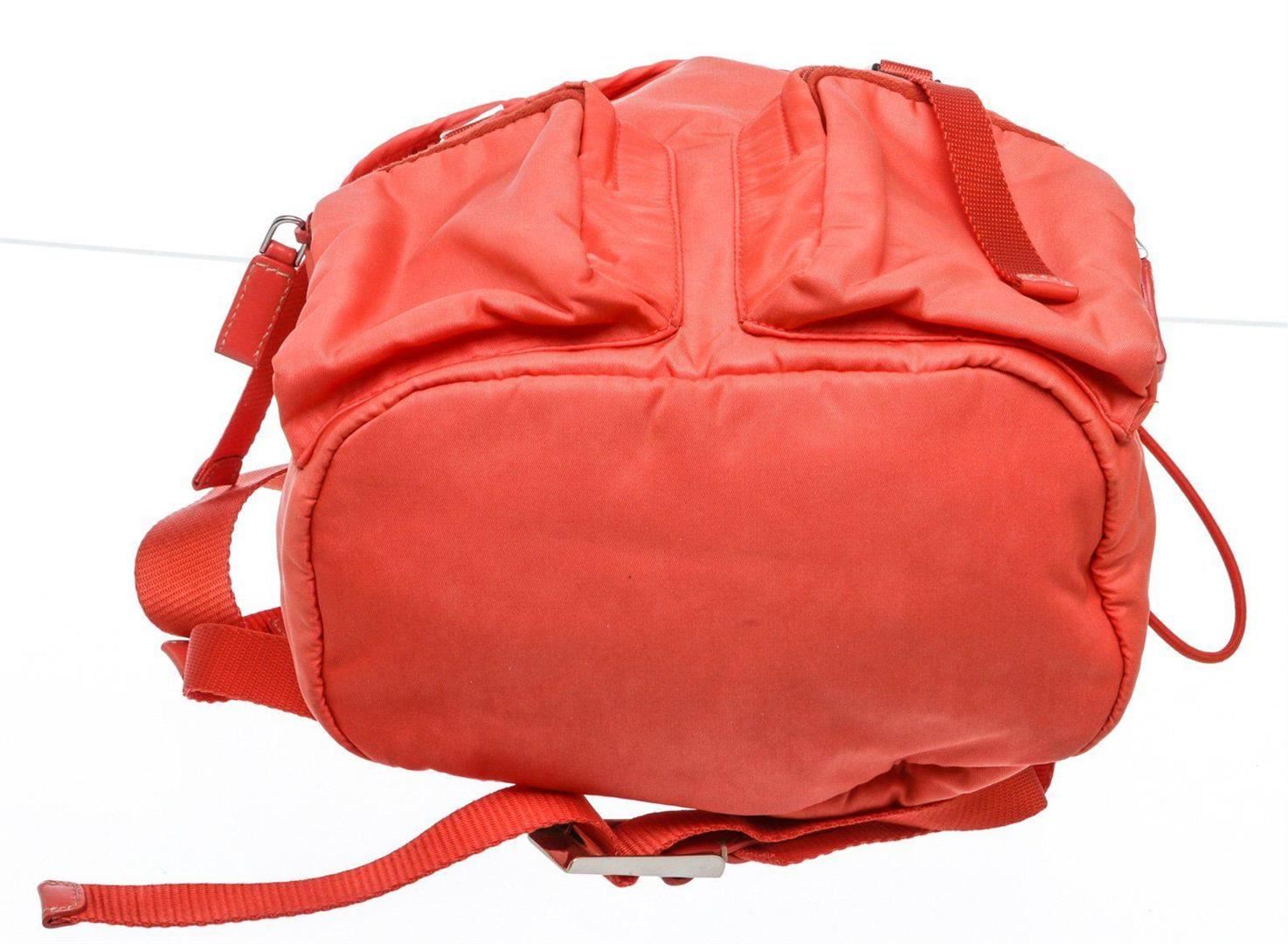 Prada bright coral nylon backpack with silver-tone hardware, tonal fabric lining, dual front zip pockets, drawstring closure with double buckle flap, top handle, dual adjustable shoulder straps. Measurements: Length: 8.5 in / 22 cm Width: 4.75 in / 12 cm 10 in / 25 cmCONDITION: Pre-Owned Good condition overall. Please refer to photographs.