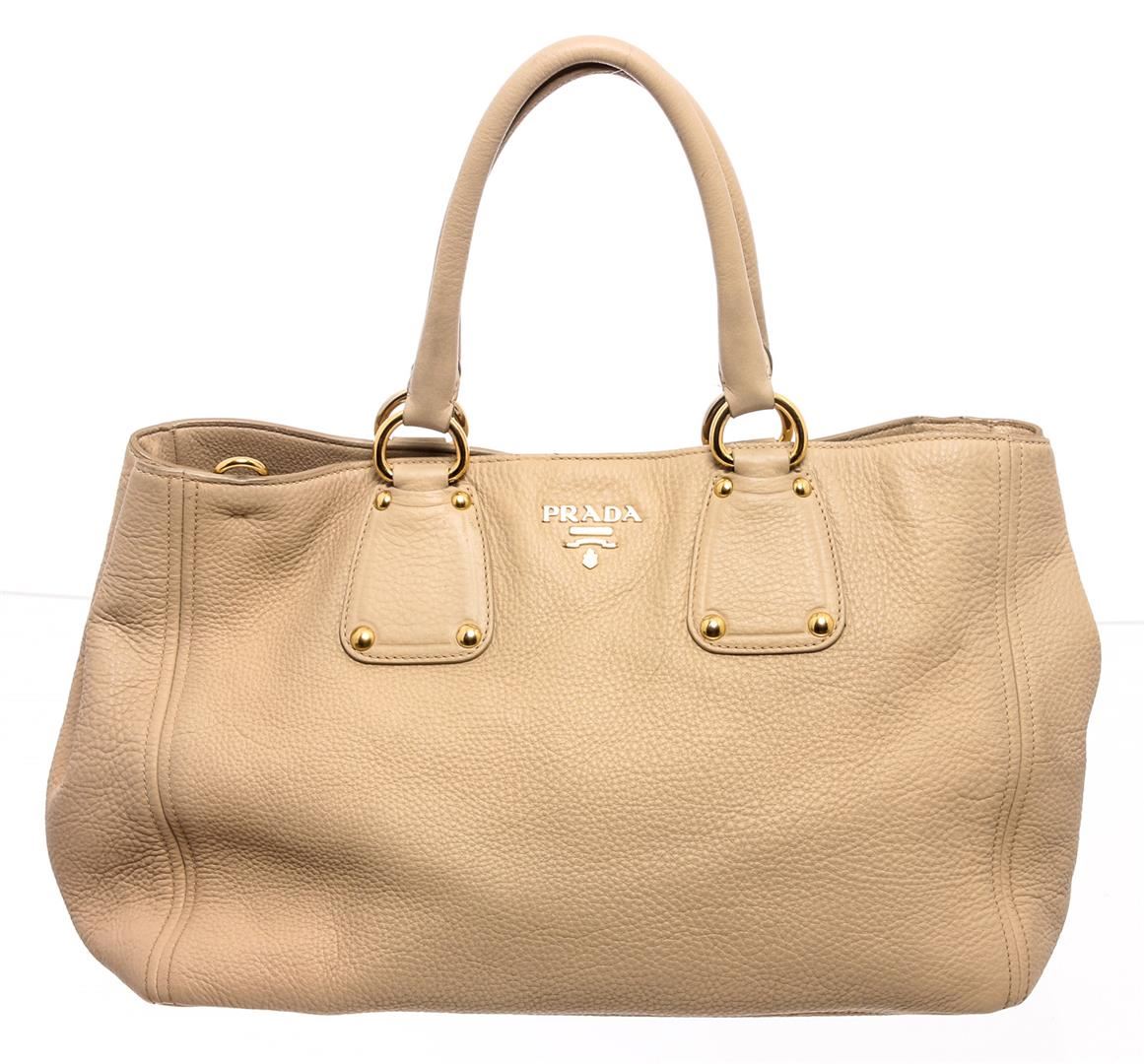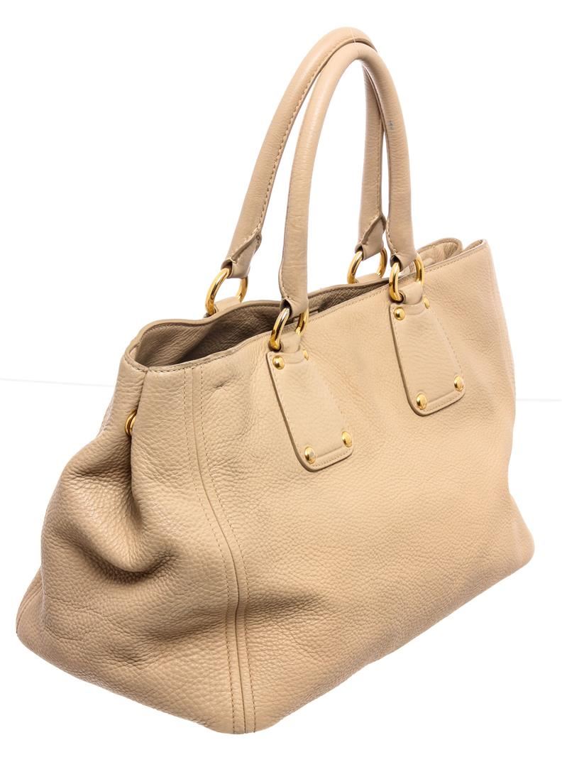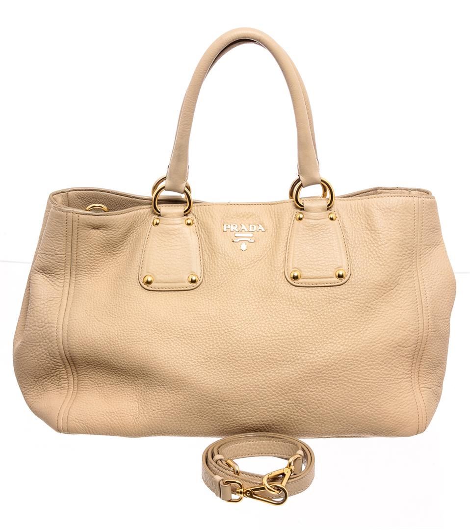 Cream pebbled leather Prada Large tote shoulder bag with gold-tone hardware, optional detachable leather shoulder strap, dual rolled top handles, tan canvas lining, two interior pockets; one with zip closure and overall magnetic snap closure at top.
