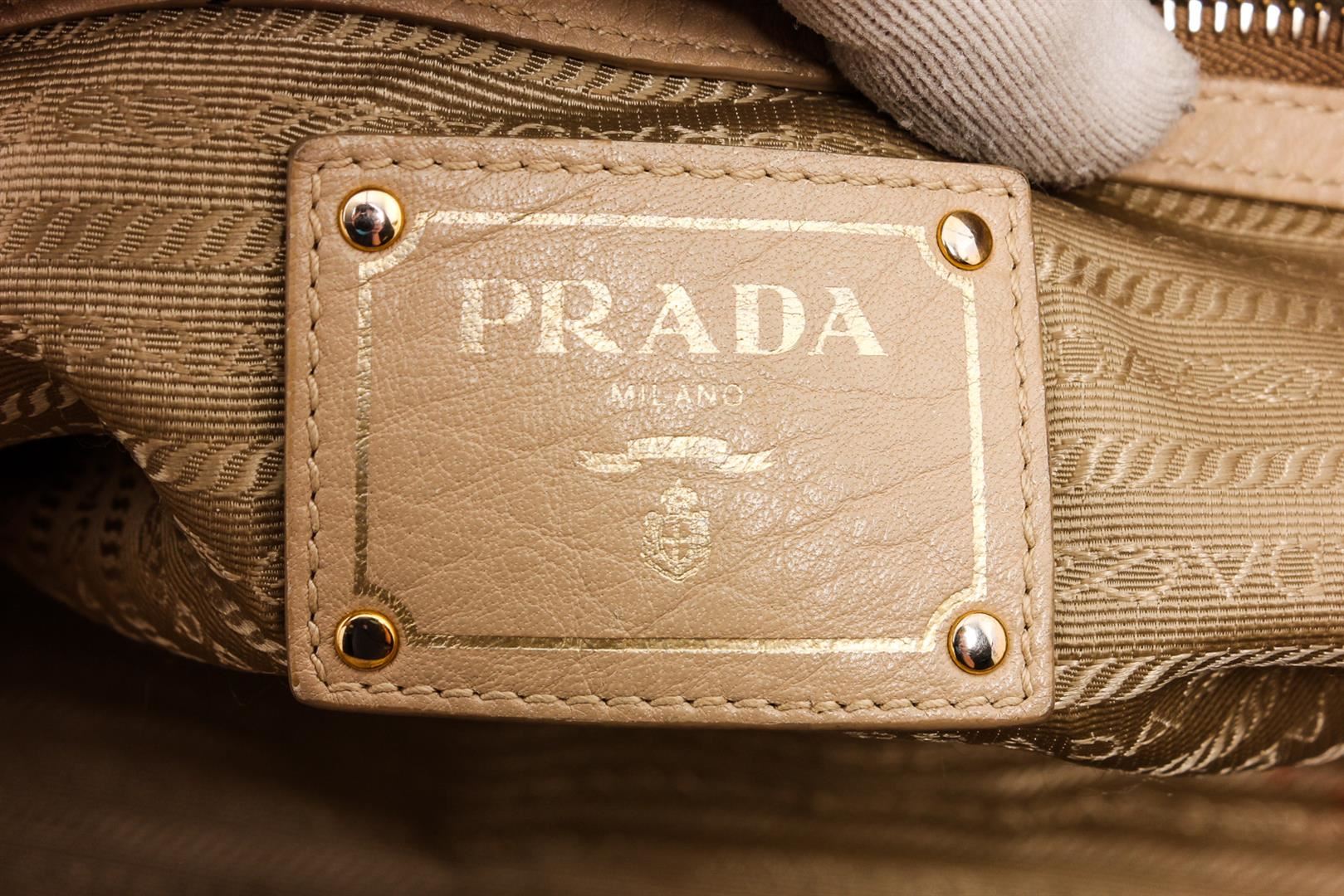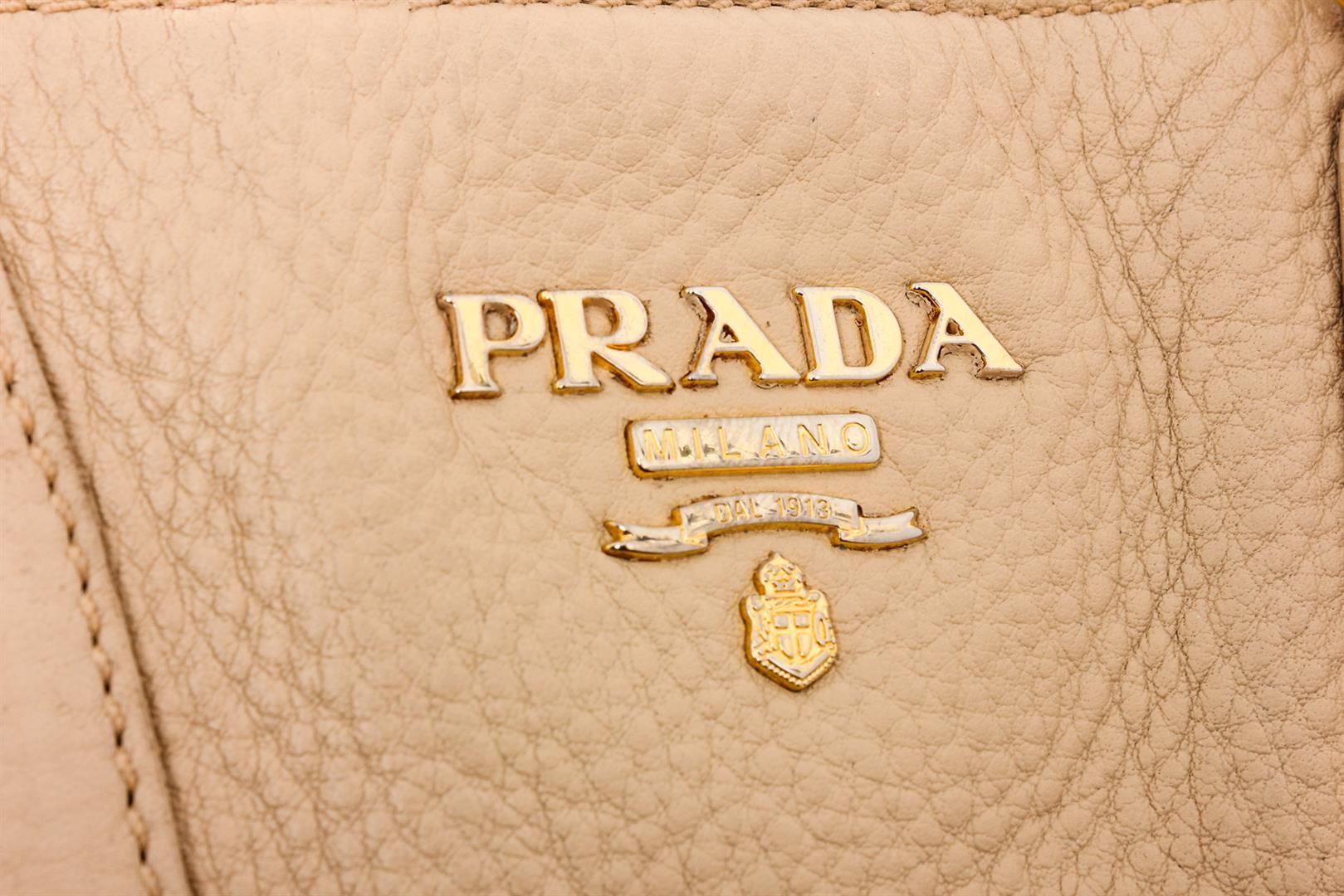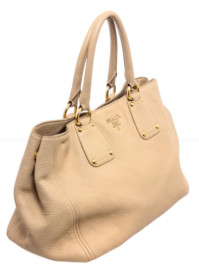 Cream pebbled leather Prada Large tote shoulder bag with gold-tone hardware, optional detachable leather shoulder strap, dual rolled top handles, tan canvas lining, two interior pockets; one with zip closure and overall magnetic snap closure at top.