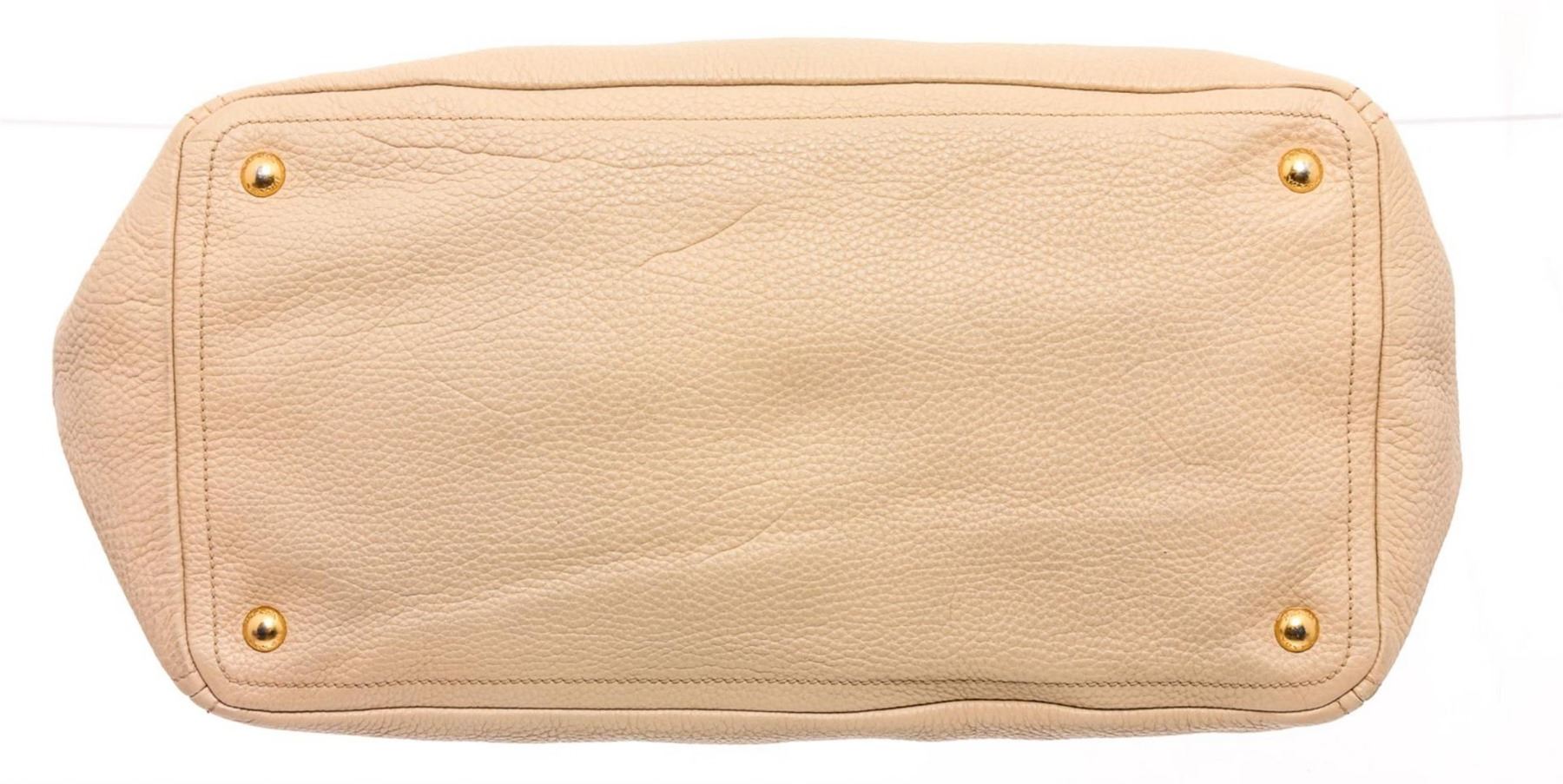 Cream pebbled leather Prada Large tote shoulder bag with gold-tone hardware, optional detachable leather shoulder strap, dual rolled top handles, tan canvas lining, two interior pockets; one with zip closure and overall magnetic snap closure at top.