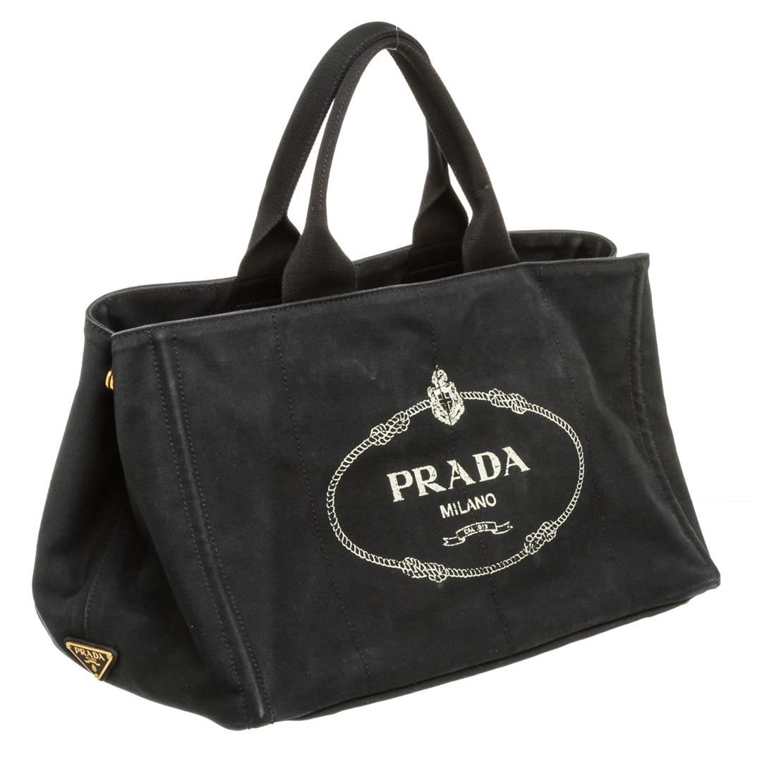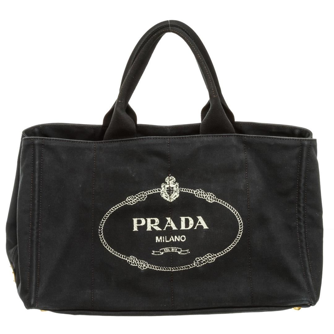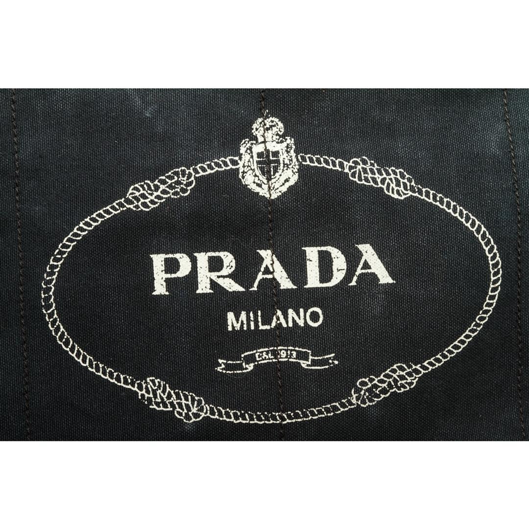 Prada dark blue canvas Canapa tote bag with dual interior zip pockets, interior slip pocket, side snaps, front logo print. Authentic.