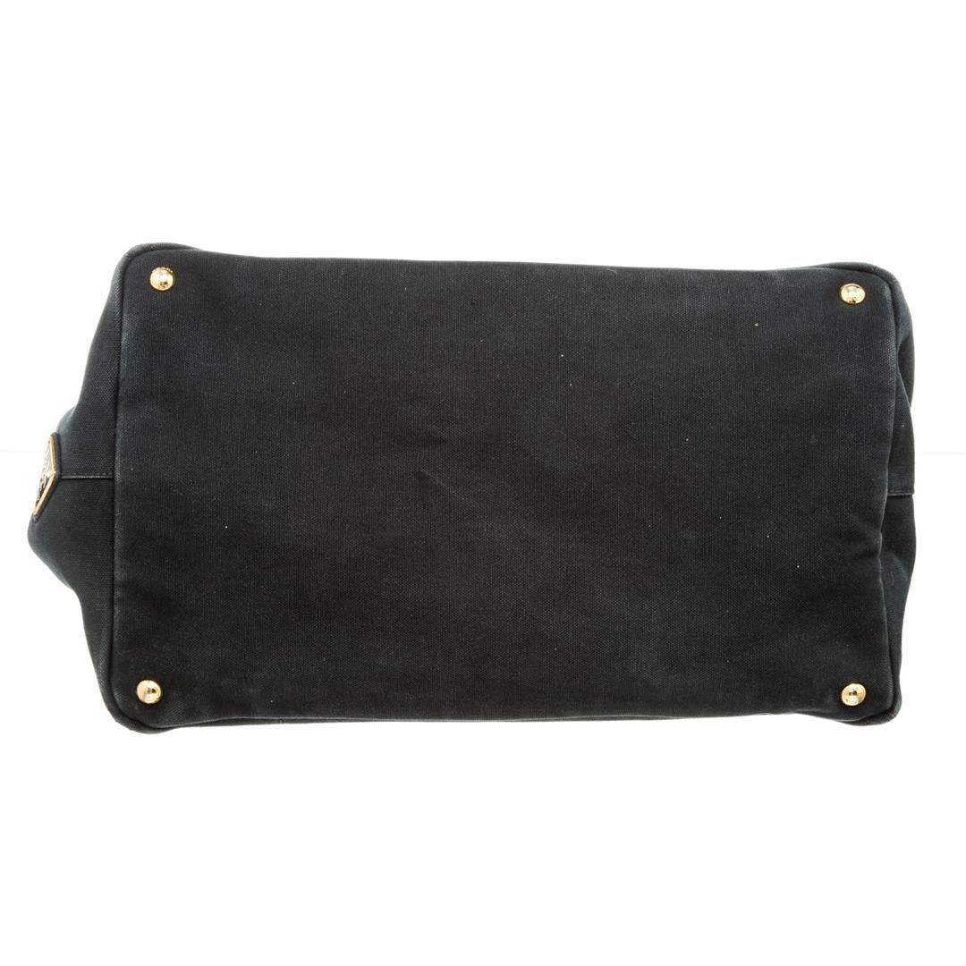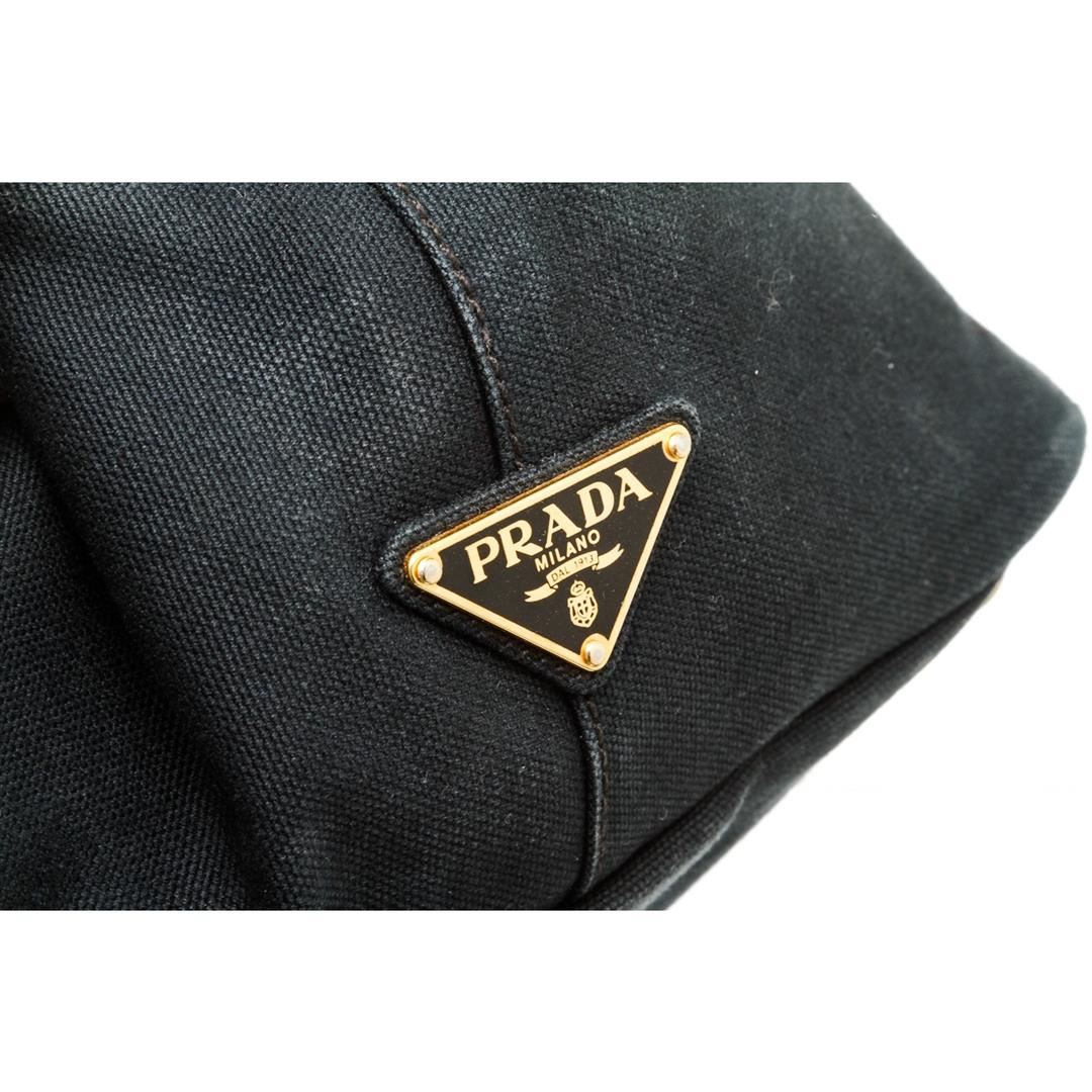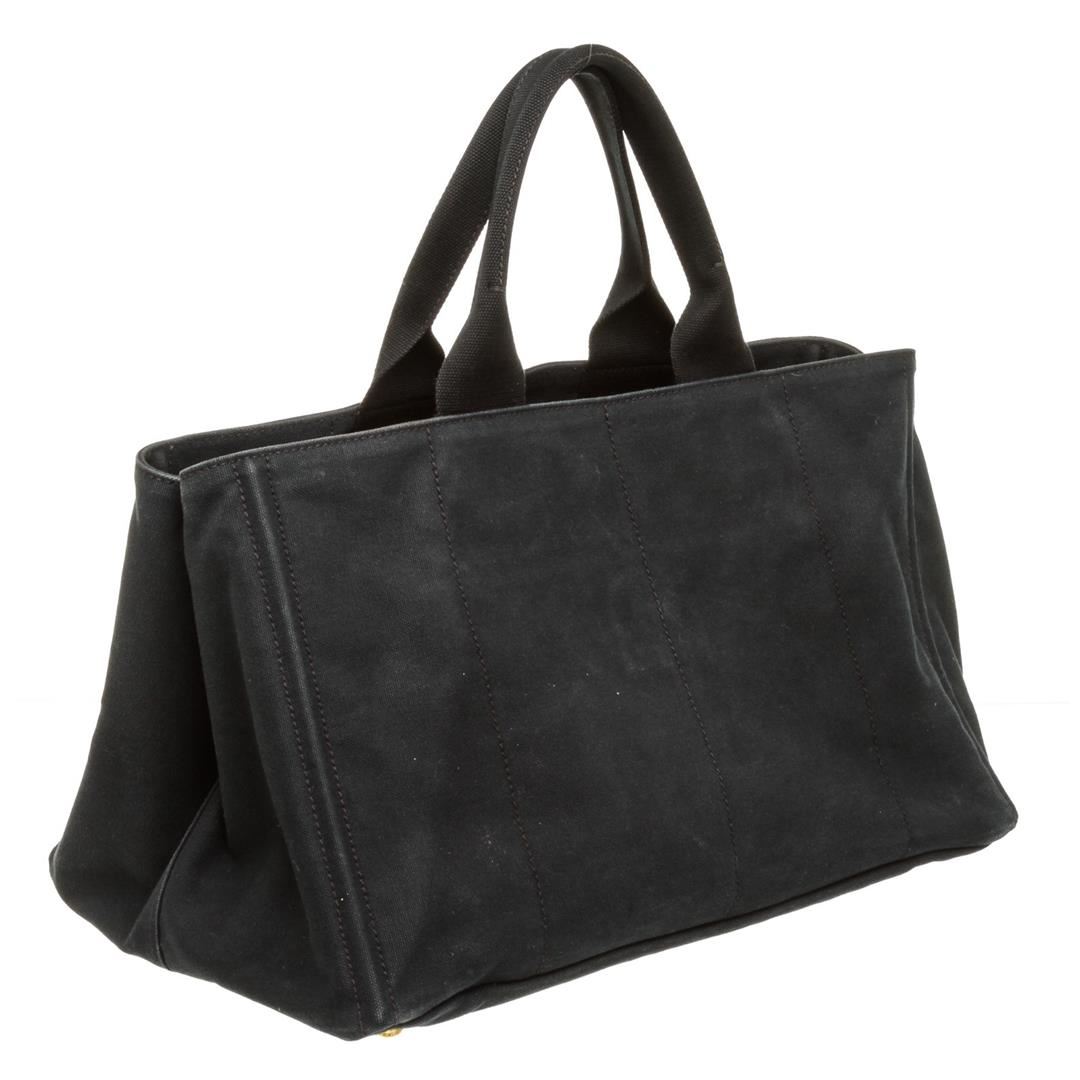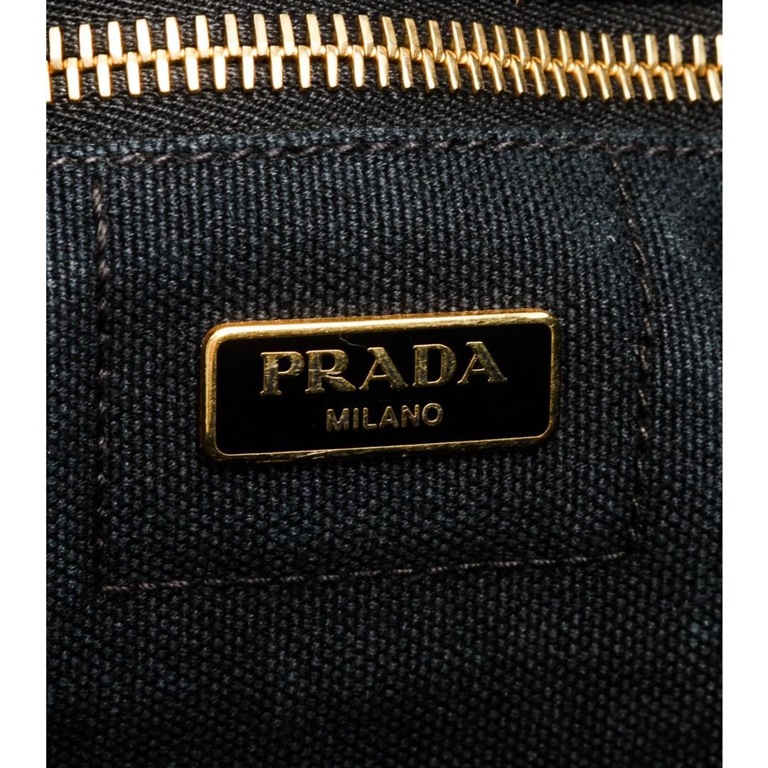 Prada dark blue canvas Canapa tote bag with dual interior zip pockets, interior slip pocket, side snaps, front logo print. Authentic.