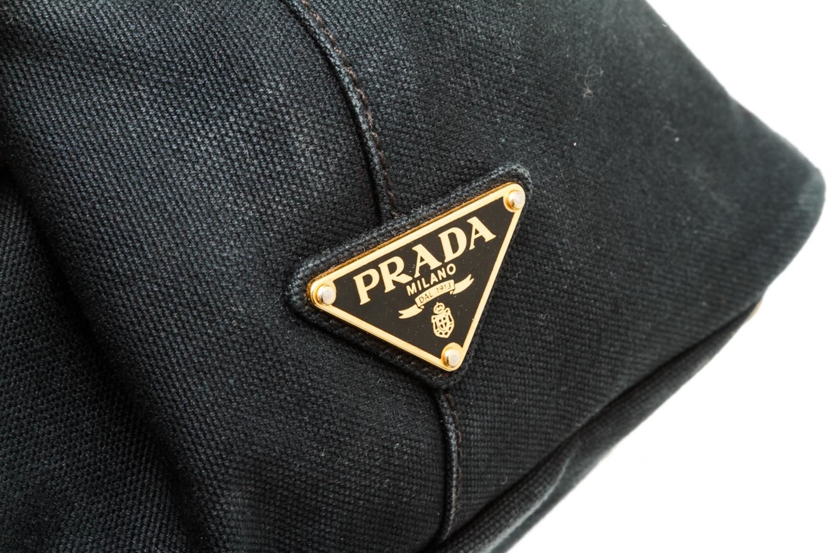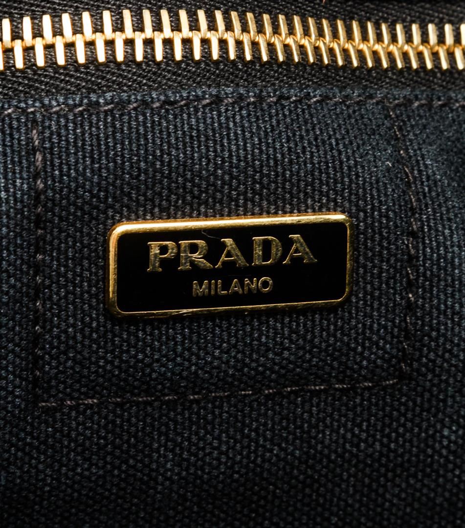 One Prada Dark Blue Canvas Large Canapa Tote Bag. Prada dark blue canvas Canapa tote bag with dual interior zip pockets, interior slip pocket, side snaps, front logo print. MKX