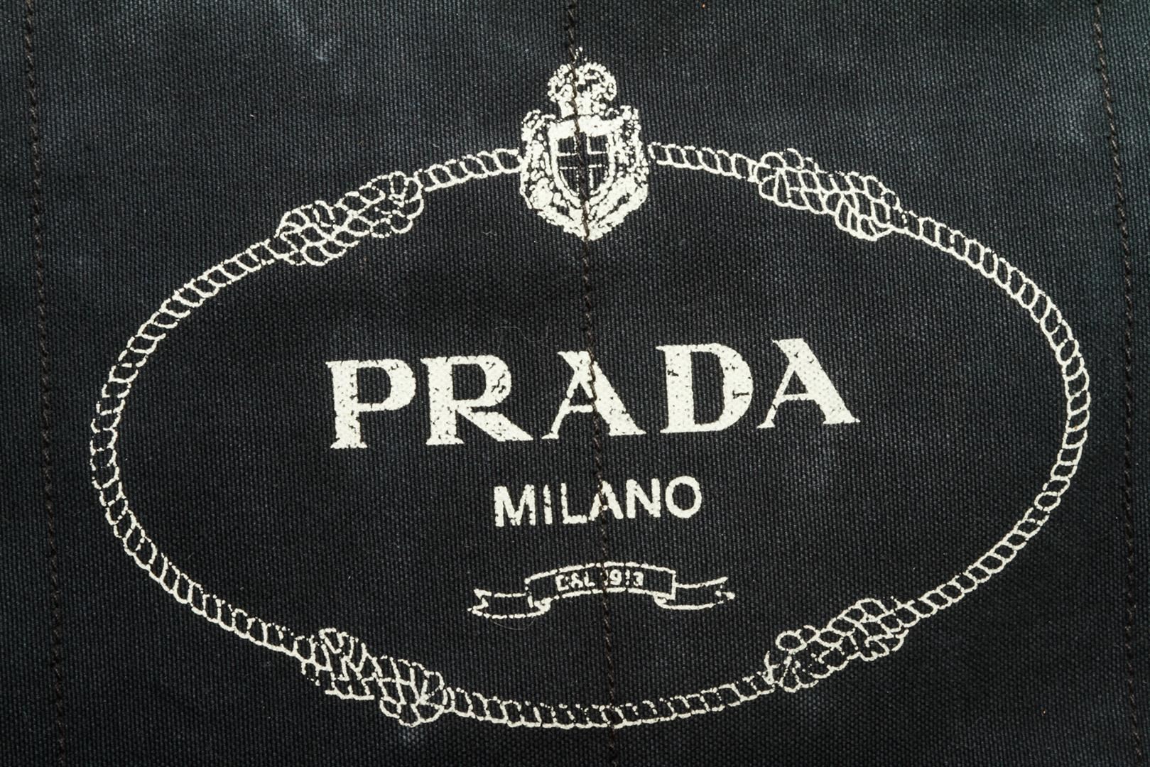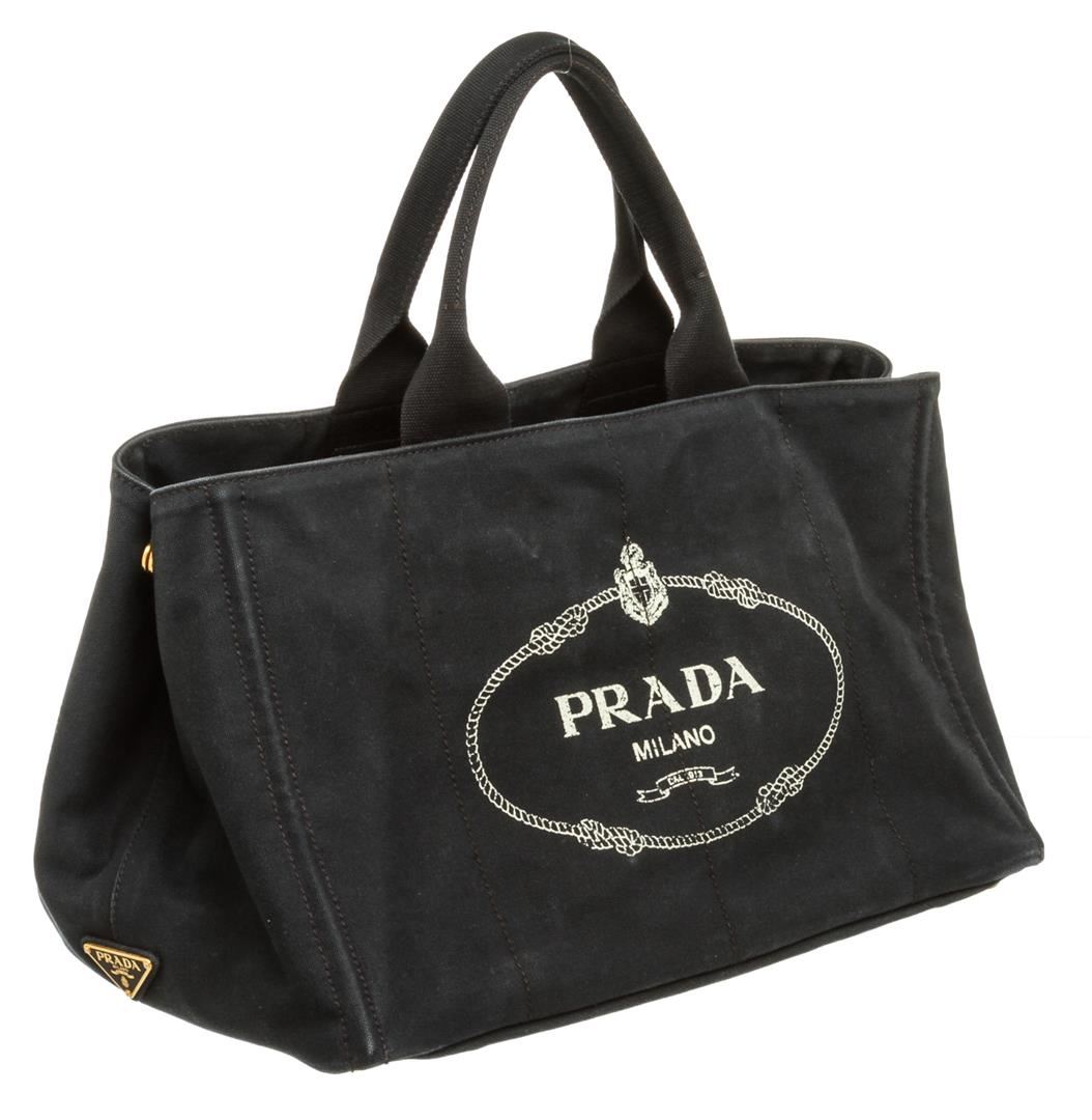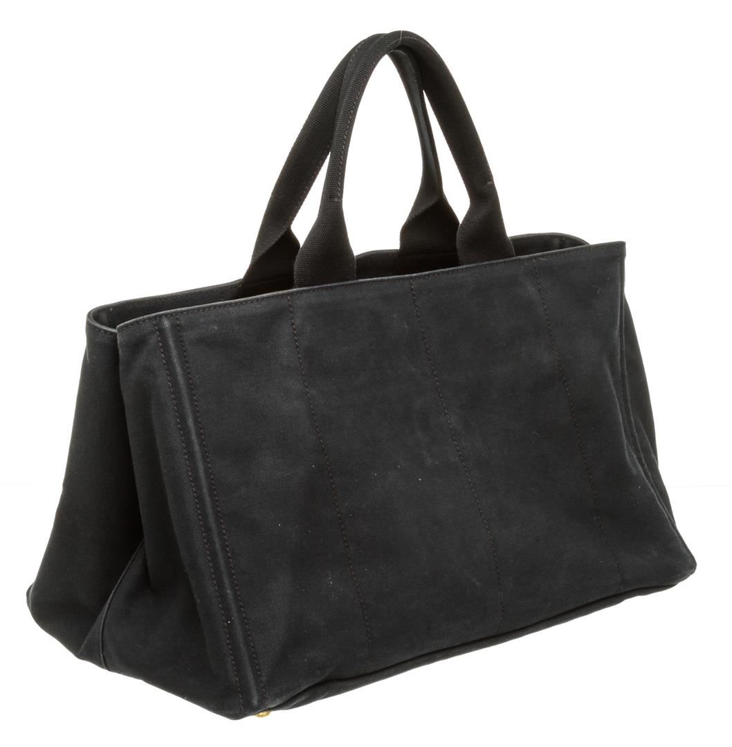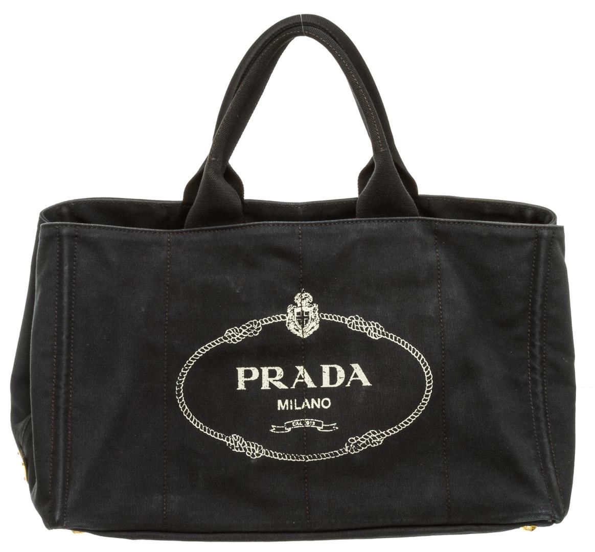 One Prada Dark Blue Canvas Large Canapa Tote Bag. Prada dark blue canvas Canapa tote bag with dual interior zip pockets, interior slip pocket, side snaps, front logo print. MKX