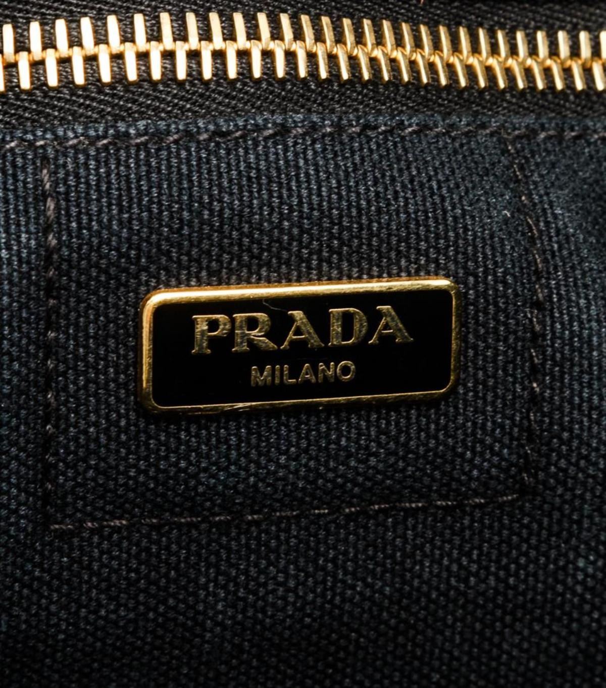 Prada dark blue canvas Canapa tote bag with dual interior zip pockets, interior slip pocket, side snaps, front logo print.