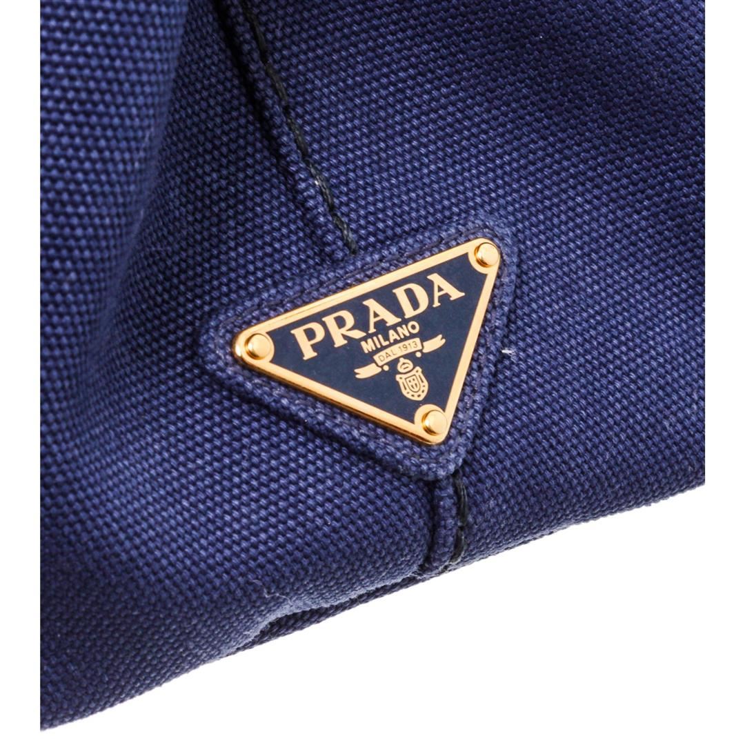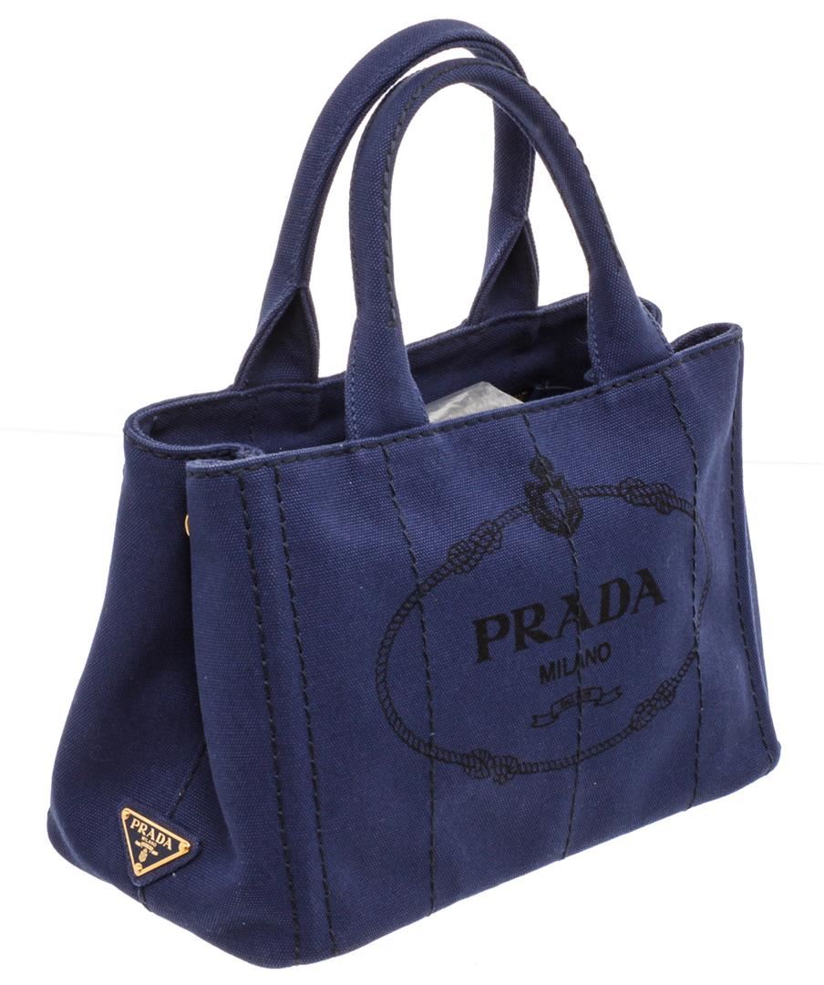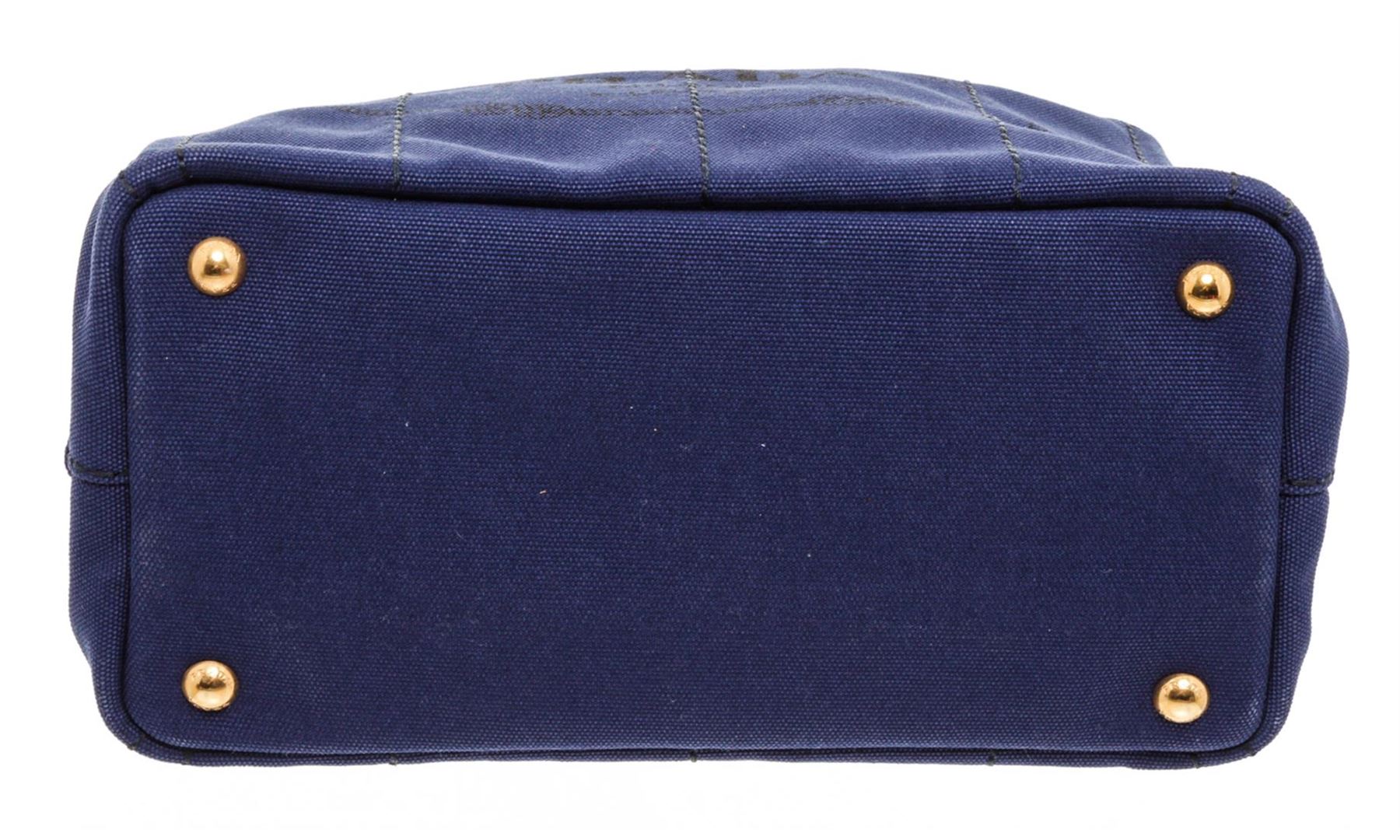 Prada dark blue canvas Canapa tote bag with gold-tone hardware, dual interior zip pockets, interior slip pockets, side snaps, front logo print, optional adjustable shoulder strap. Authentic.