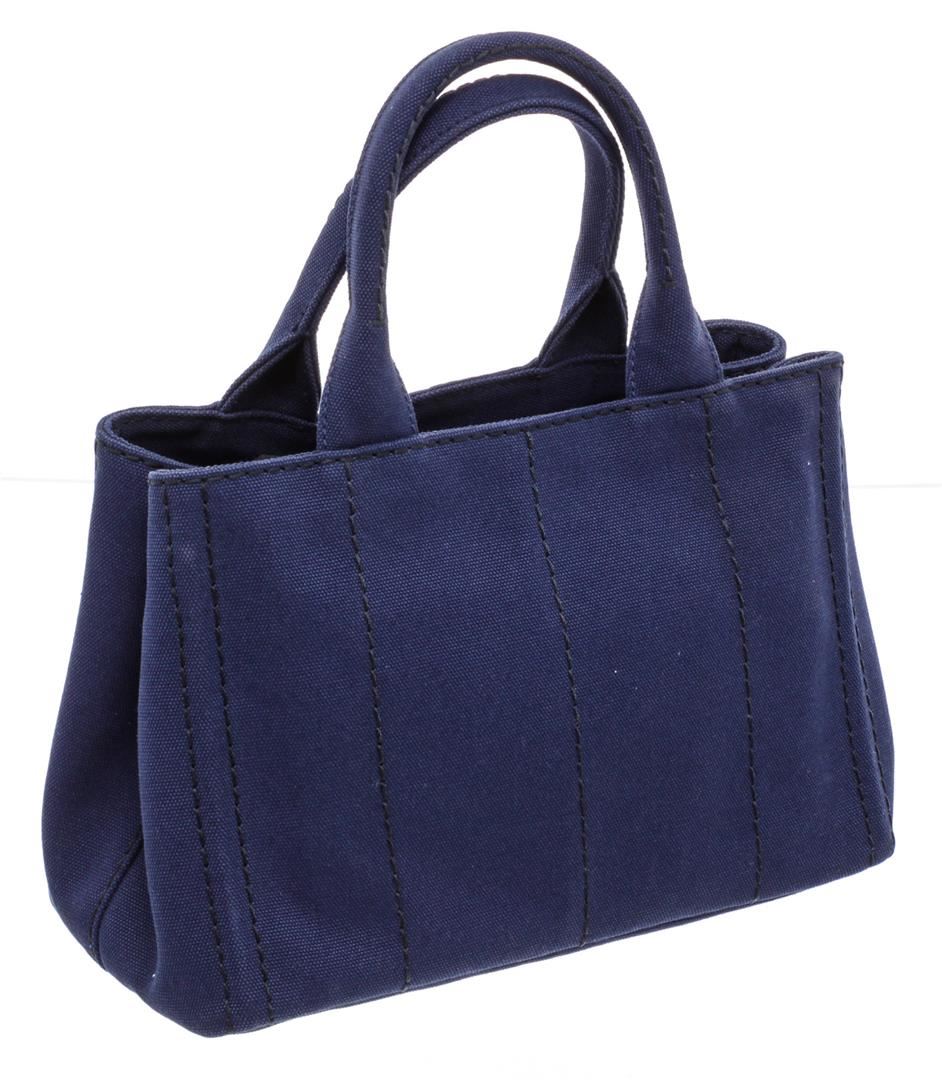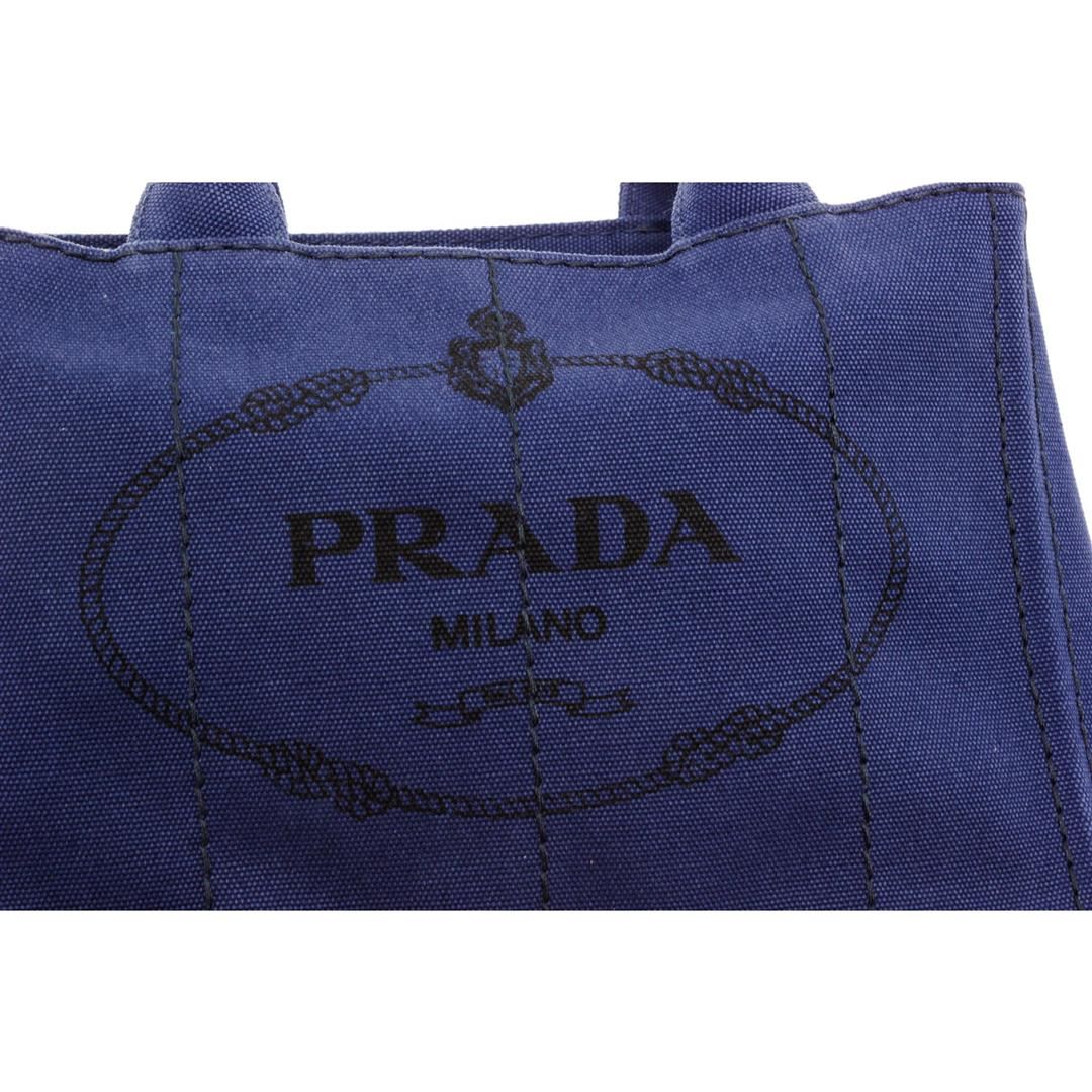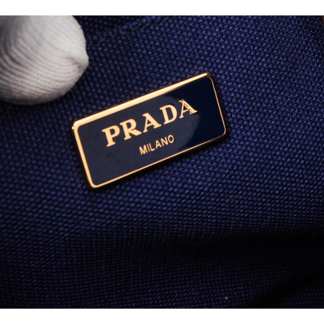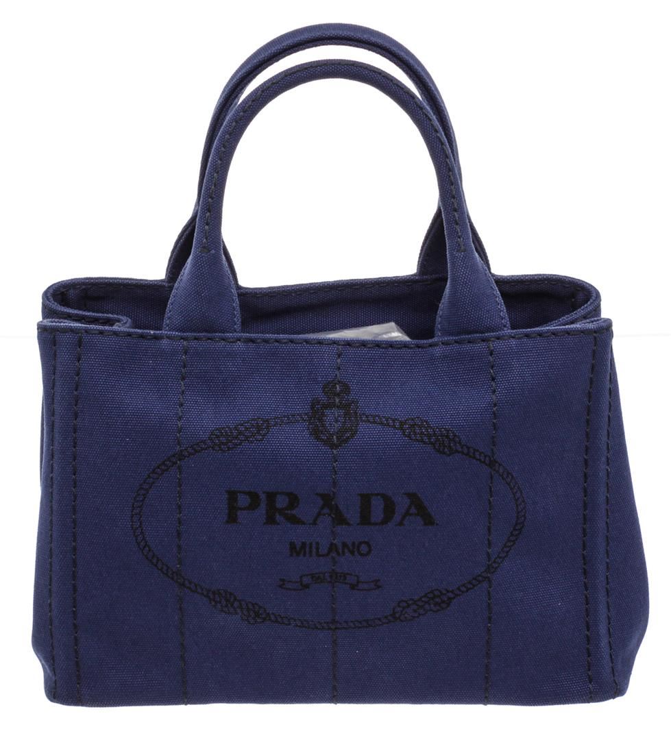 Prada dark blue canvas Canapa tote bag with gold-tone hardware, dual interior zip pockets, interior slip pockets, side snaps, front logo print, optional adjustable shoulder strap. Authentic.