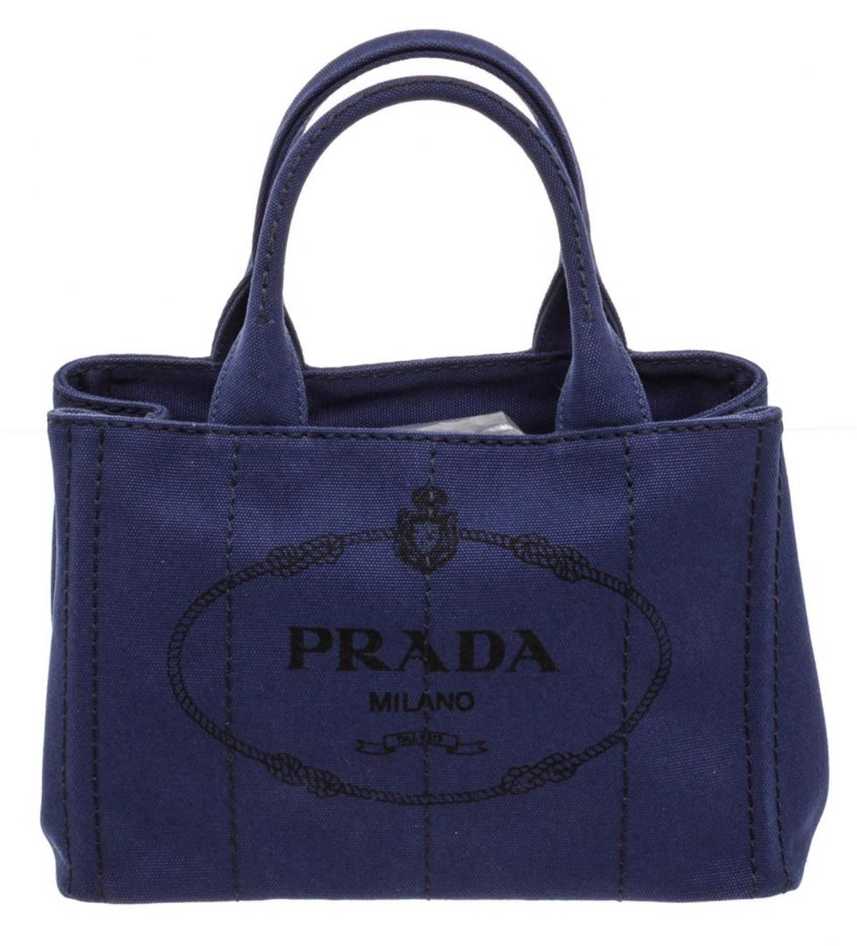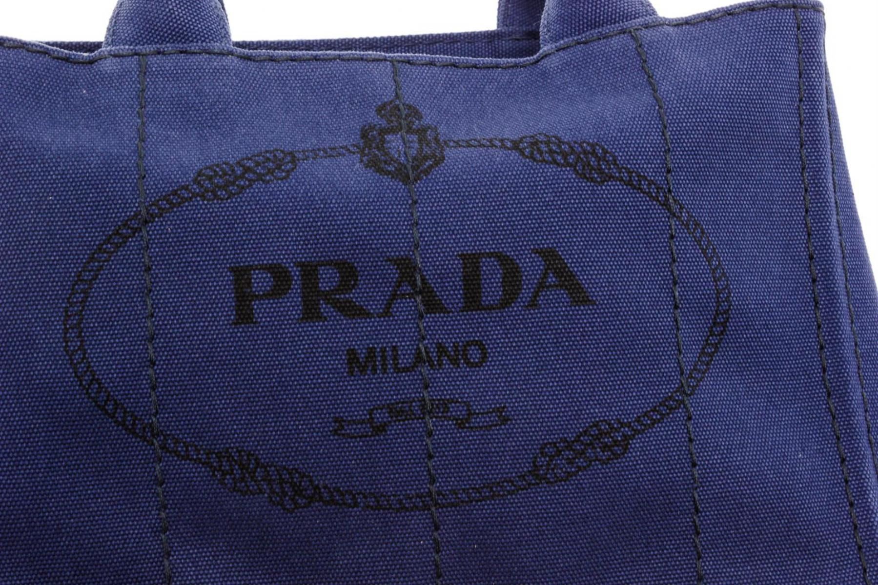One Prada Dark Blue Canvas Small Canapa Tote Bag. Prada dark blue canvas Canapa tote bag with gold-tone hardware, dual interior zip pockets, interior slip pockets, side snaps, front logo print, optional adjustable shoulder strap. MKX