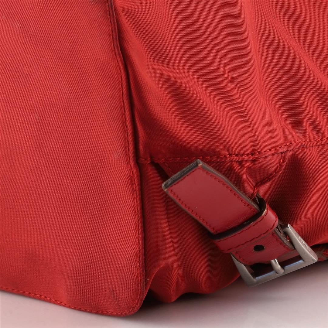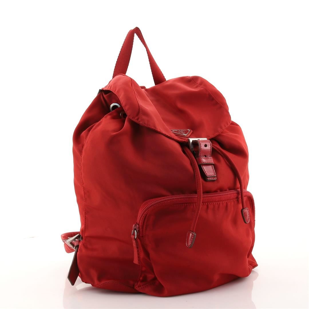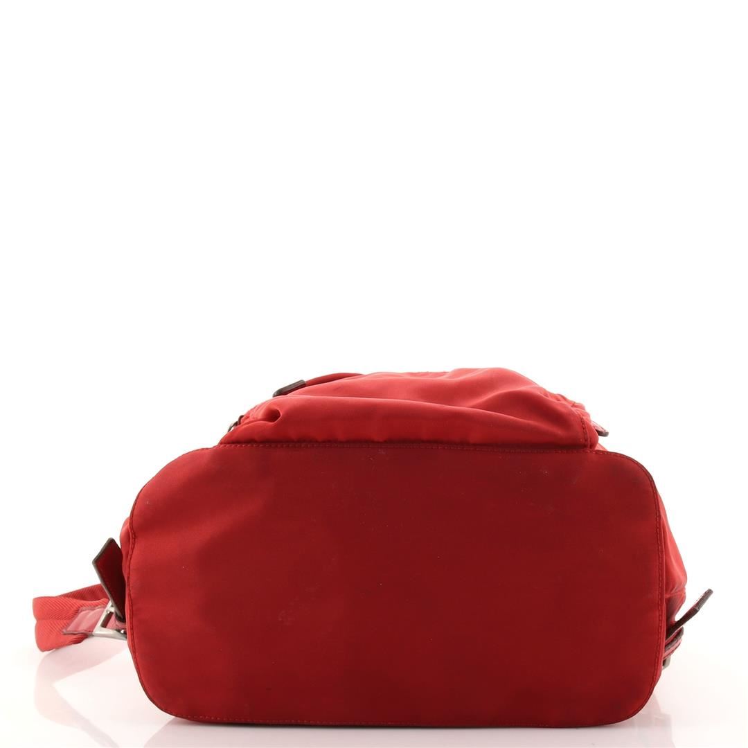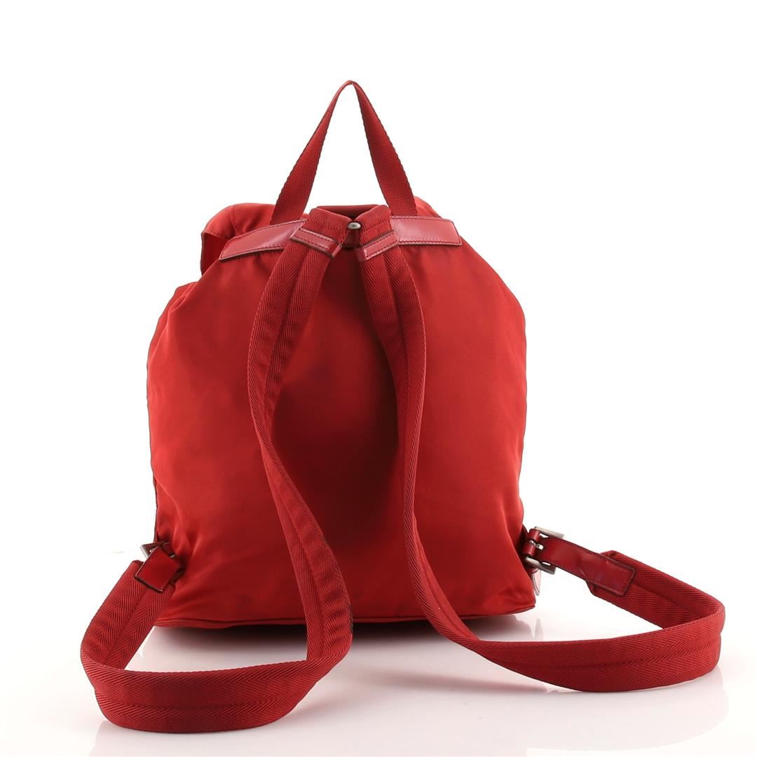 Prada Front Pocket Backpack Tessuto Medium. Odor in interior. Moderate wear, stains and darkening on exterior, creasing on closure and strap leather trims, splitting and peeling on closure and strap leather trim wax edges. Minor wear in interior, scratche