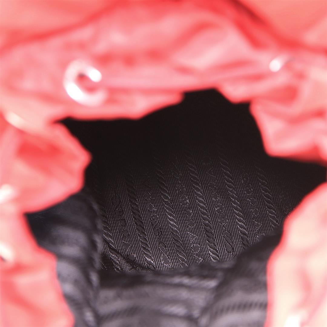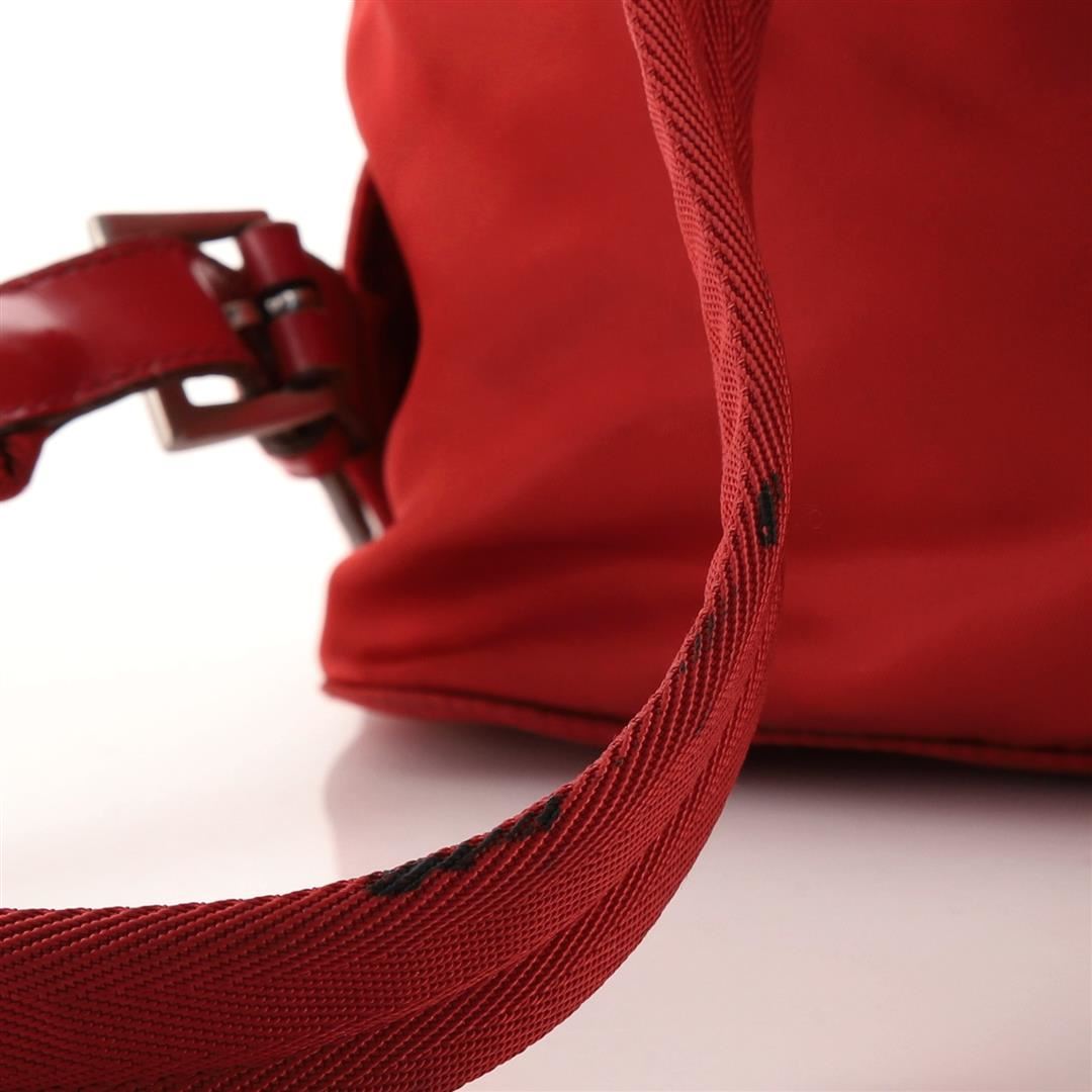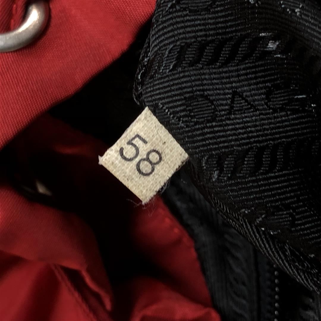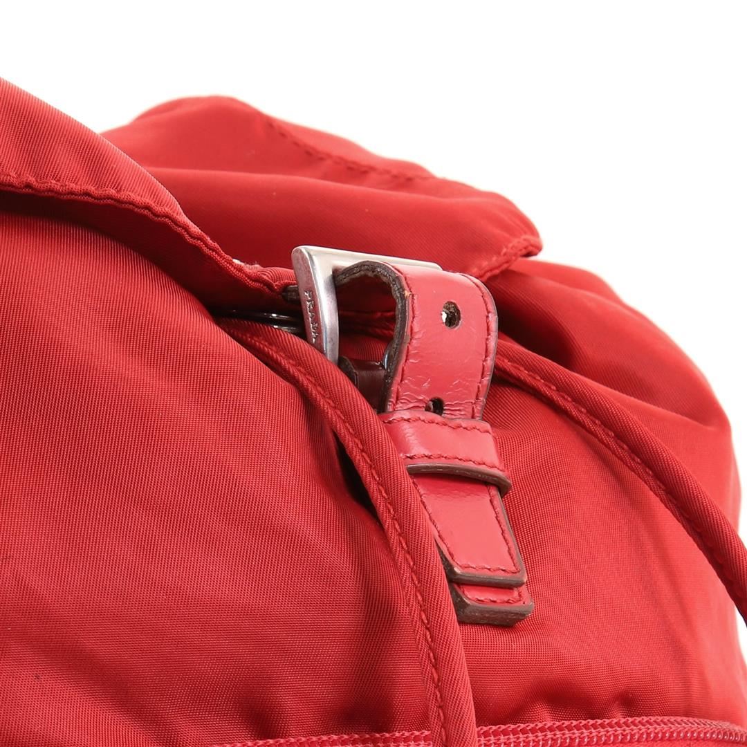 Prada Front Pocket Backpack Tessuto Medium. Odor in interior. Moderate wear, stains and darkening on exterior, creasing on closure and strap leather trims, splitting and peeling on closure and strap leather trim wax edges. Minor wear in interior, scratche