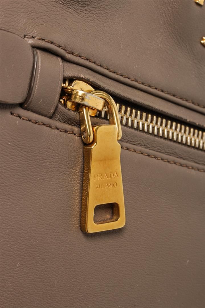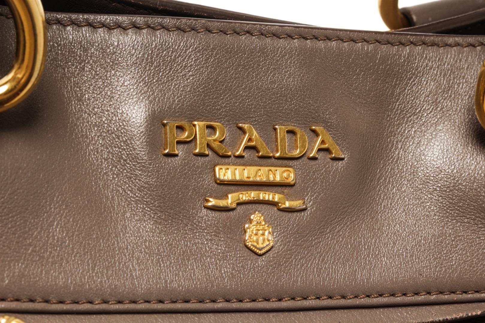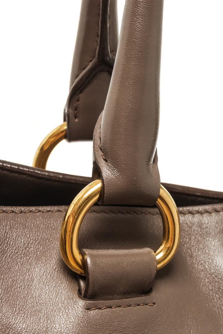One Prada Gray Calf Leather 2Way Satchel Bag. Item is sold AS-IS. All available information is listed in the description and shown in the photo. Prada Gray Calf Leather 2Way Satchel Bag with top handle, detachable adjustable strap, gold tone hardware, exterior zipper pocket, Prada fabric lining, interior Prada lining and magnetic closure. Height: 10.62" Width: 15.74" Depth: 7.87" , Handle Drop: 3.54" / 27 x 40 x 20 Cm