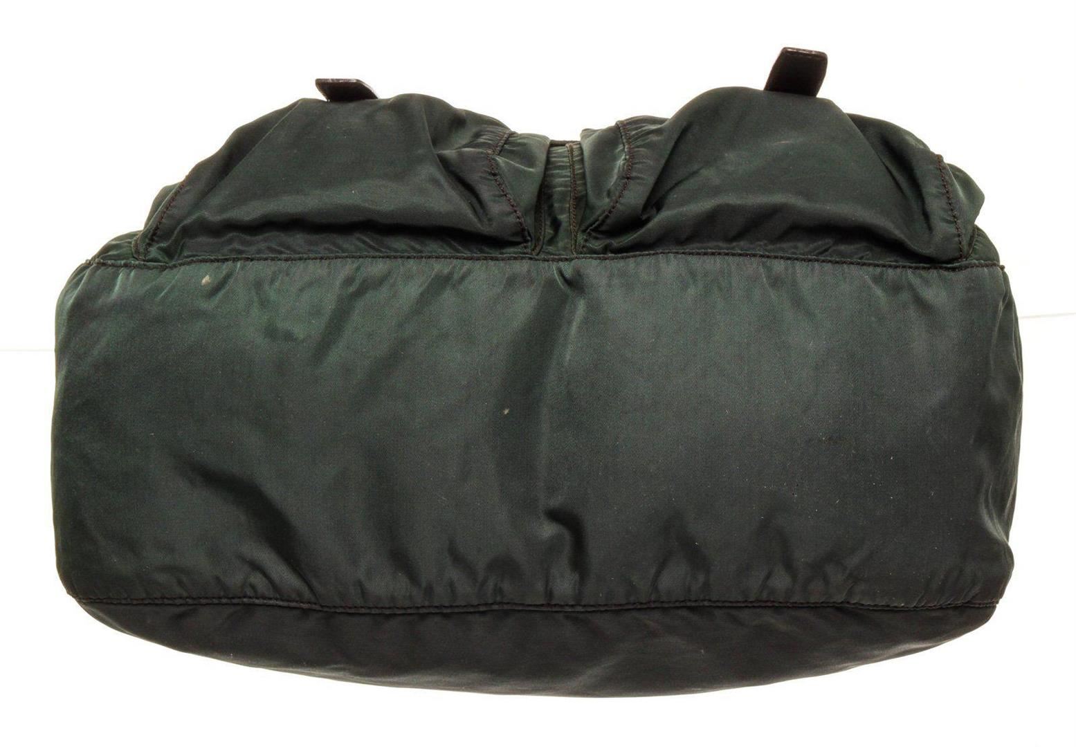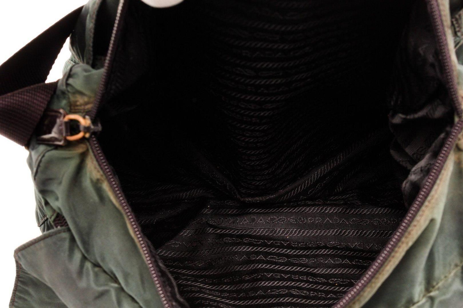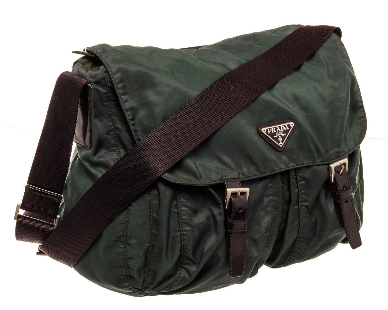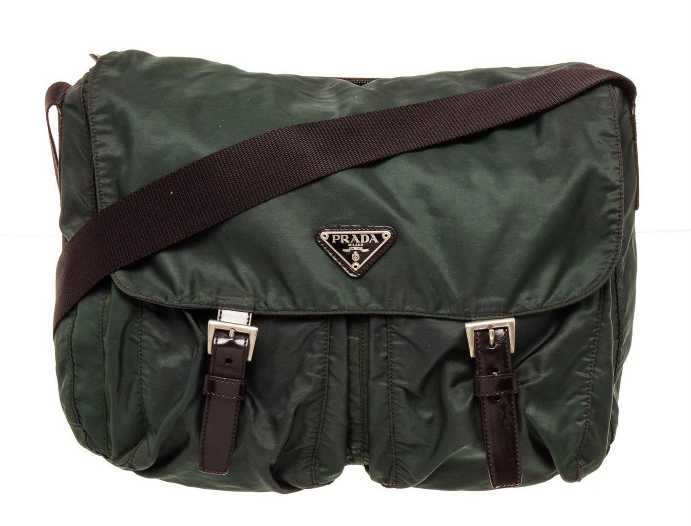 Prada Green Canvas Messenger Shoulder Bag with material canvas, gold-tone hardware, exterior zip pocket, interior slip pocket, shoulder strap and zipper closure.