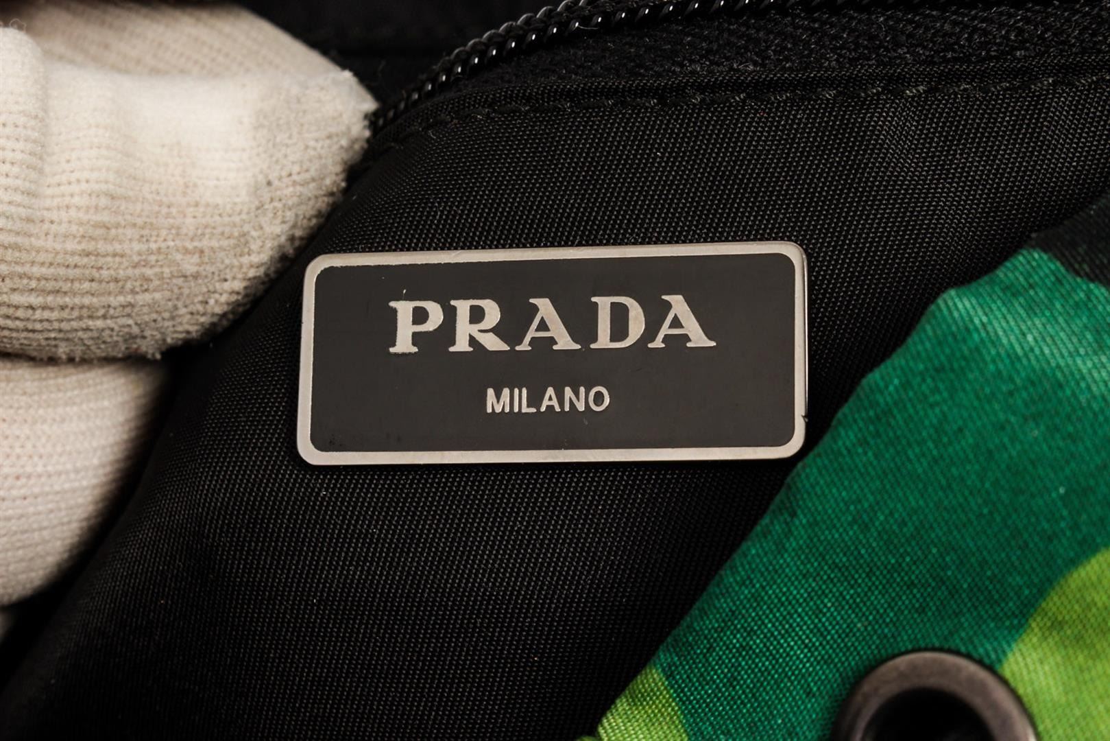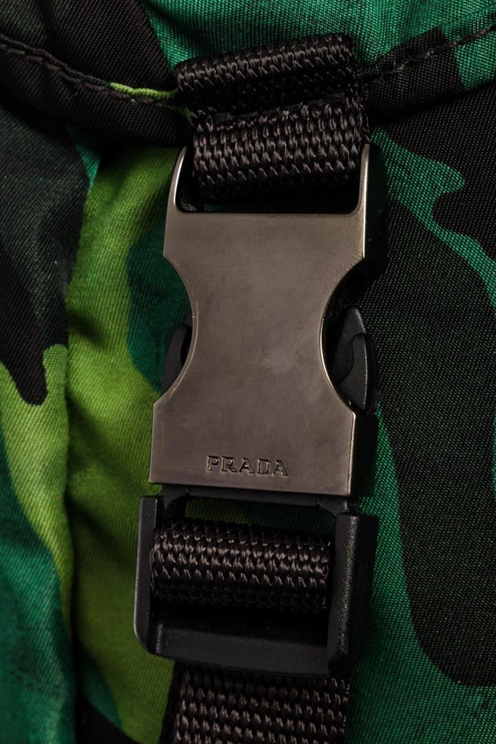 One Prada Green Printed Camo Tessuto Large Front Pocket Double Buckle Backpack. Item is sold AS-IS. All available information is listed in the description and shown in the photo. Prada Large Backpack features green multicolor camouflage Tessuto nylon, black nylon top handle, front pocket with zipper, two black padded shoulder strap that can be adjusted, silver-tone hardware, drawstring closure for the main compartment with flap on top completed with double buckles and black canvas lining. Height 14", Width 10.5", Depth 6", Strap Drop 6-18"