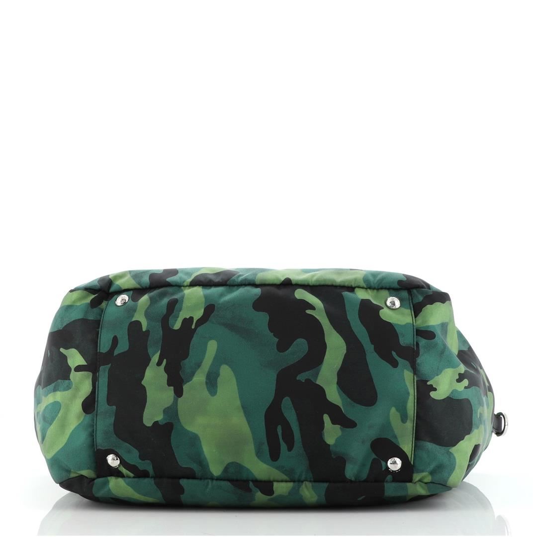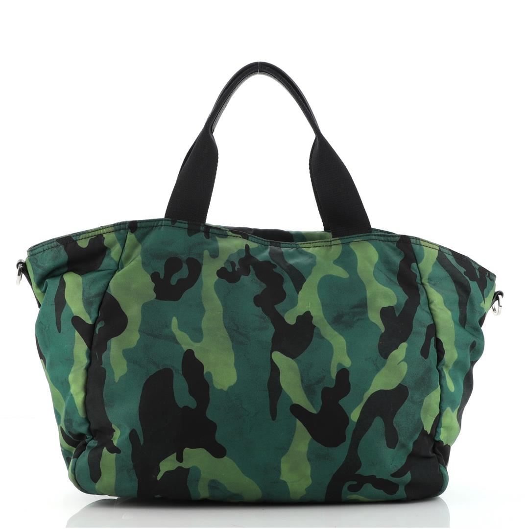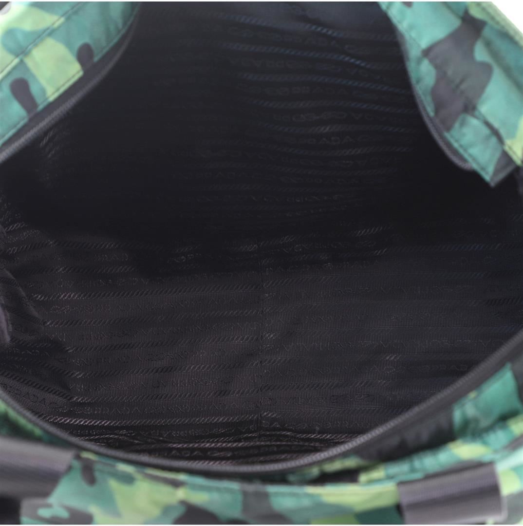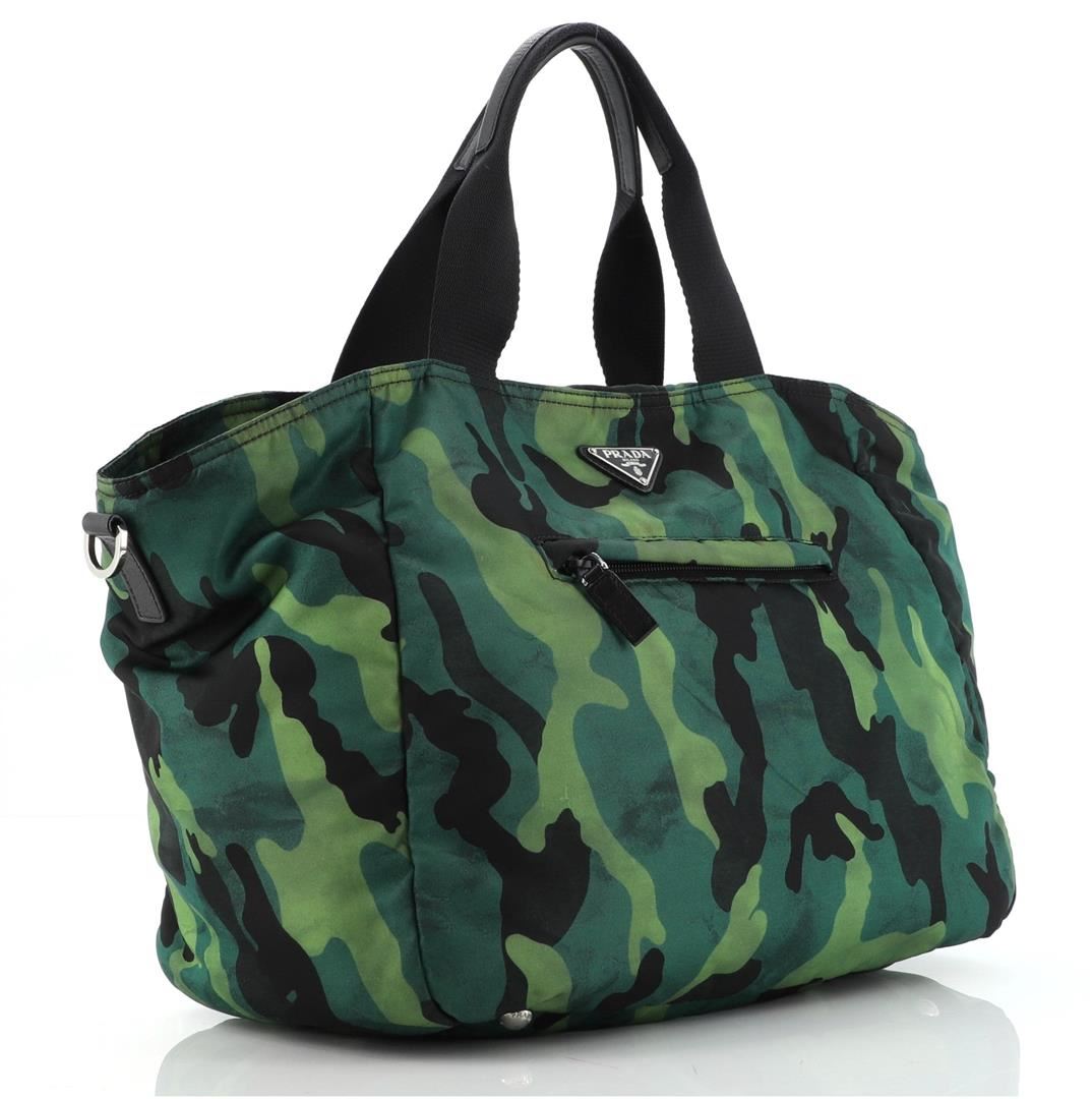 Prada Green Tessuto Print Camouflage Convertible Large Pocket Tote Bag features green Tessuto nylon camouflage print with one external zipped pocket, two black canvas handle covered by black leather, black fabric lining and silver-tone hardware. He