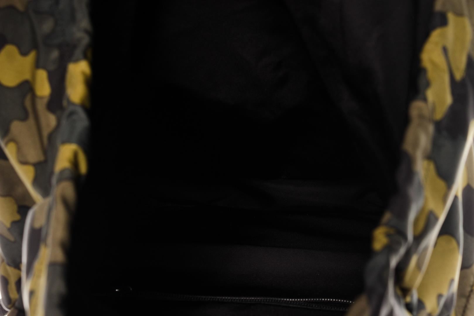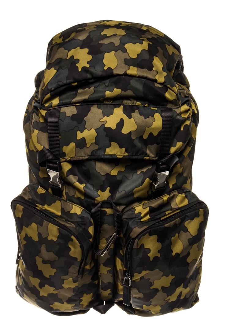 One Prada Green Yellow Multicolor Printed Camo Tessuto Nylon Double Pocket Buckle Large Backpack. Item is sold AS-IS. All available information is listed in the description and shown in the photo. Prada Large Backpack features yellow multicolor camouflage Tessuto nylon with two front zipper pockets with zippers, black nylon top handle, two black padded shoulder strap that can be adjusted, silver-tone hardware, flap over main compartment and black canvas lining. Height 22", Width 13", Depth 6", Strap Drop 8-20"