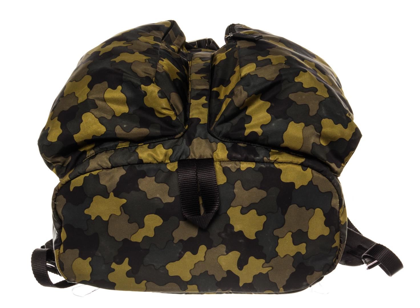 One Prada Green Yellow Multicolor Printed Camo Tessuto Nylon Double Pocket Buckle Large Backpack. Item is sold AS-IS. All available information is listed in the description and shown in the photo. Prada Large Backpack features yellow multicolor camouflage Tessuto nylon with two front zipper pockets with zippers, black nylon top handle, two black padded shoulder strap that can be adjusted, silver-tone hardware, flap over main compartment and black canvas lining. Height 22", Width 13", Depth 6", Strap Drop 8-20"