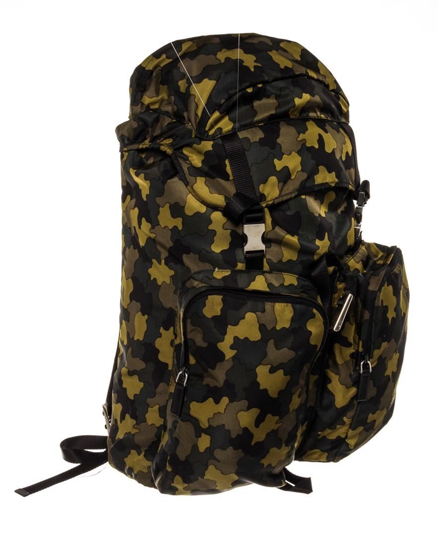 One Prada Green Yellow Multicolor Printed Camo Tessuto Nylon Double Pocket Buckle Large Backpack. Item is sold AS-IS. All available information is listed in the description and shown in the photo. Prada Large Backpack features yellow multicolor camouflage Tessuto nylon with two front zipper pockets with zippers, black nylon top handle, two black padded shoulder strap that can be adjusted, silver-tone hardware, flap over main compartment and black canvas lining. Height 22", Width 13", Depth 6", Strap Drop 8-20"