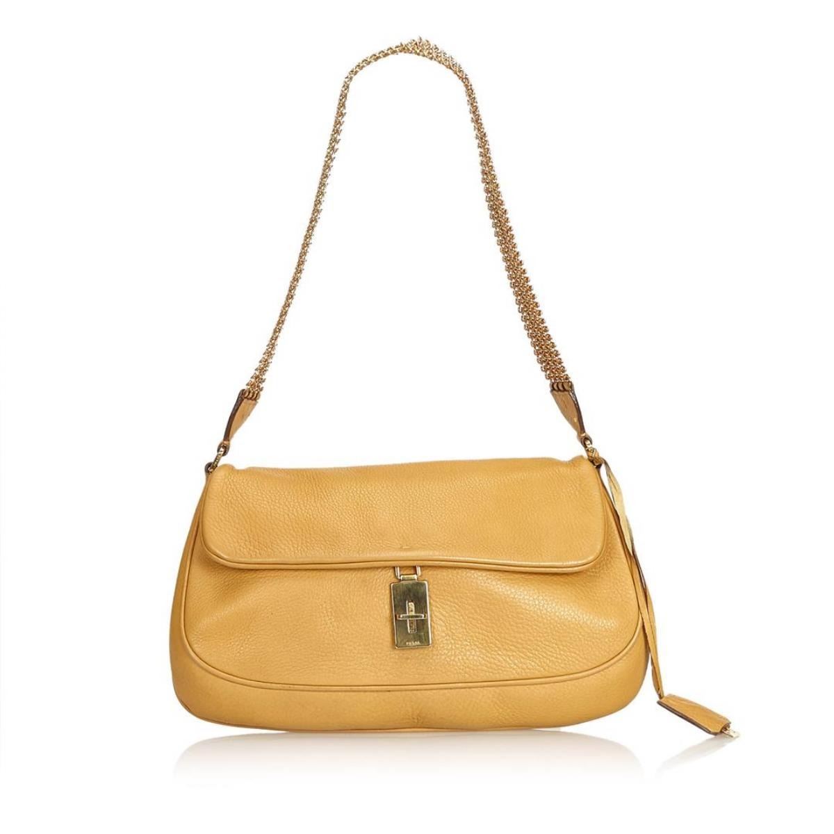 One Prada Leather Chain Shoulder Bag. This shoulder bag features a leather body, chain straps, top flap with twist lock closure, exterior slip pocket, and interior zip pocket.