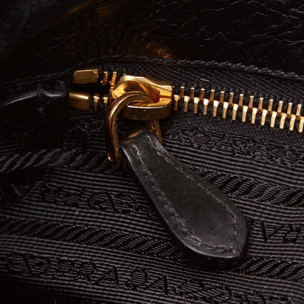One Prada Leather Handbag. This handbag features a leather body, flat leather handle, top magnetic closure, and interior zip pocket.