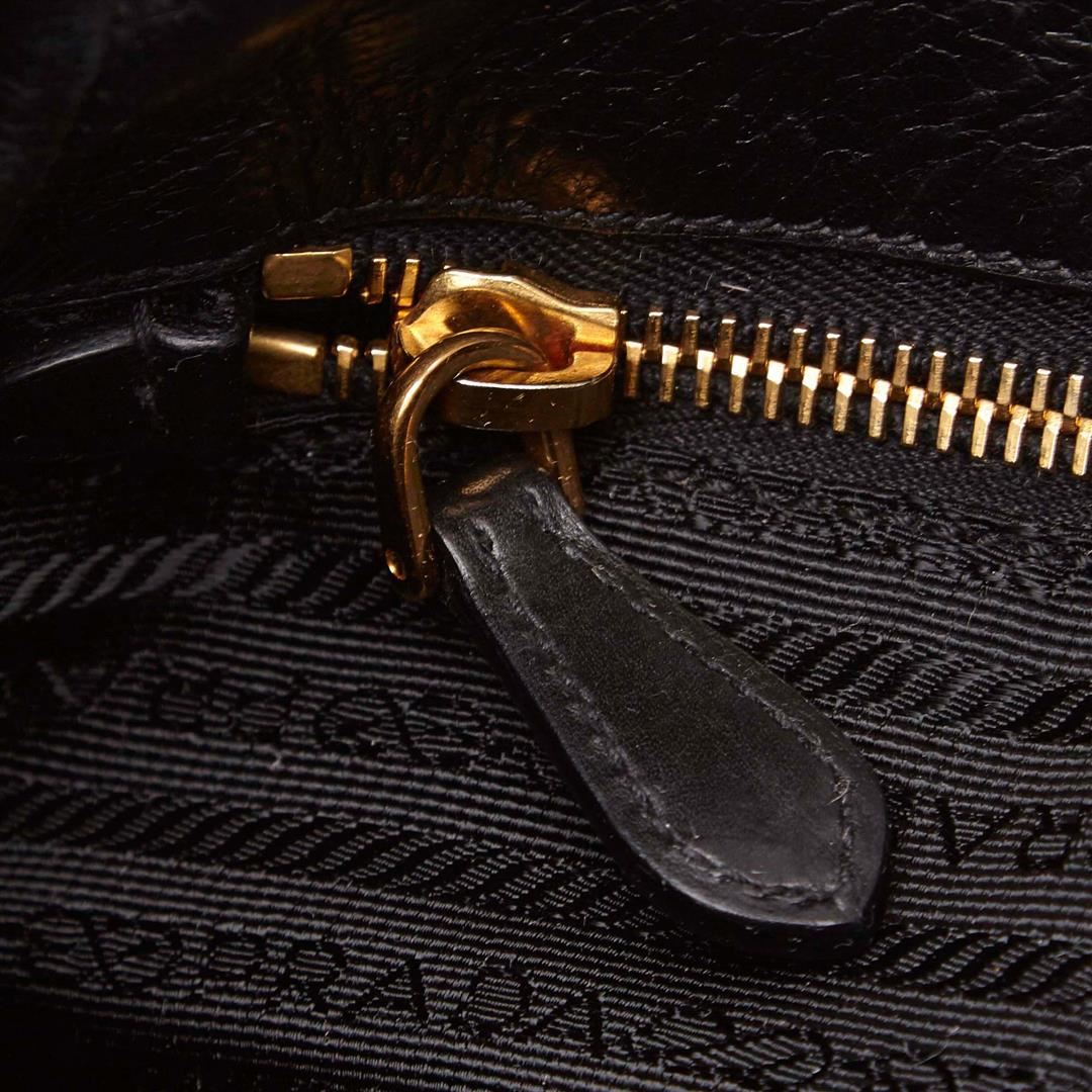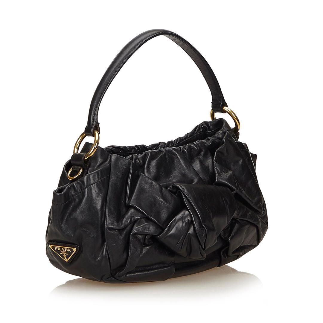 One Prada Leather Handbag. This handbag features a leather body, flat leather handle, top magnetic closure, and interior zip pocket.