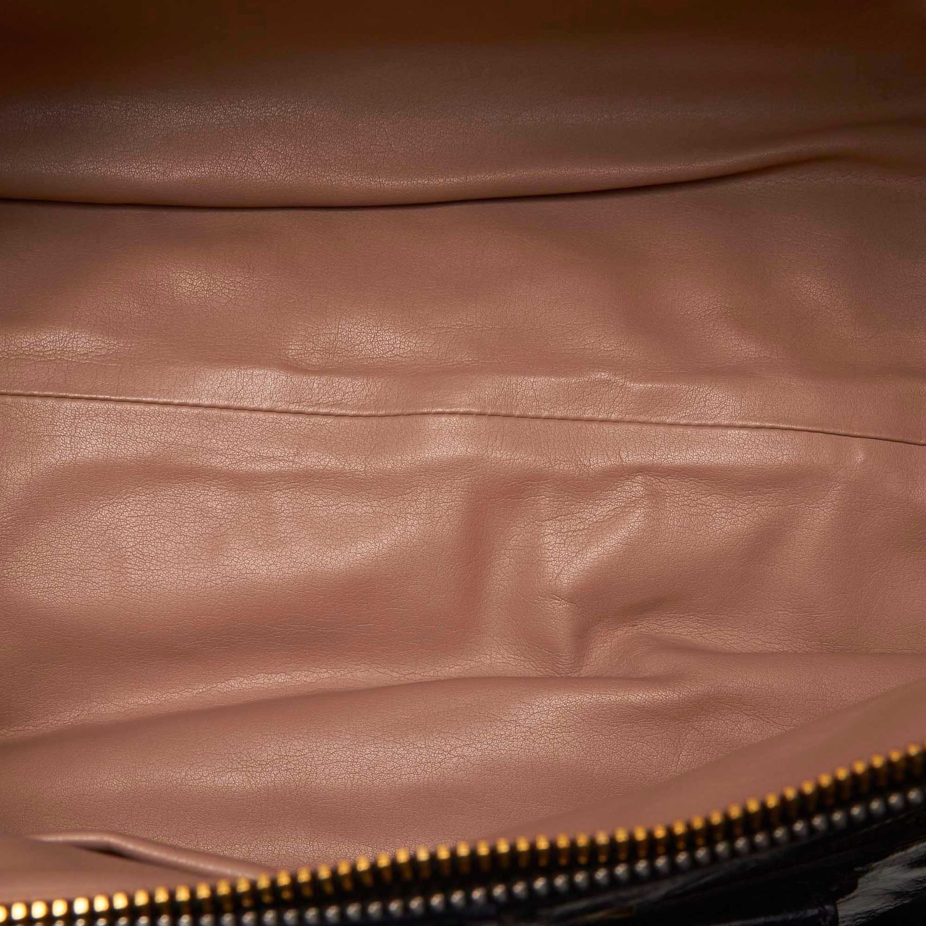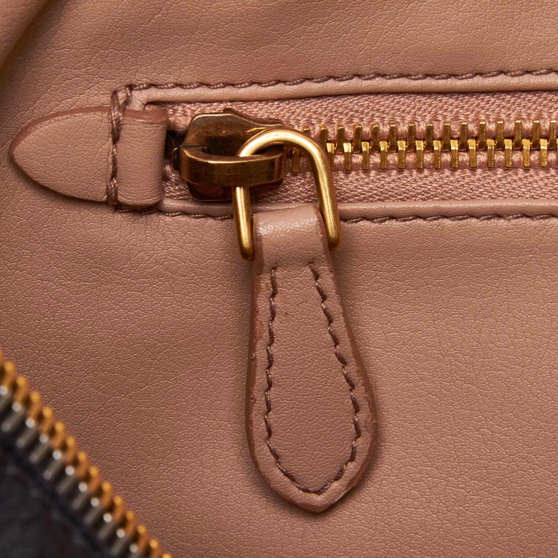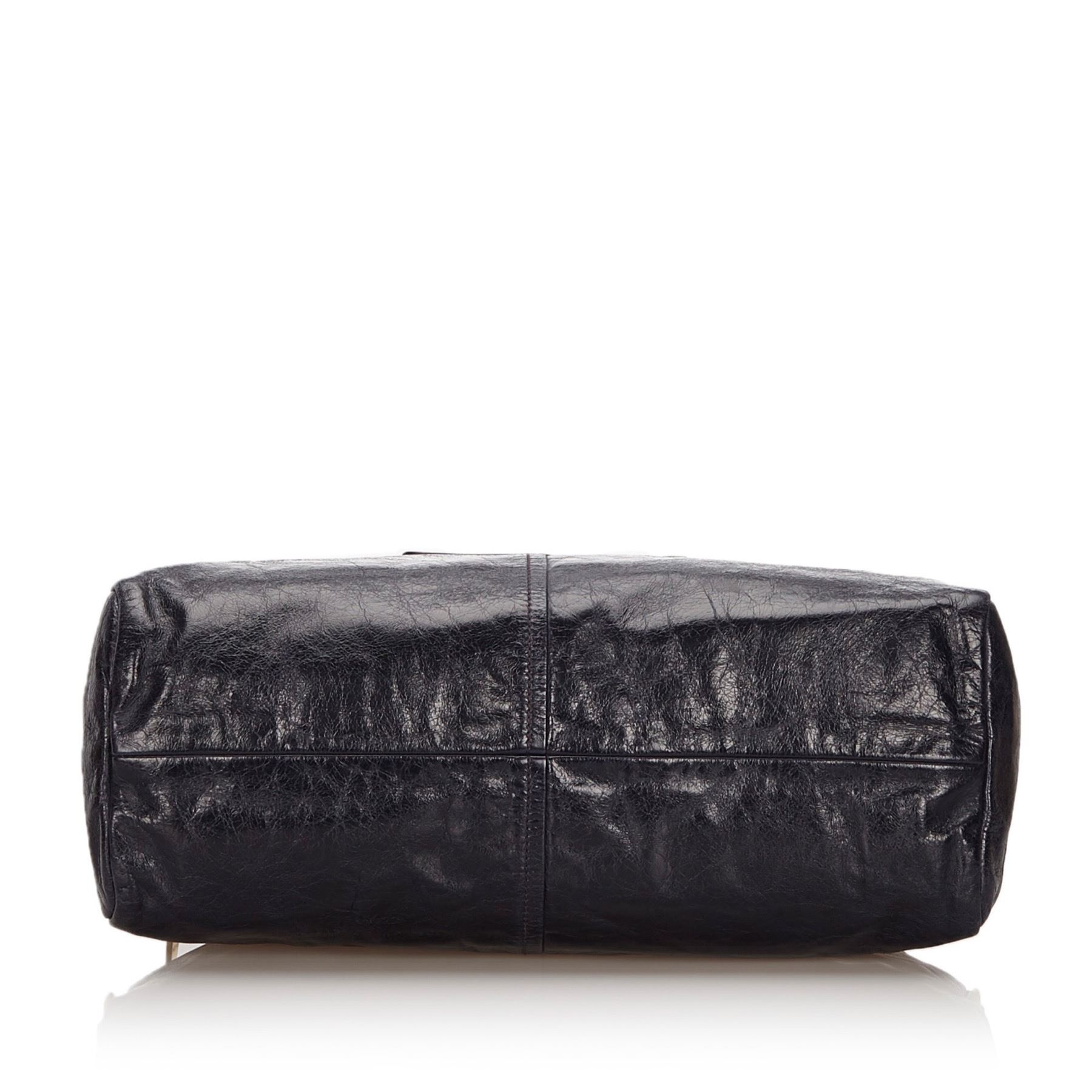 This satchel features a leather body, a front exterior zip pocket, rolled leather handles, a detachable flat leather strap, a top zip closure, and interior zip and slip pockets. Leather x Others Blue x Navy Exterior front is out of shape and scratched. Exterior back is out of shape and scratched. Exterior handle is scratched. Exterior pocket is stained and scratched. Exterior corners is scratched. Exterior side is out of shape and scratched. Interior lining is stained. Interior pocket is stained. Zipper is scratched. Studs is scratched. Lock is scratched. Size: 24 x 38 x 13 Card: NO Made in: Italy
