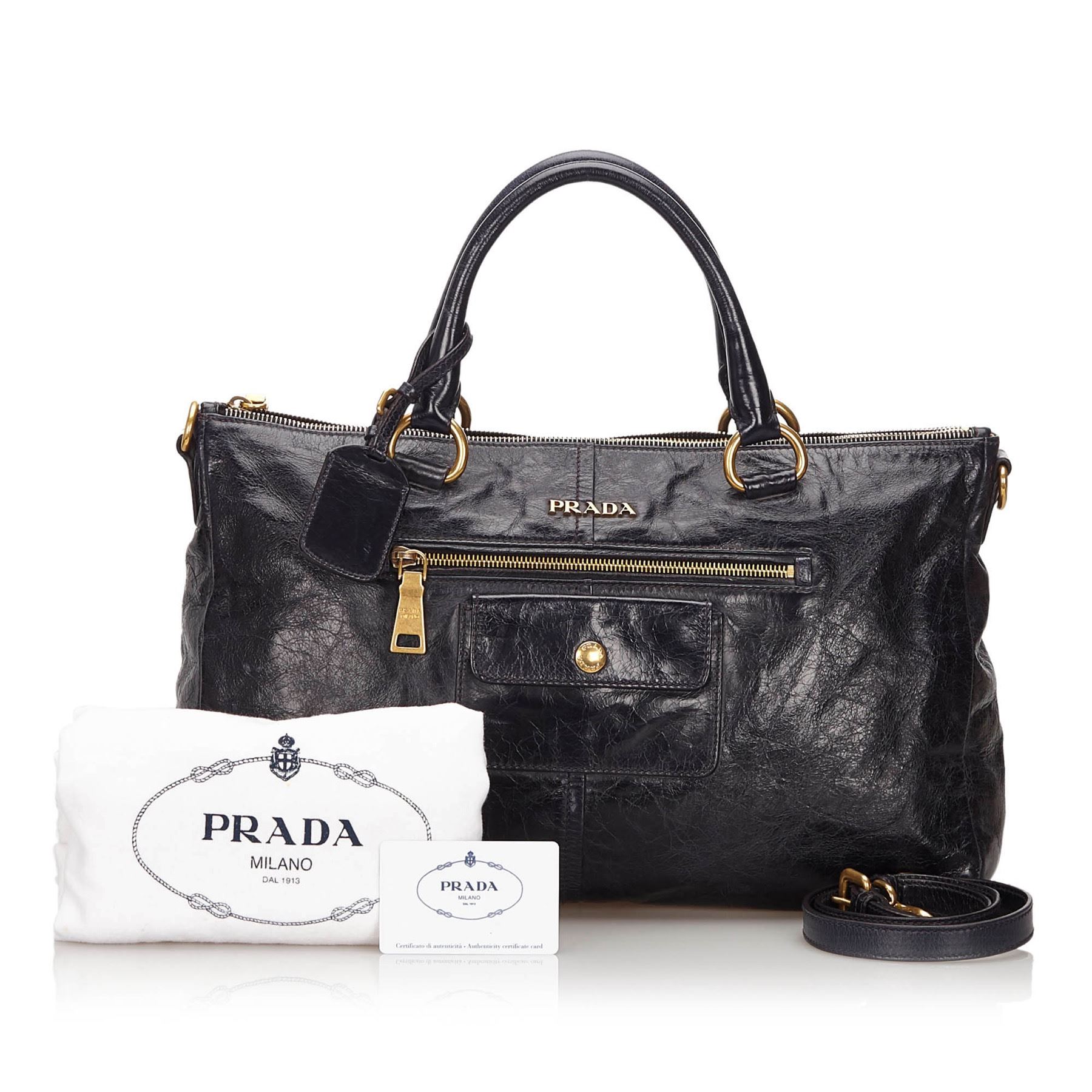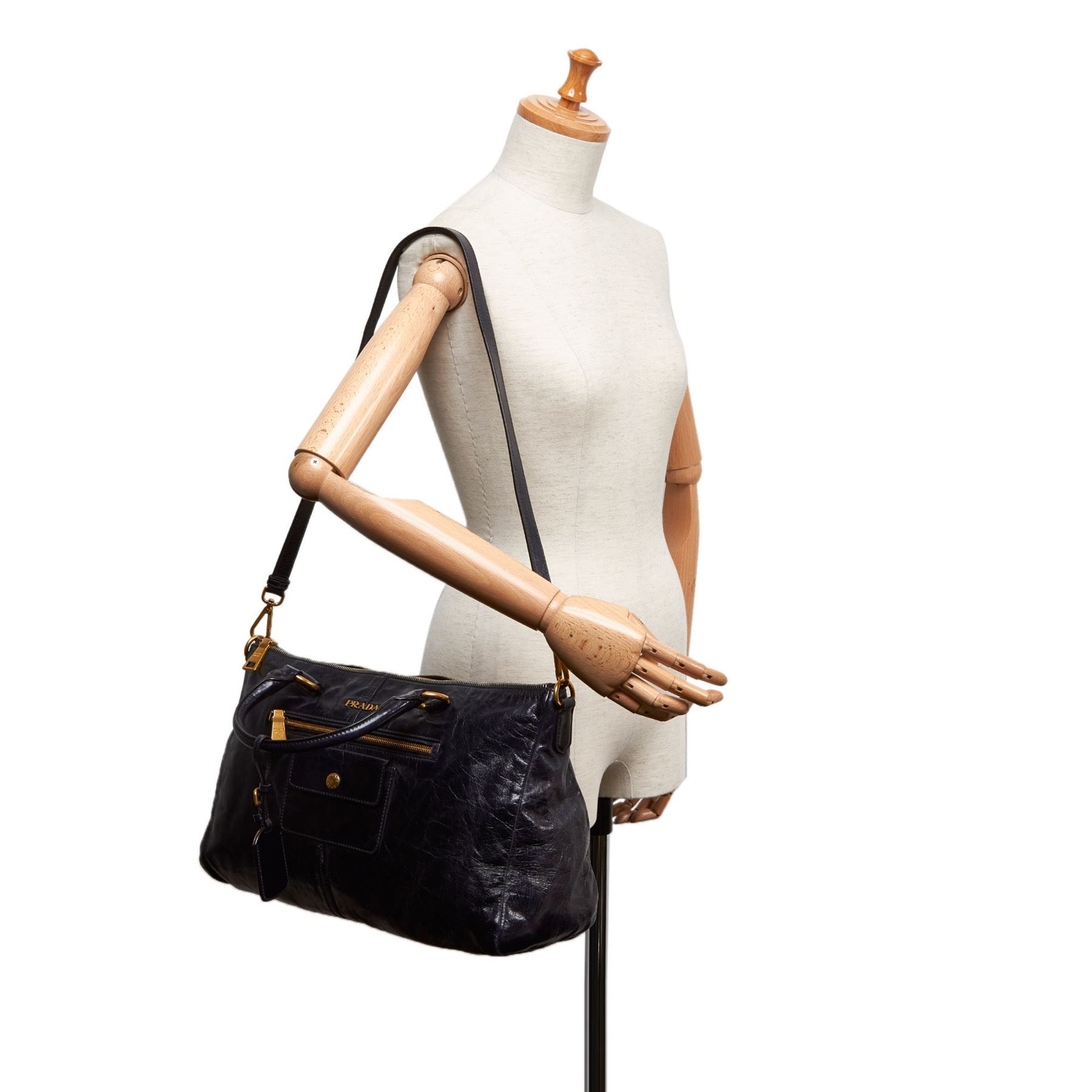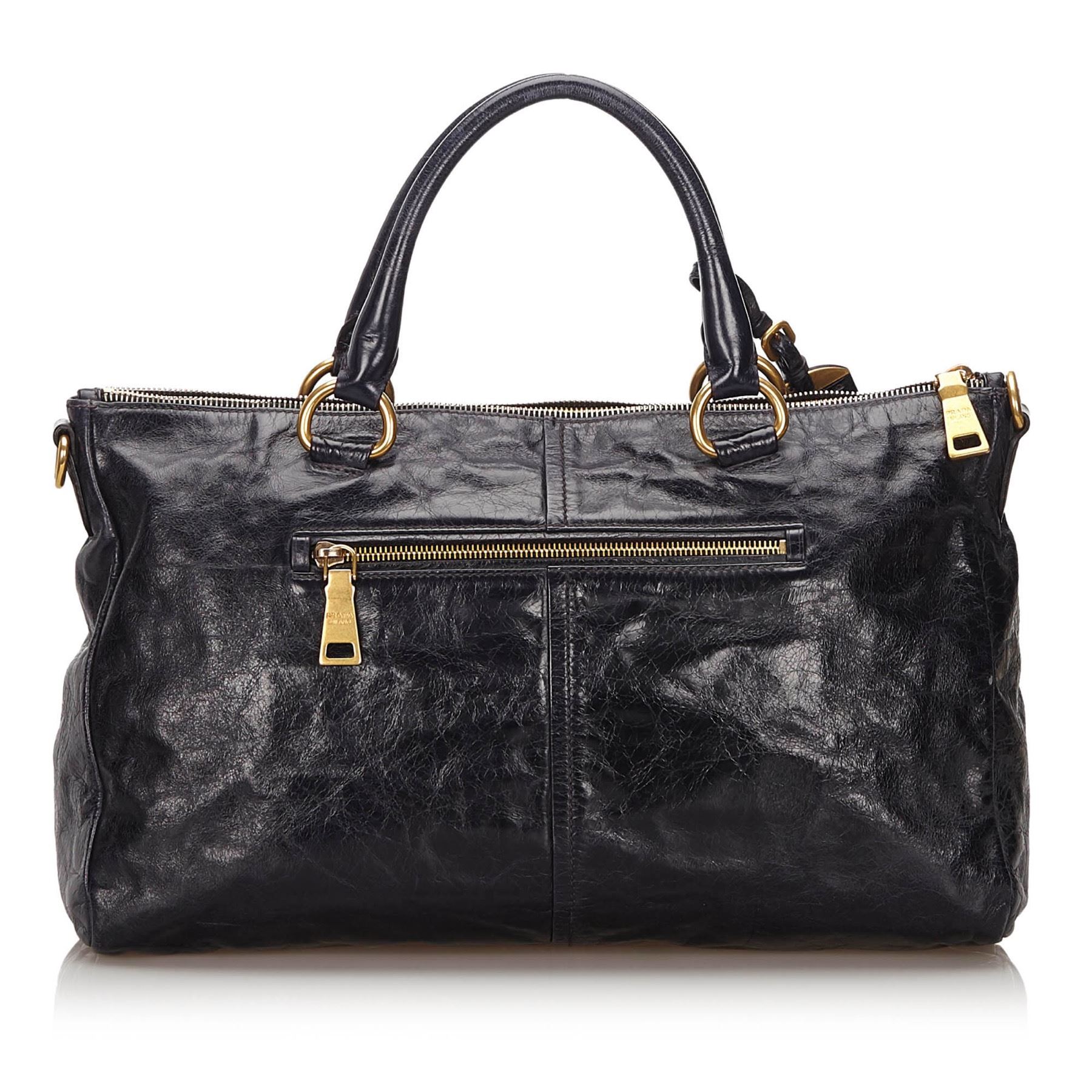 This satchel features a leather body, a front exterior zip pocket, rolled leather handles, a detachable flat leather strap, a top zip closure, and interior zip and slip pockets. Leather x Others Blue x Navy Exterior front is out of shape and scratched. Exterior back is out of shape and scratched. Exterior handle is scratched. Exterior pocket is stained and scratched. Exterior corners is scratched. Exterior side is out of shape and scratched. Interior lining is stained. Interior pocket is stained. Zipper is scratched. Studs is scratched. Lock is scratched. Size: 24 x 38 x 13 Card: NO Made in: Italy