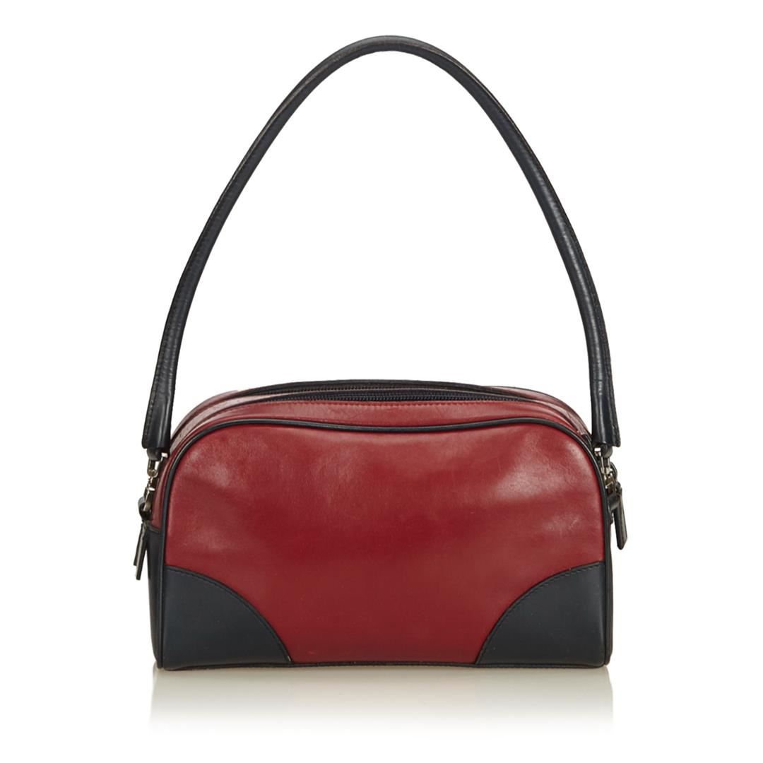 One Prada Leather Shoulder Bag. This shoulder bag features a leather body, rolled leather handle, dual compartments with top zip closures, and an interior zip pocket.