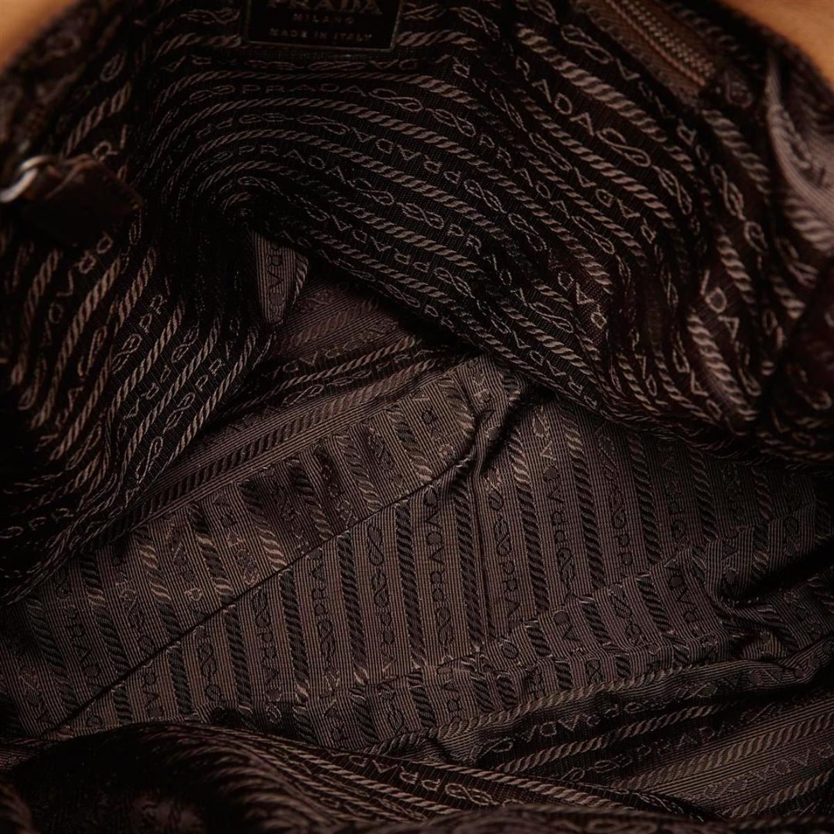 One Prada Leather Shoulder Bag. This shoulder bag features a leather body, a flat shoulder strap, an open top, and an interior zip pocket.