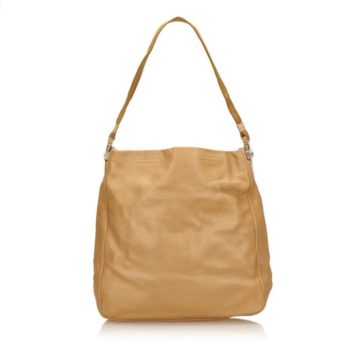 One Prada Leather Shoulder Bag. This shoulder bag features a leather body, a flat shoulder strap, an open top, and an interior zip pocket.