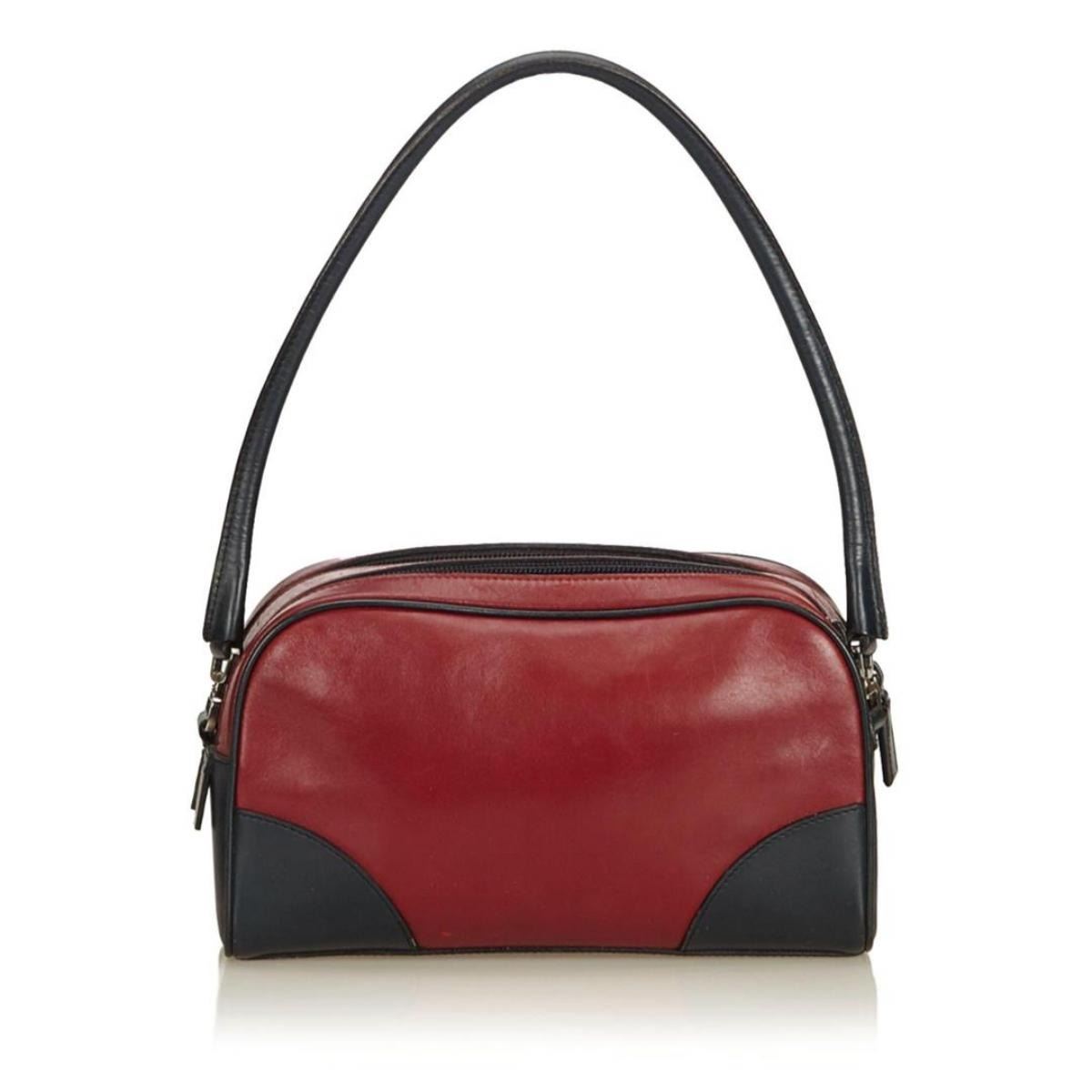 This shoulder bag features a leather body, rolled leather handle, dual compartments with top zip closures, and an interior zip pocket. Measurements: Length: 14 in / 36 cm Width: 23.5 in / 60 cm 7.5 in / 19 cmCONDITION: Pre-Owned Good overall, please see photographs for detail.