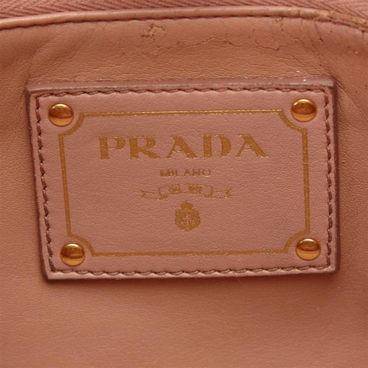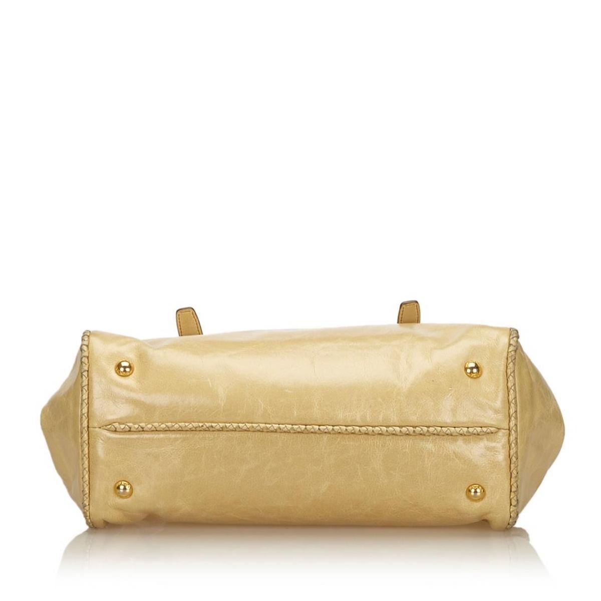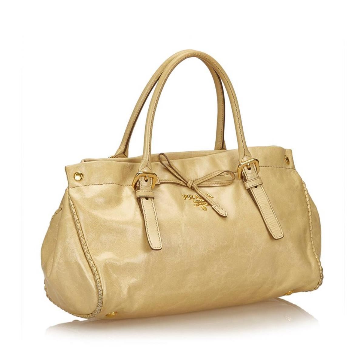 One Prada Leather Tote Bag. This tote bag features a leather body, rolled leather handles, button clasp closure, and interior zip and slip pocket.